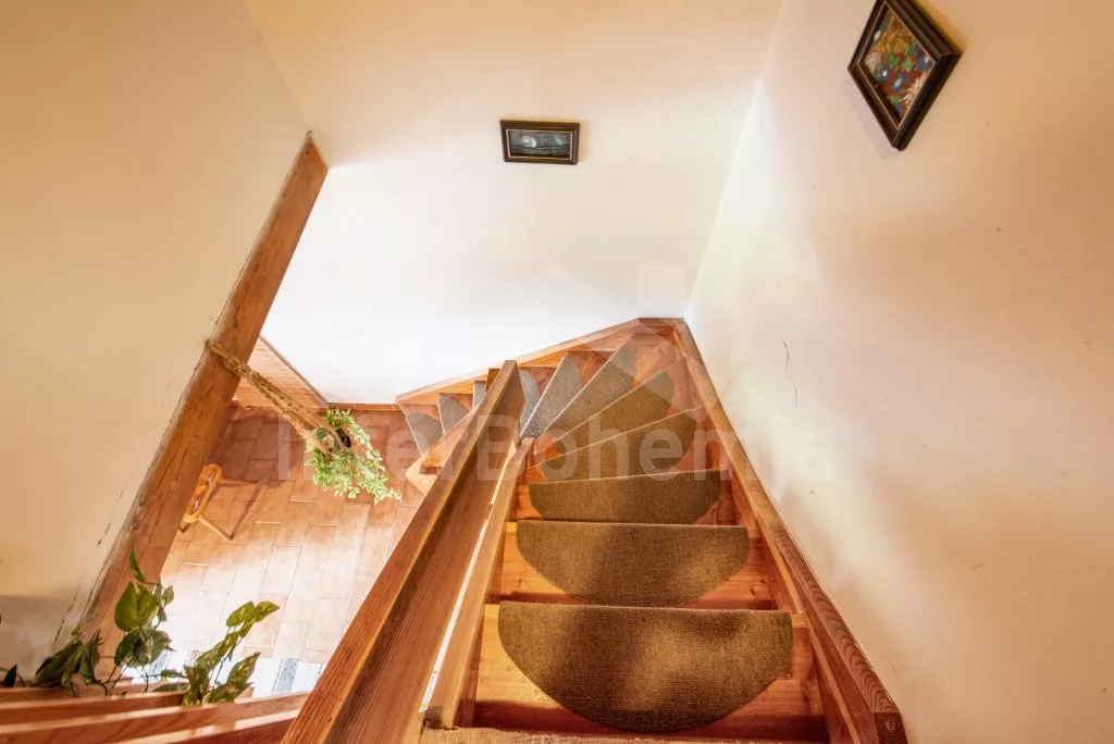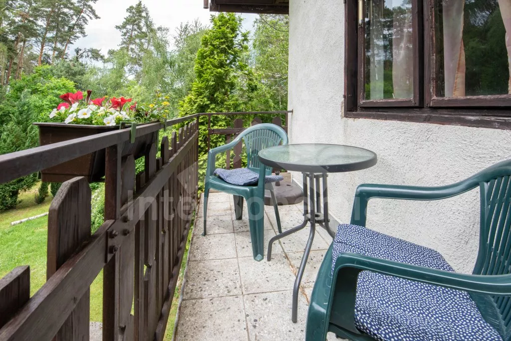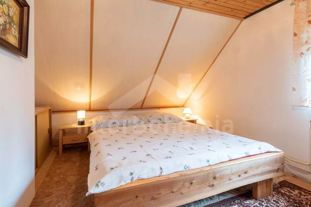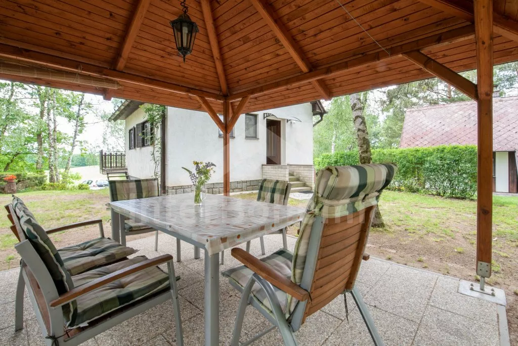 Volně stojící chata, útulně zařízená. Vstup, chodba, obývací pokoj s pohovkou, jídelním koutem, krbem, televizí a vstupem na balkón. Kuchyňka s elektrickým sporákem s keramickou varnou deskou, lednicí, kávovarem, varnou konvicí a mikrovlnnou troubou. Koupelna se sprchou, samostatná toaleta. V patře se nachází hala a dvě ložnice – jedna s dvojlůžkem a druhá s dvojlůžkem a dvěma válendami. Vytápění krbem a centrální vytápění kotlem na dřevo. Zahrada není oplocená, k dispozici je zastřešená terasa, zahradní nábytek, přenosný gril, ohniště, pískoviště a houpačka. Vlastní parkoviště.