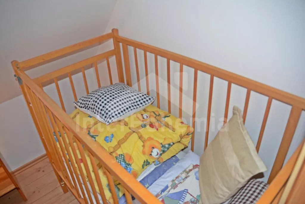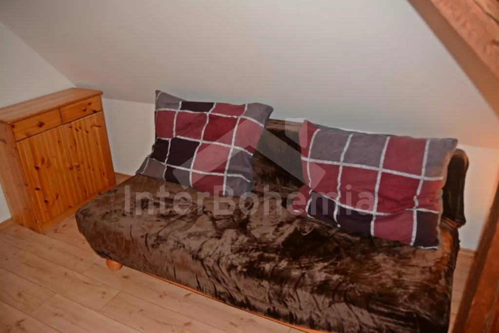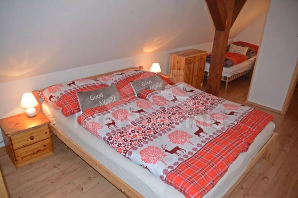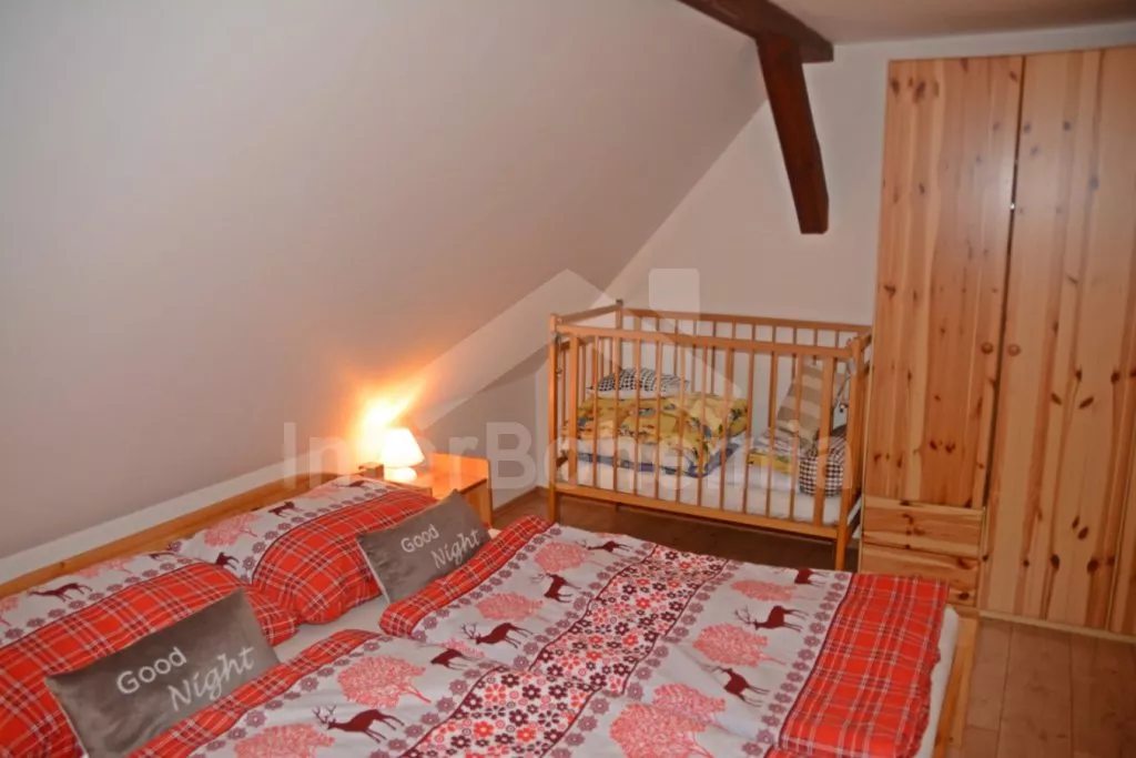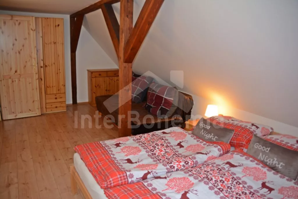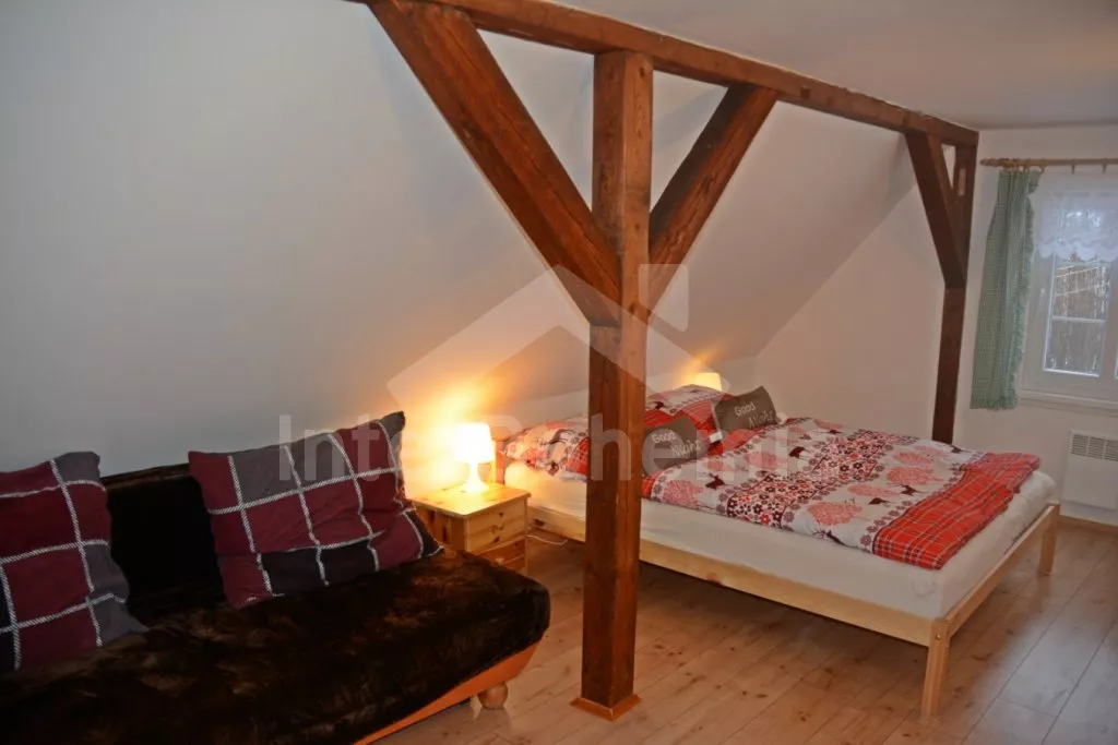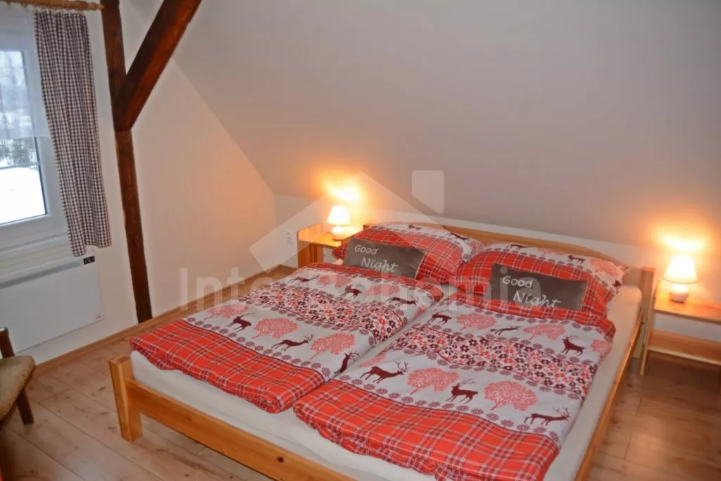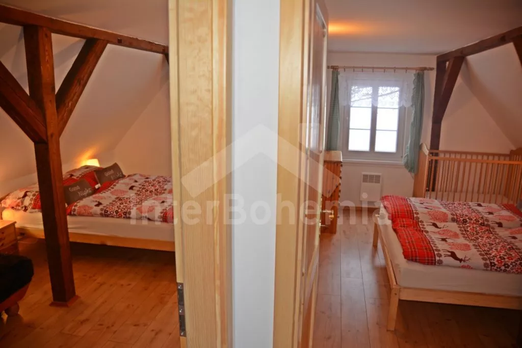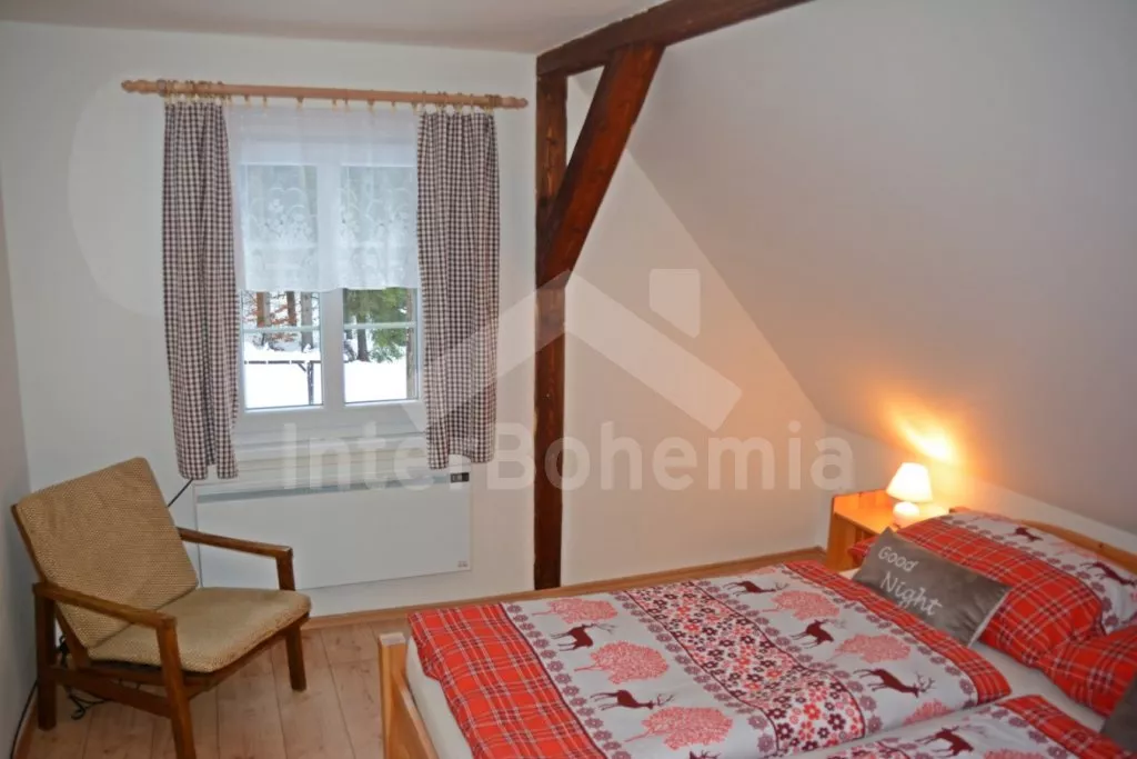 Samostatně stojící chalupa na vlastním neoploceném pozemku, v roce 2014 vkusně zrekonstruovaná. Vstup, chodba, kuchyně propojená s jídelnou a obývacím pokojem. Kuchyňská linka se sklokeramickou varnou deskou, troubou, mikrovlnnou troubou, lednicí s mrazákem, automatickým kávovarem, rychlovarnou konvicí a myčkou na nádobí. V jídelně stůl pro 6 osob, minivěž a krbová kamna na dřevo. Obývací pokoj se sedací soupravou pro 9 osob (rozložitelná na extra lůžko pro 2 osoby) a LCD televizí. Koupelna se sprchovým koutem, umyvadlem, wc a vanou. V podkroví se nachází 3 samostatné ložnice. První ložnice s dvoulůžkem a dětskou postýlkou. Druhá ložnice s dvoulůžkem a pohovkou (rozkládací na extra lůžko pro 2 osoby). Třetí ložnice s dvoulůžkem, jedním jednolůžkem a dětskou postýlkou. Vytápění objektu elektrickými přímotopy a krbovými kamny. Hosté mají k dispozici zahradu s posezením na terase, přenosný gril, ohniště, pro děti je zde pískoviště, houpačka, skluzavka a trampolína. Parkování u chalupy pro 3 automobily.