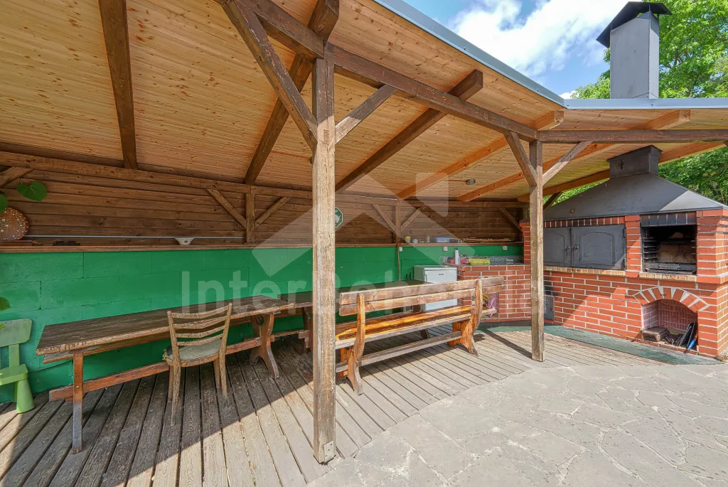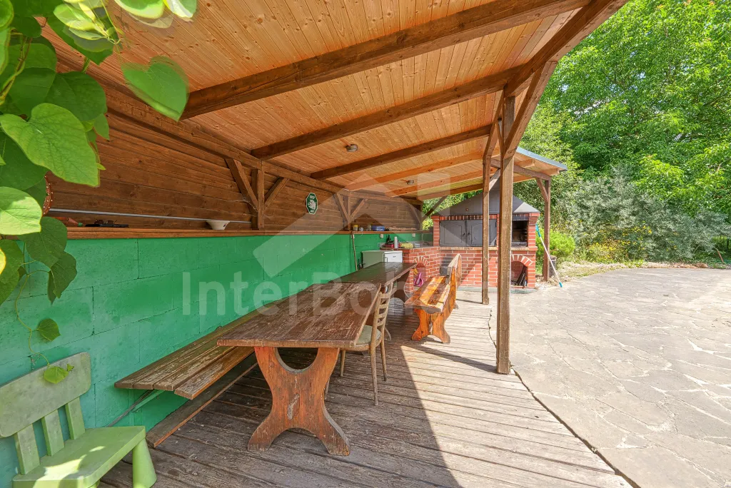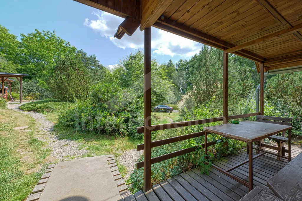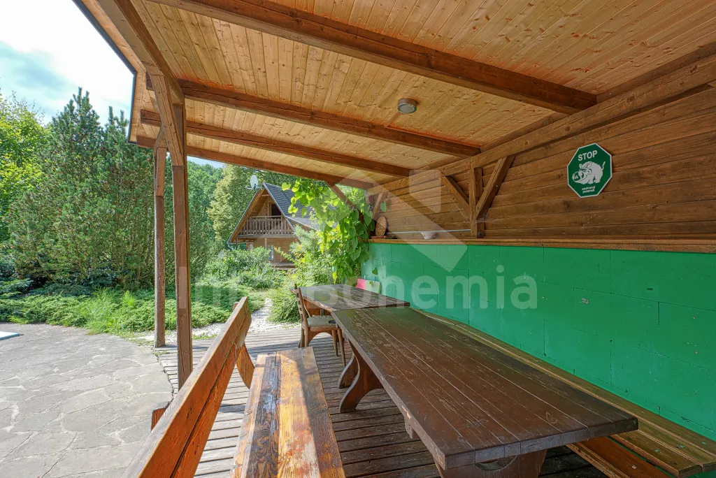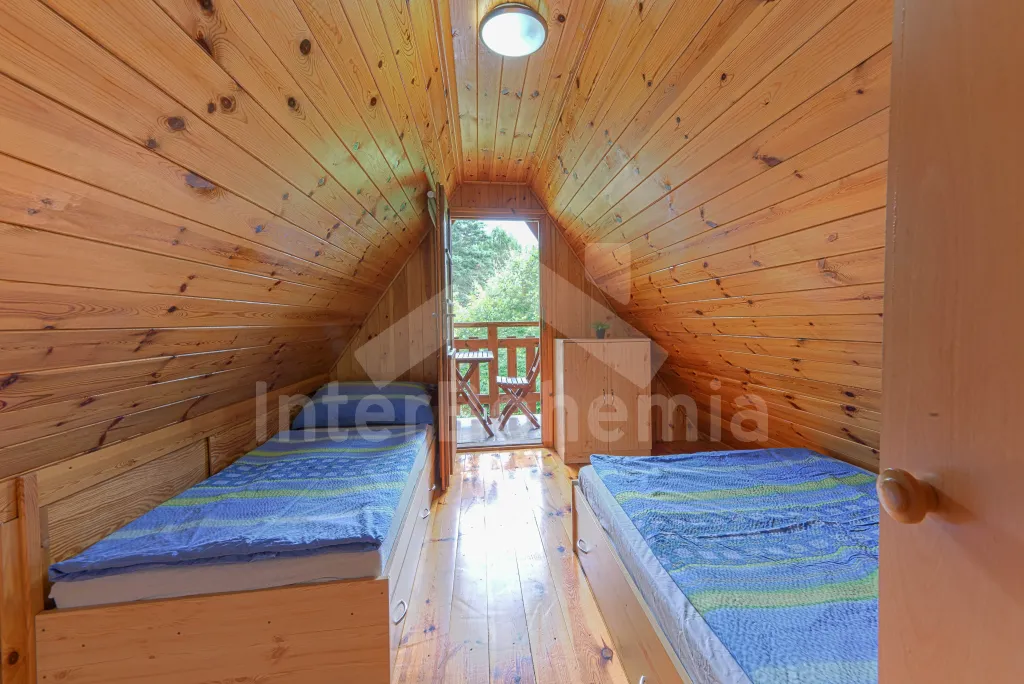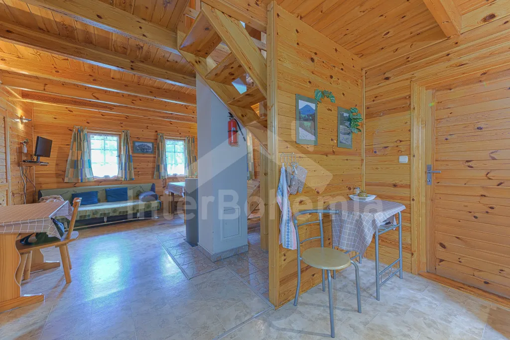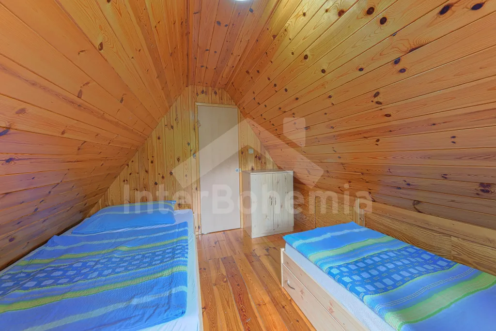 Volně stojící dřevěná chata, v roce 2006 nově postavená. Vstup přes zastřešenou terasu do předsíně. Obývací místnost s rozkládacím gaučem, televizí s DVD, krbovými kamny, jídelním koutem. Kuchyňský kout s dvojplotýnkovým vařičem, varnou konvicí, mikrovlnnou troubou a lednicí. Koupelna se sprchou a toaletou. Ložnice s dvojlůžkem a dětskou postýlkou. Schody do prvního patra. Galerie s vysouvací postelí, která slouží jako dvě lůžka. Ložnice se dvěmi samostatnými lůžky a vstupem na zastřešený balkon. Další ložnice se šikmými stropy a se dvěmi matracemi na zemi (vhodné pro děti). Vytápění krbovými kamny. K dispozici je neoplocená zahrada s dřevěným zahradním nábytkem, přenosný zahradní gril a pískoviště. K dispozici zapuštěný bazén 10 x 5 x 1,5 m (užívá ho i pronajímatel). Vlastní parkoviště.