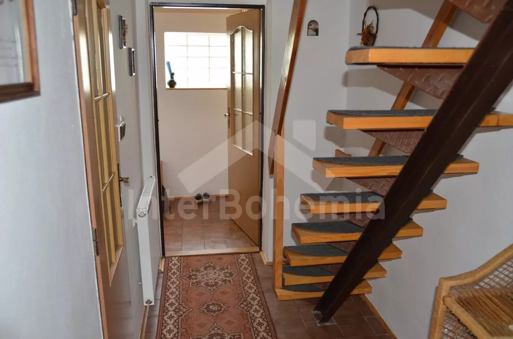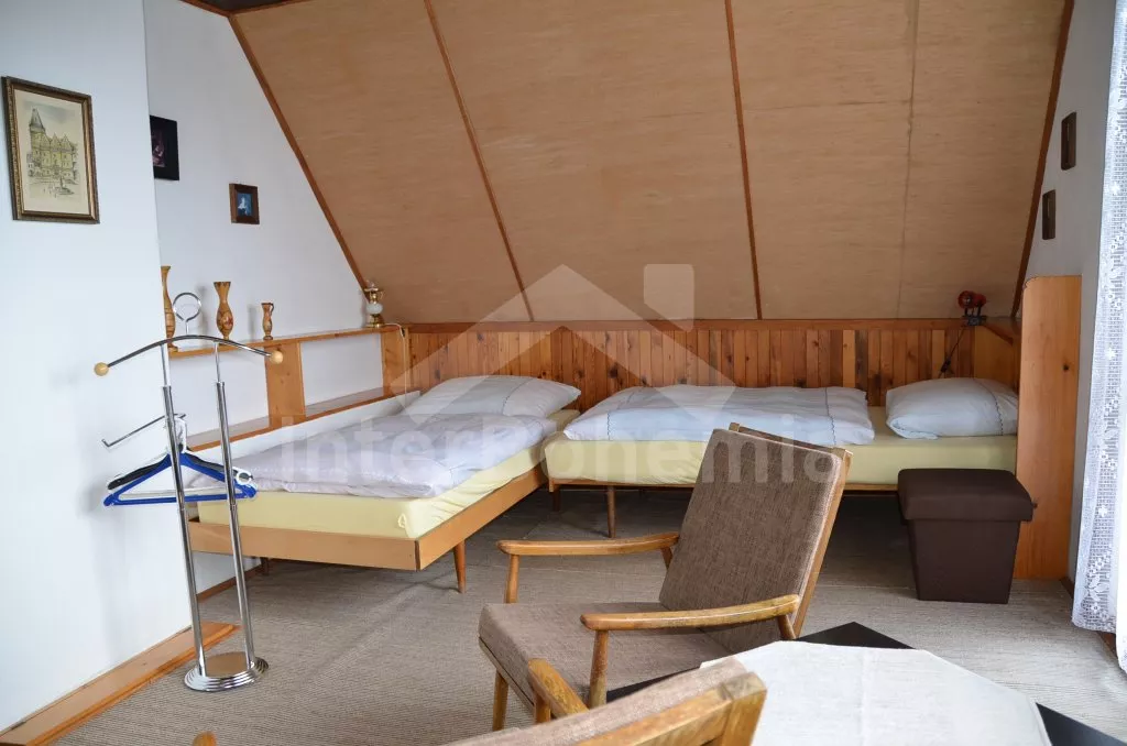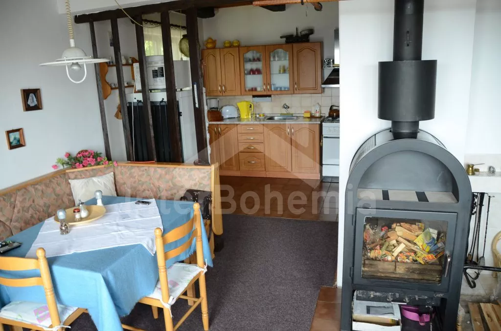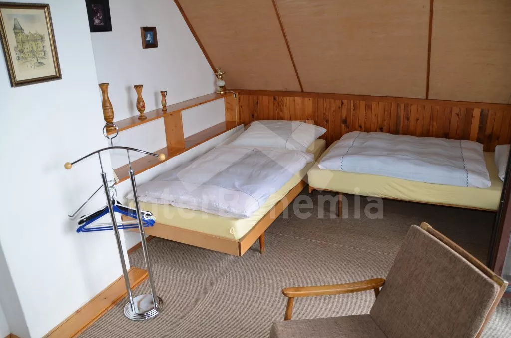 Volně stojící chata, hezky a pohodlně zařízená. Vstup, chodba, obývací pokoj se sedací soupravou pro 6 osob, jídelním koutem, televizí se satelitním příjmem, krbovými kamny a vstupem na terasu. Otevřená kuchyně s plynovým sporákem, lednicí s mrazákem, kávovarem, varnou konvicí a mikrovlnou troubou. Koupelna se sprchovým koutem a toaletou. V podkroví se nachází malá hala s posezením a dvě ložnice - první ložnice (místo dveří pouze závěs) se třemi samostatnými lůžky a vchodem na balkon a druhá ložnice (shrnovací dveře) se dvěma samostatnými lůžky. Vytápění krbovými kamny s tepelnými rozvody do pokojů. Zahrada je částečně oplocená vysokým živým plotem, k dispozici je zahradní nábytek se slunečníkem a ohniště. Vlastní parkoviště.