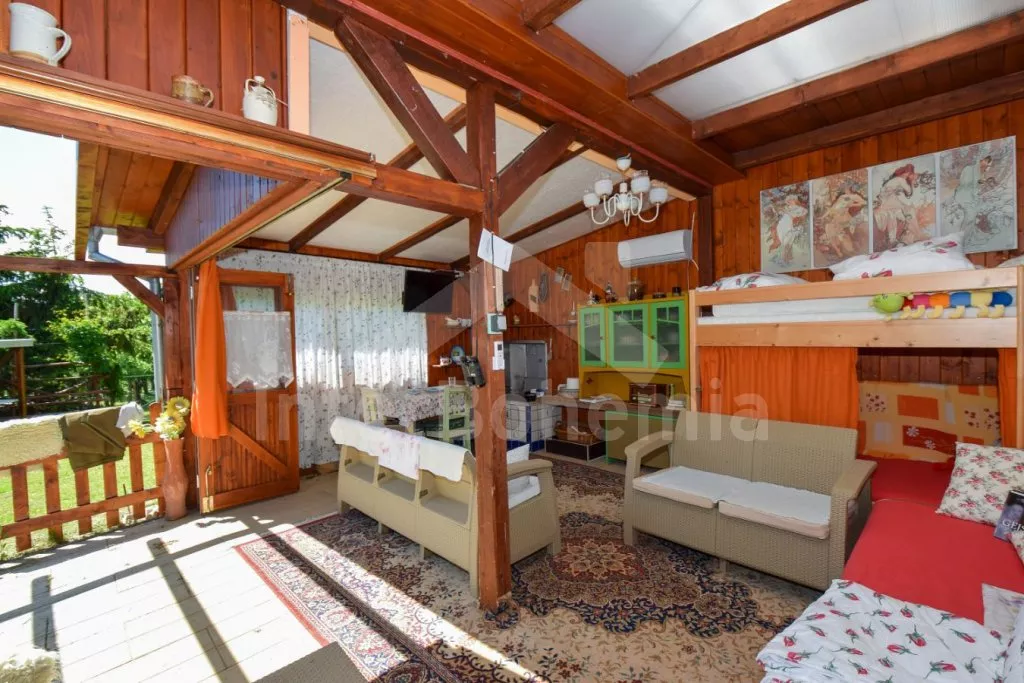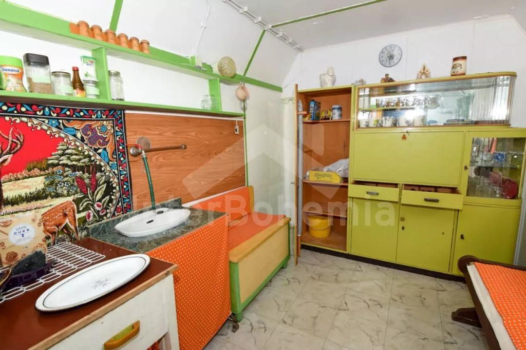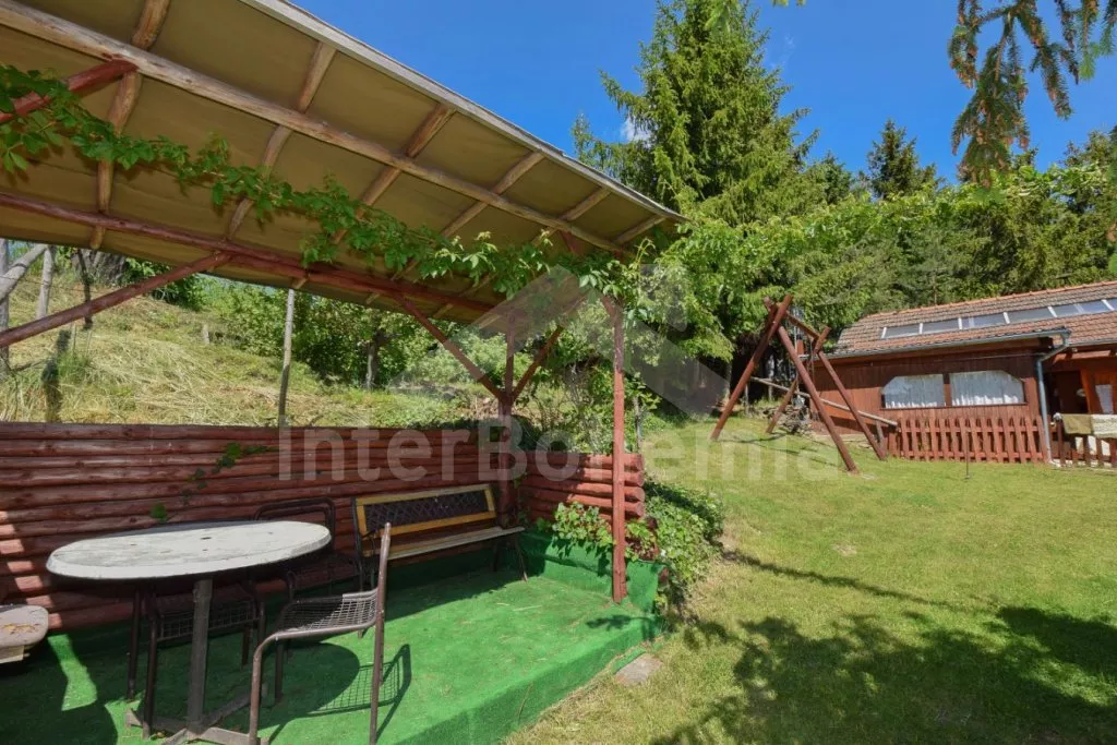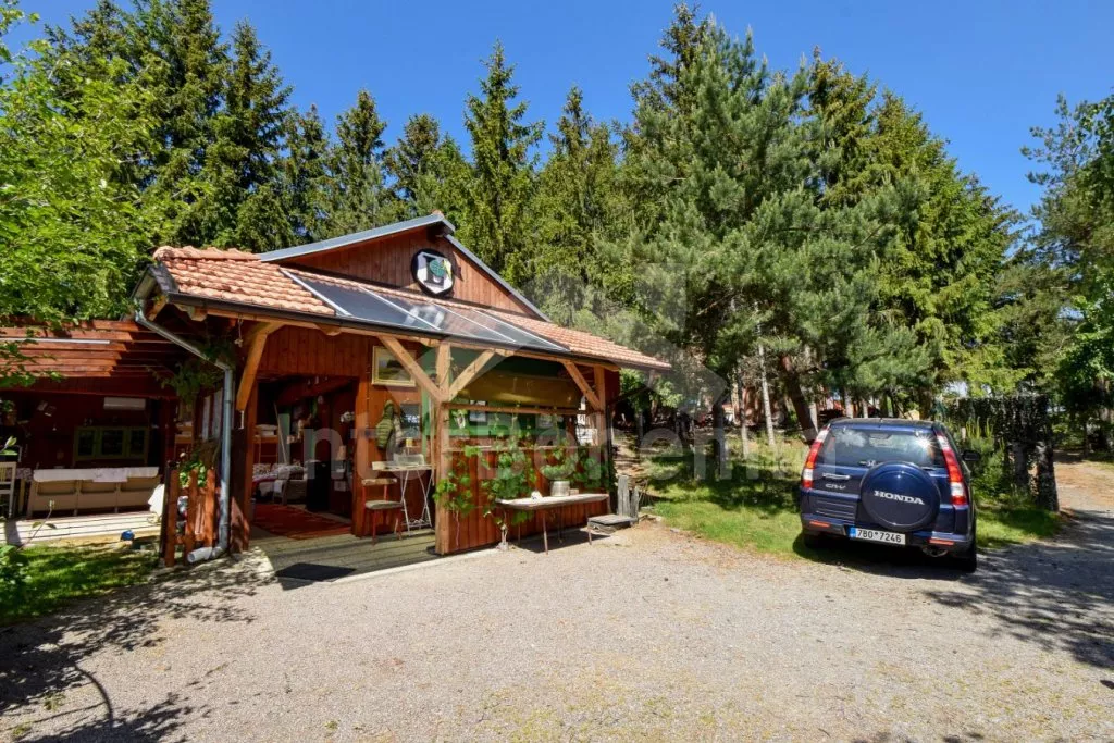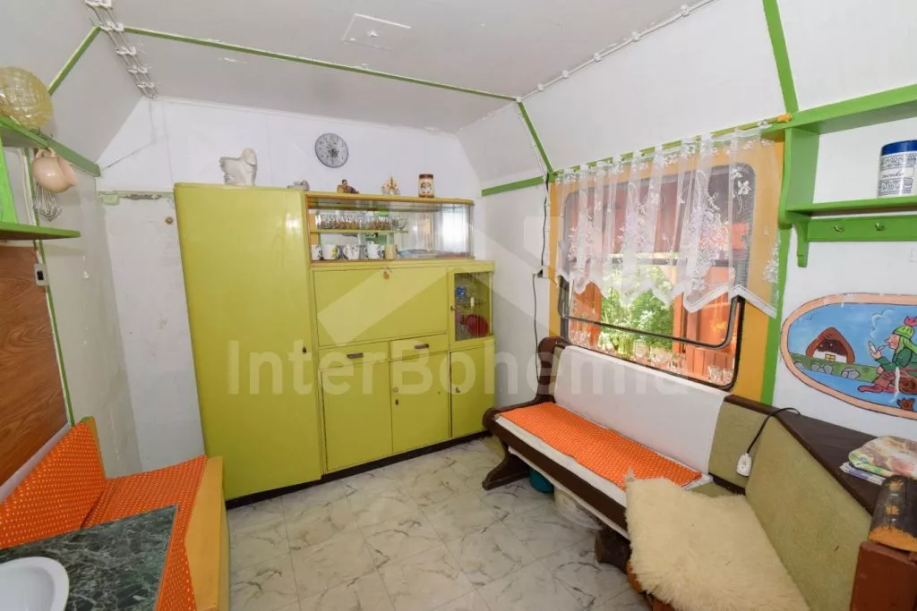 Originální ubytování – spojení zahradního domku s vlakovým vagónem, s možností otevření dvou stěn z obýváku přímo do zahrady pro co nejužší spojení s okolní přírodou. Kuchyňka s plynovým sporákem, troubou, mikrovlnnou troubou, rychlovarnou konvicí, nádobím, pračkou a myčkou na nádobí. Na kuchyň navazuje obývací pokoj se sedací soupravou, jídelním stolem, samostatným lůžkem, palandou a LCD televizí. V přistavěném vagónu ložnice se samostatným lůžkem a palandou a kuchyně s lednicí, mrazákem, umyvadlem, kamny a posezením. Suchá toaleta u domku a venkovní umývárna s teplou vodou. Na pozemku se nachází venkovní zastřešená kuchyň a ohniště, ideální pro letní grilování. K dispozici částečně oplocená zahrada, ovocný sad, houpačka, venkovní posezení a gril. Parkování u domu pro 2 vozidla.