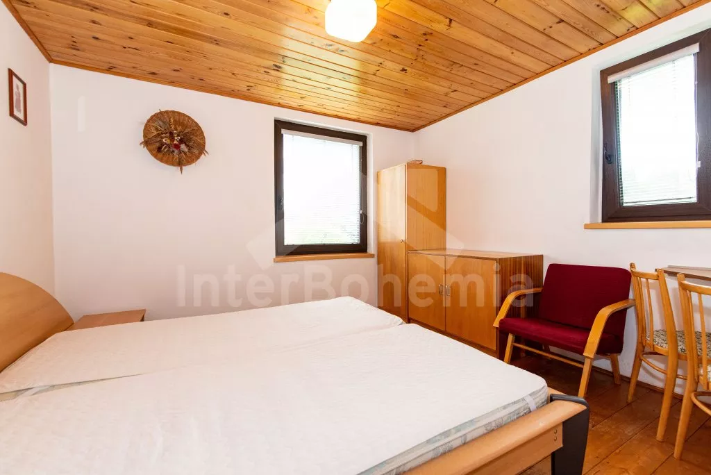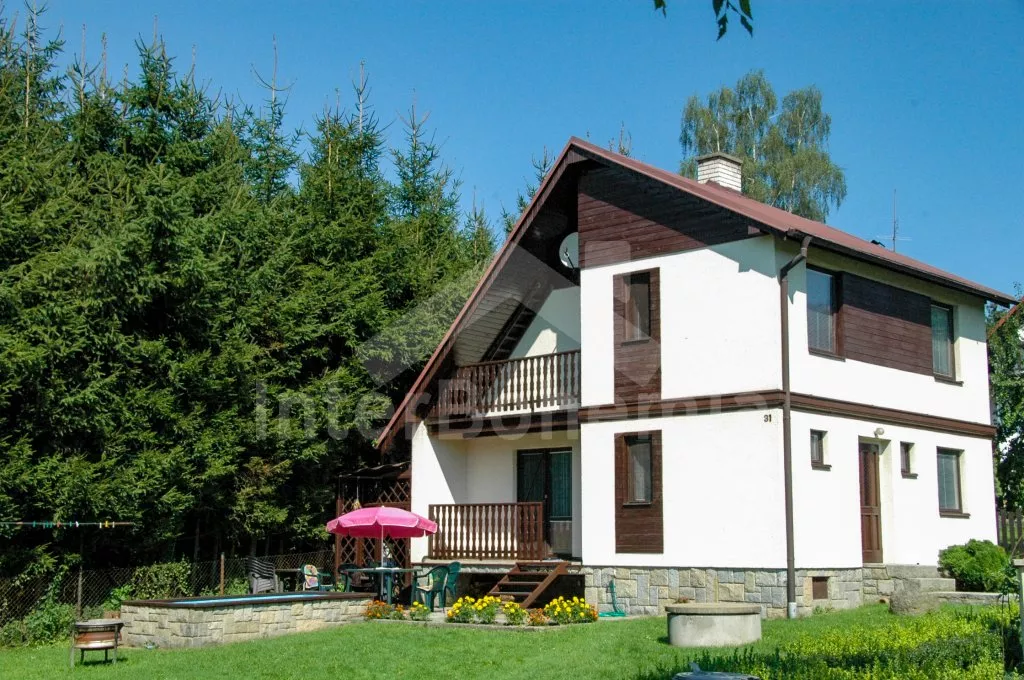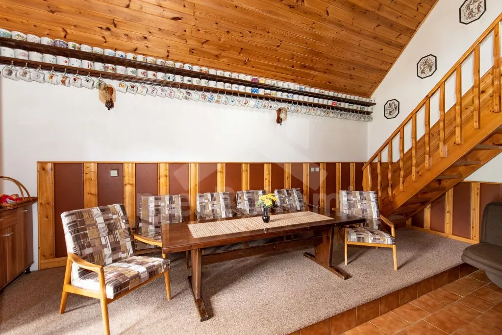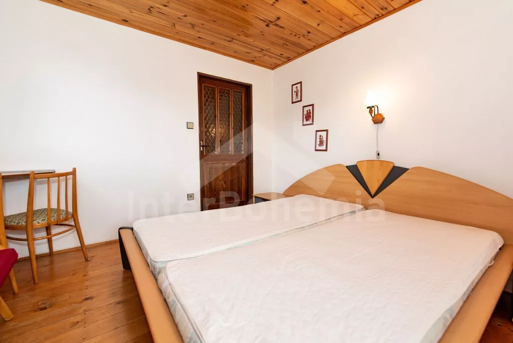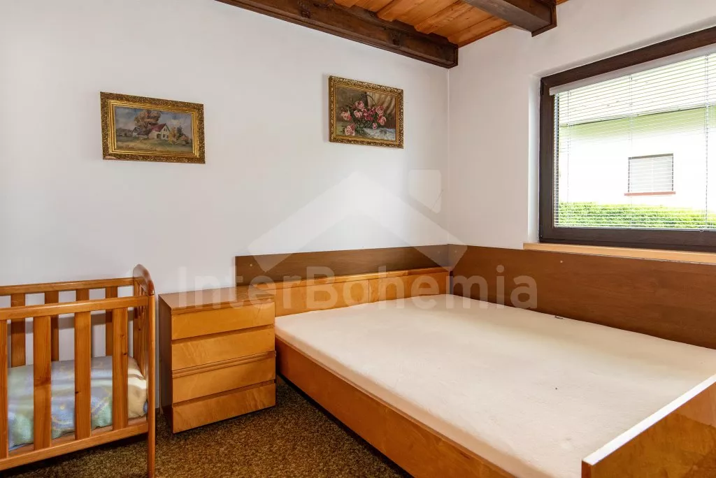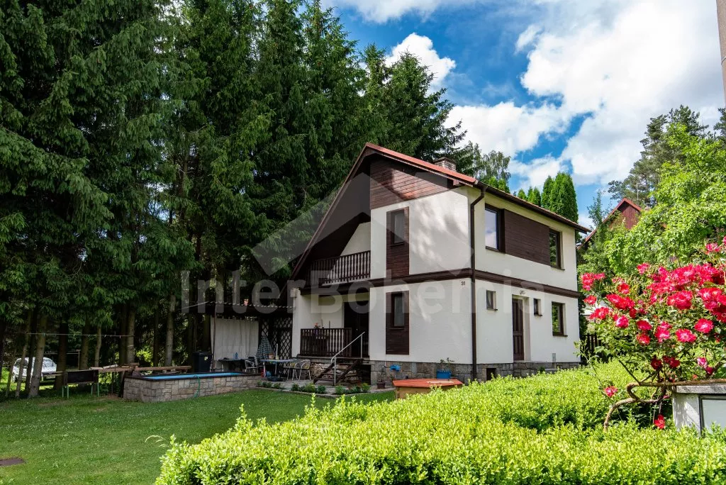 Volně stojící chata, postavená v roce 1993, hezky udržovaná. Vstup, chodba, obývací pokoj s podlahou ve dvou úrovních, sedací soupravou, jídelním stolem, krbem a vstupem na terasu. Malá kuchyňka s elektrickým sporákem, lednicí, kávovarem, varnou konvicí a mikrovlnnou troubou. Koupelna se sprchou, samostatná toaleta. Ložnice s dvojlůžkem. V patře se nachází hala a dvě ložnice – každá s jedním dvojlůžkem. Vytápění krbem. Zahrada není oplocená, k dispozici je terasa, zahradní nábytek se slunečníkem a přenosný gril. Malý bazének pro děti 3 x 1,1 m a 0,6 m hluboký bez filtrace. Vlastní parkoviště.