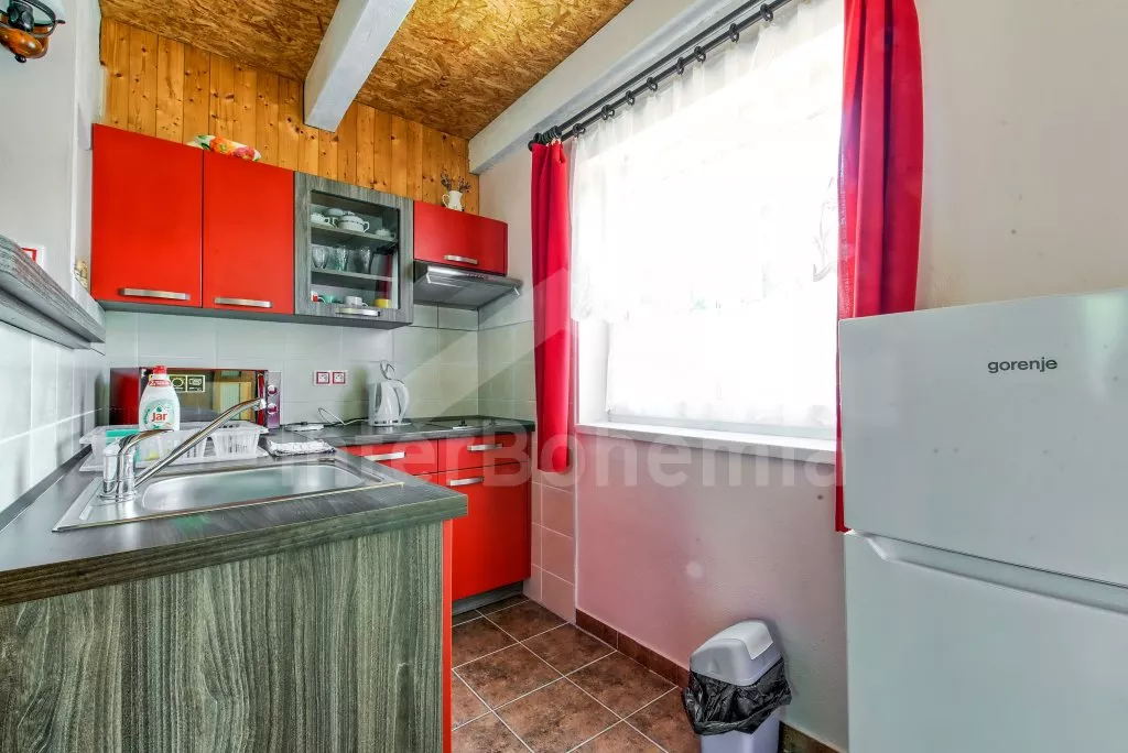Volně stojící chata po rekonstrukci v roce 2022. Vstup přes chodbu s úložným prostorem. Kuchyňský kout s elektrickým dvouplotýnkovým vařičem, mikrovlnnou troubou, varnou konvicí a lednicí s mrazákem.… Více informací