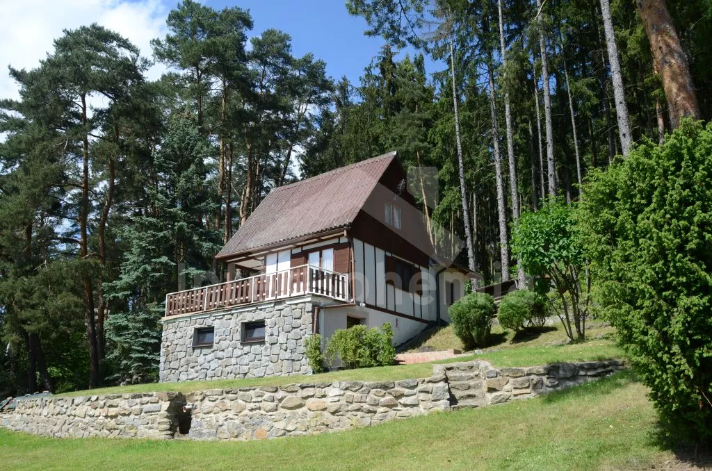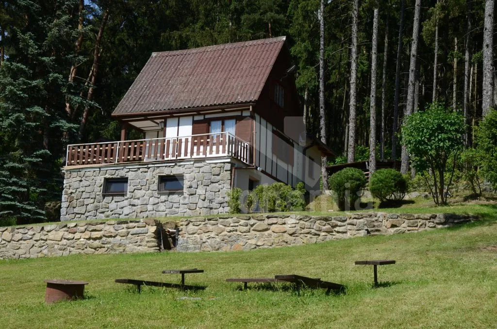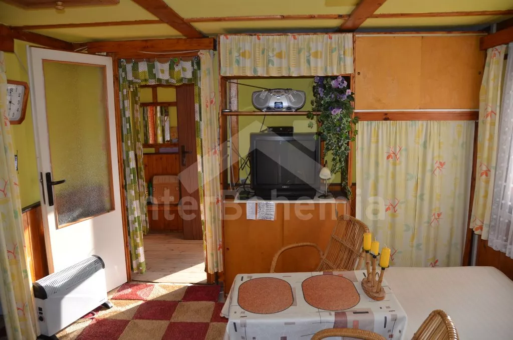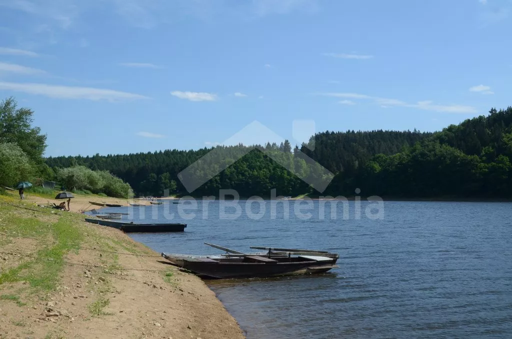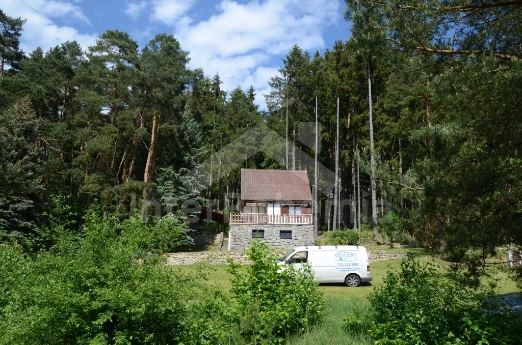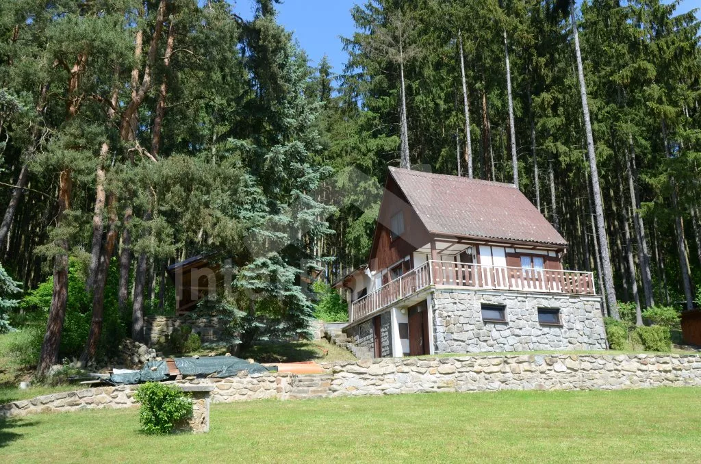 Volně stojící rekreační chata, pohodlně a účelně zařízená. Vstup, předsíň, obývací pokoj s posezením, krbovými kamny a TV, malý průchozí pokoj s TV a 1½ lůžkem a schody do patra. Kuchyně s elektrickým sporákem, kombinovanou lednicí s mrazákem, mikrovlnnou troubou, varnou konvicí a jídelním stolkem pro 4 osoby. Koupelna se sprchovým koutem, toaletou a umyvadlem. V patře je jedna velká ložnice se 4 samostatnými lůžky. Vytápění krbovými kamny a v případě potřeby elektrickým přímotopem. K dispozici na pozemku je velká kamenná terasa s posezením a zahrada s posezením u ohniště a udržovaný přístupem k vodě (ideální pro rybáře). Ukládání rybářského a dalšího vybavení ve skladu se zámkem. Parkování na pozemku.