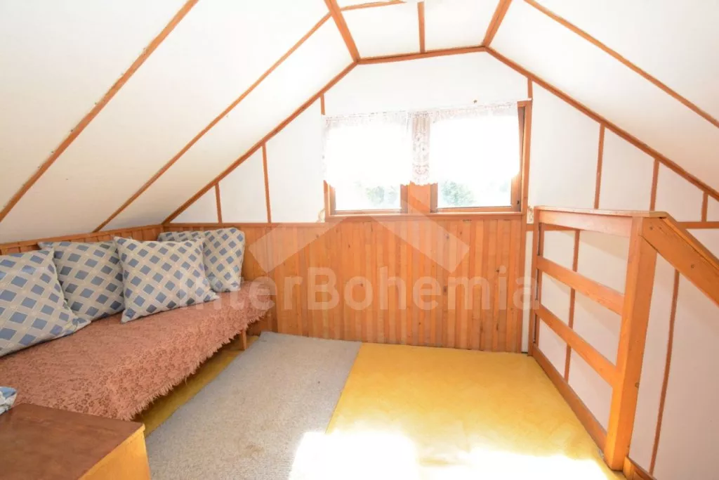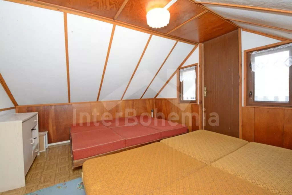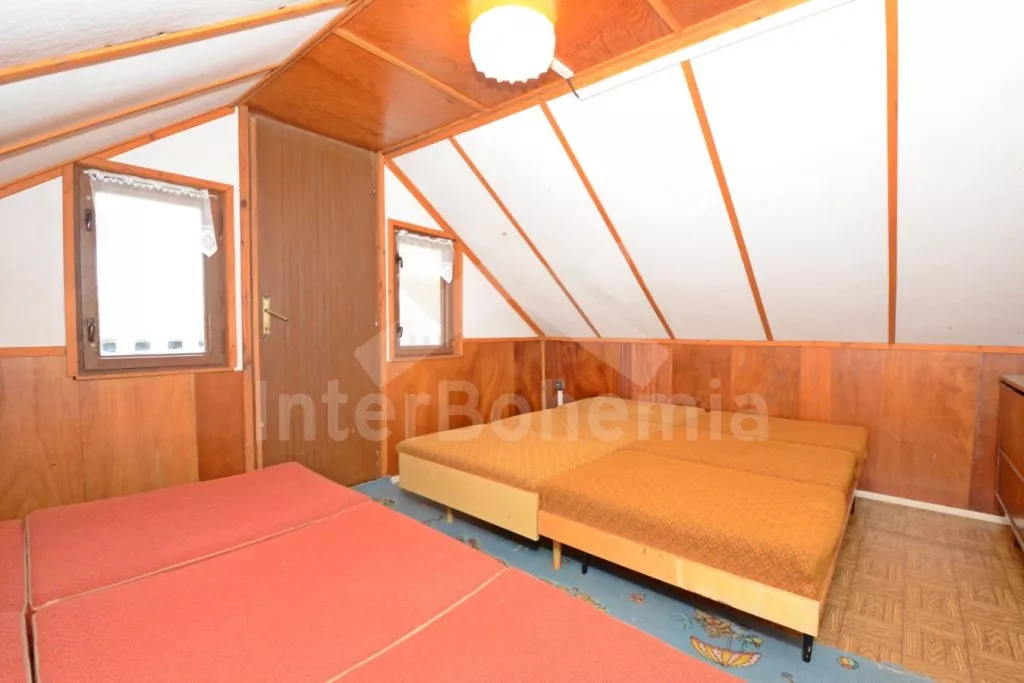 Volně stojící dřevěná chata na vlastním oploceném pozemku, účelně a pohodlně zařízená. Vstup, prostorná obývací místnost s pohovkou, jídelním stolem pro 6 osob a rádiem. Součástí je kuchyně se sporákem (elektrický), troubou, mikrovlnnou troubou, lednicí s mrazákem, rychlovarnou konvicí a nádobím. V podkroví vstup do galerie s jednolůžkem a dále do ložnice s dvěma dvoulůžky. Balkon s výhledem na přilehlé okolí. Koupelna se sprchovým koutem, umyvadlem a wc. Vytápění chaty lokální kamny. Hosté mají k dispozici oplocenou zahradu se zahradním nábytkem, přenosným grilem, dále přístup k řece s možností užití lodičky. Parkoviště pro 3 automobily před chatou.