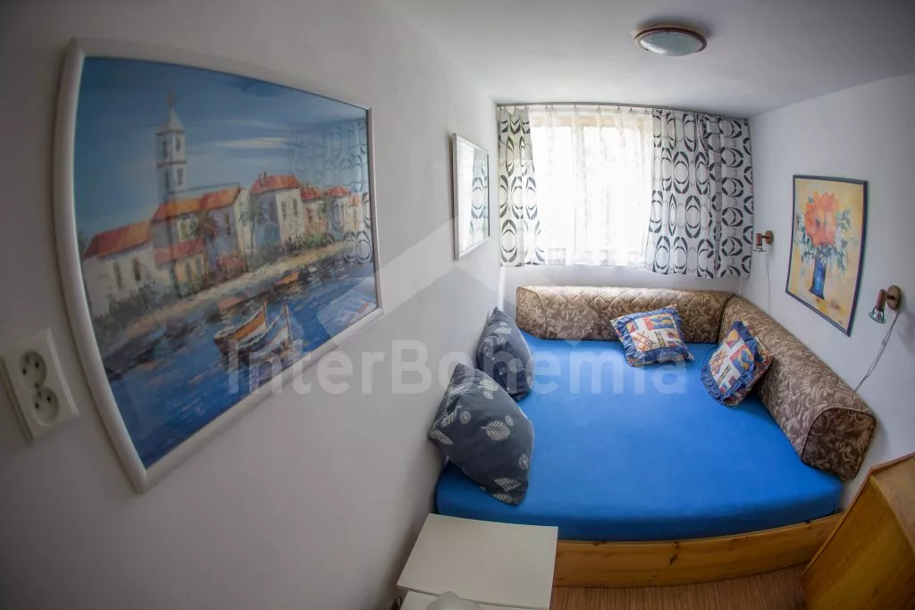 Zděná chata s terasou, balkónem a zahradou plnou zeleně, která krásně nastolí odpočinkovou náladu na Vaší dovolené. Vstup, hala s posezením. Obývací pokoj s pohovkou , ratanovou sedačkou, jídelním koutem, televizí, krbem a kamny na dřevo. Malá kuchyňka s plynovým sporákem a el. troubou, lednicí, varnou konvicí a mikrovlnnou troubou. Koupelna se sprchou, samostatná toaleta. Ložnice s dvojlůžkem a jednolůžkem. Schody do podkroví. Přes padací dveře (poklop) se dostanete do útulné podkrovní ložnice se čtyřmi lůžky a balkónem. Vytápění kamny na dřevo a krbem. Chata stojí na vlastním pozemku, který je oplocený vysokým živým plotem. K chatě je přidružena druhá chata, nicméně pouze zadní stěnou, proto mají hosté na zahradě naprosté soukromí a nic nebrání jejich nerušené relaxaci. K dispozici je terasa, dřevěný zahradní nábytek se slunečníkem, přenosný gril, ohniště a pískoviště. K dispozici také venkovní suchá toaleta. Parkování před chatou.
