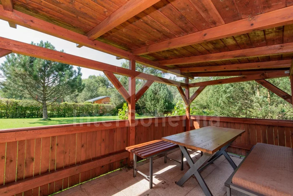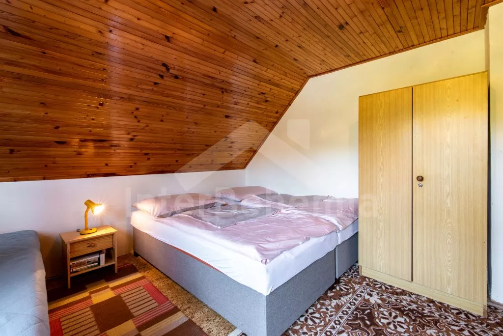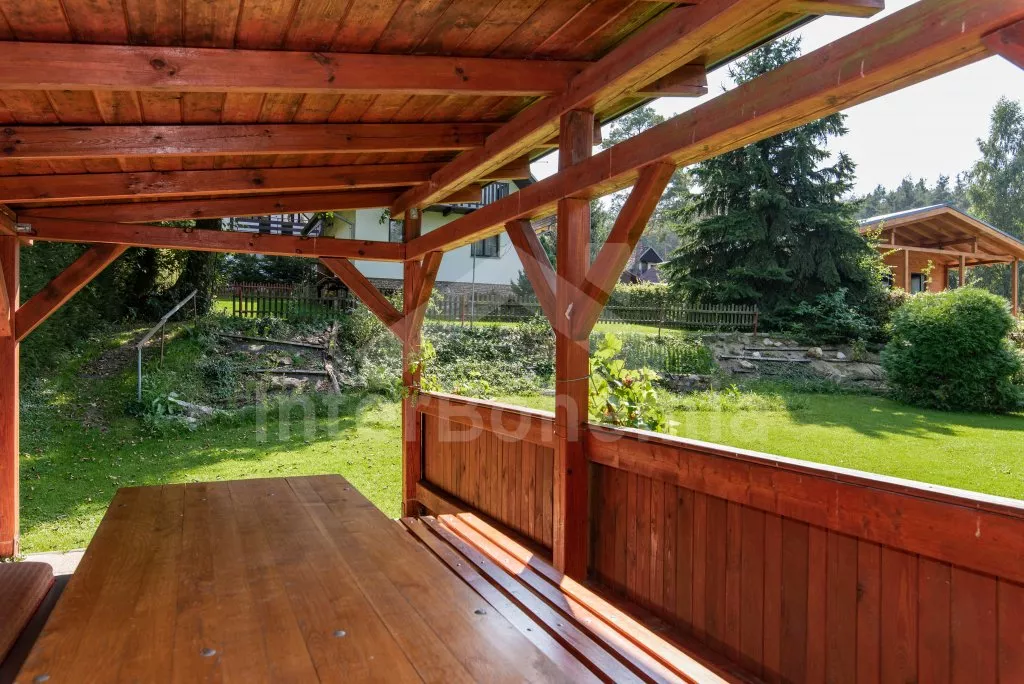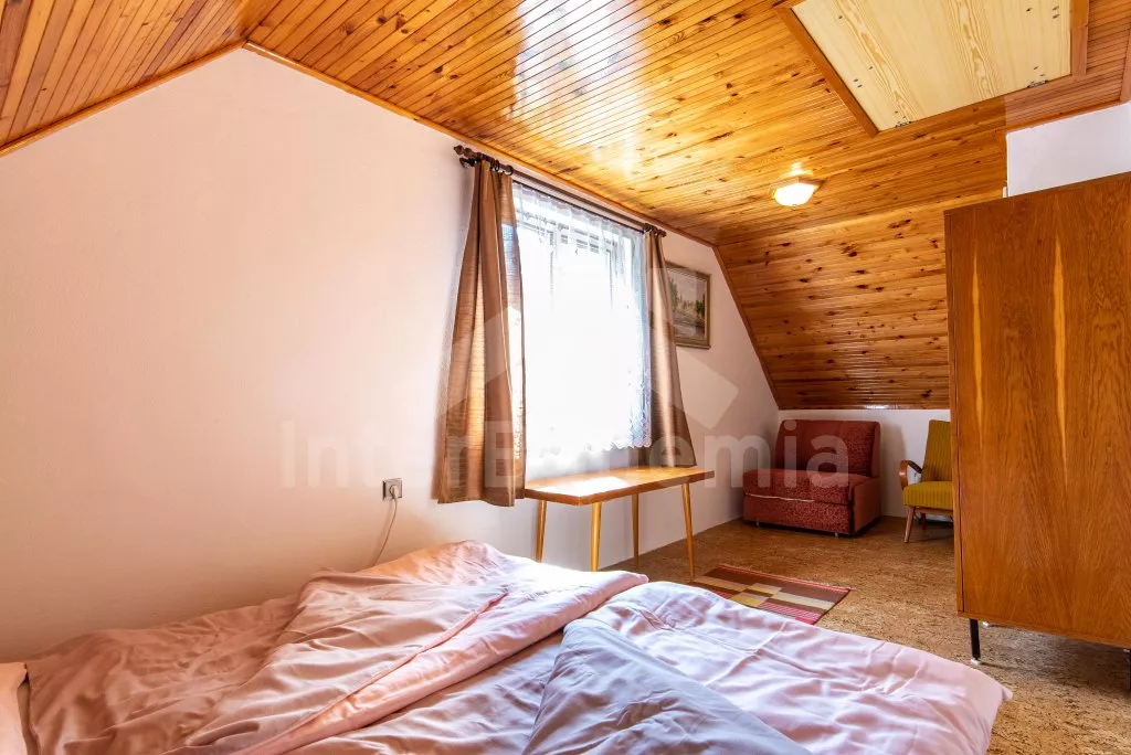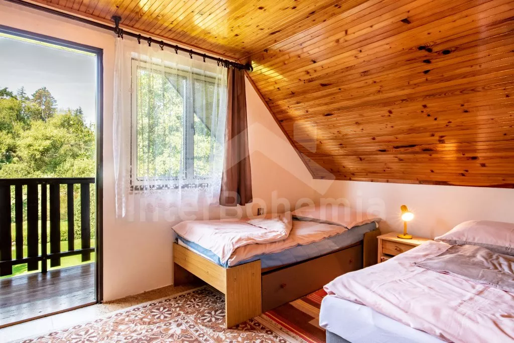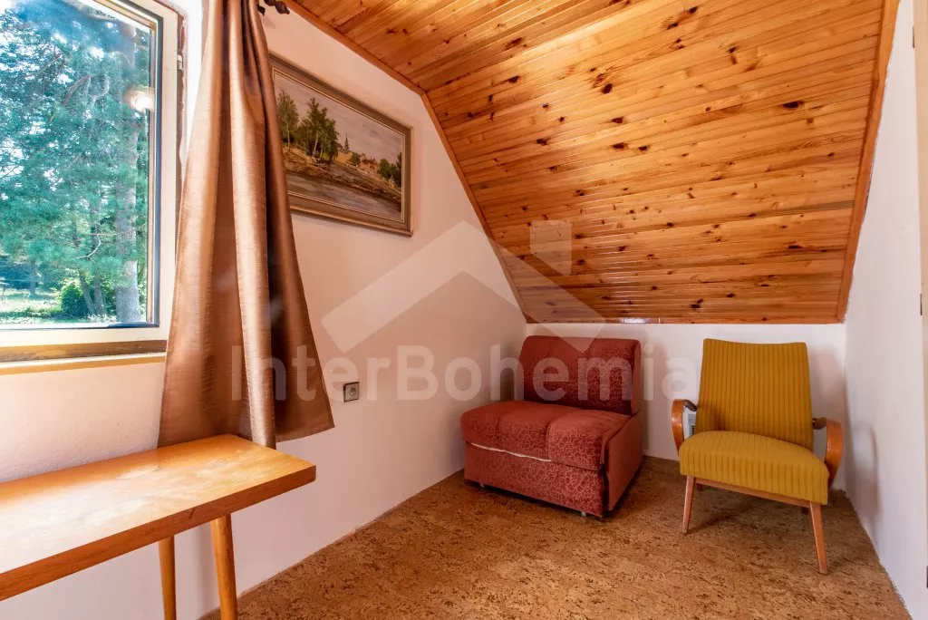 Volně stojící rekreační chata s velkou zahradou na břehu řeky Lužnice a krytým posezením v pergole. Vstup, chodba, obývací pokoj se sedací soupravou, jídelním stolem a televizí. Kuchyně s plynovým sporákem, troubou, mikrovlnnou troubou, lednicí, kávovarem (na kapsle), rychlovarnou konvicí a nádobím. Koupelna se sprchovým koutem, umyvadlem a WC. V podkroví první ložnice se třemi lůžky, rozkládací pohovkou (extra lůžko) a vstupem na balkon. Druhá ložnice s dvoulůžkem. Vytápění objektu přímotopy a krbovými kamny. Hosté mají k dispozici velkou, částečně oplocenou zahradu, kryté posezení v pergole a pramici na břehu řeky. Parkování před objektem pro 2 vozidla.