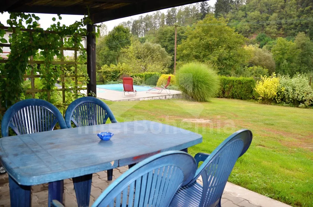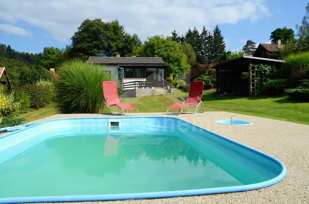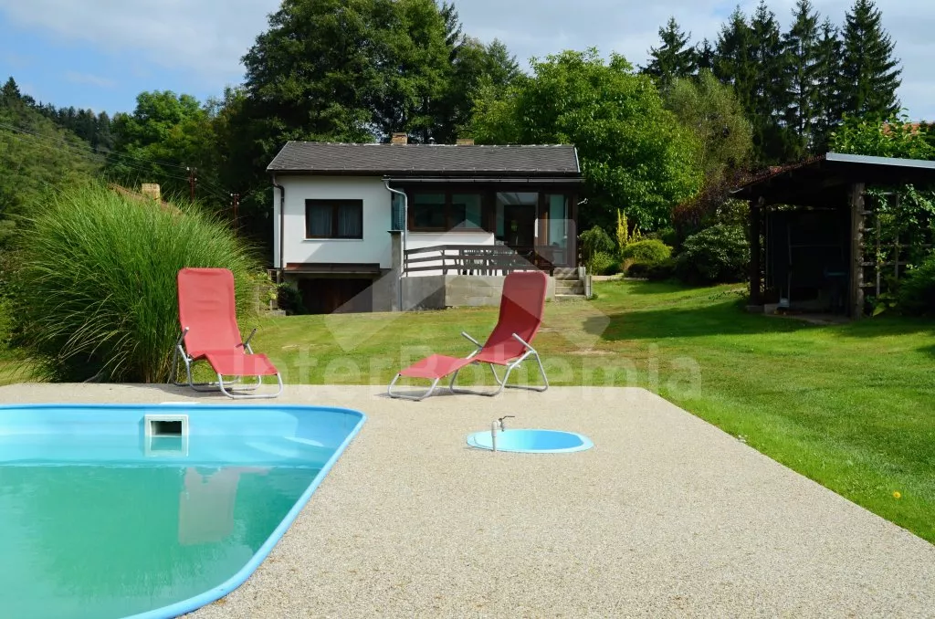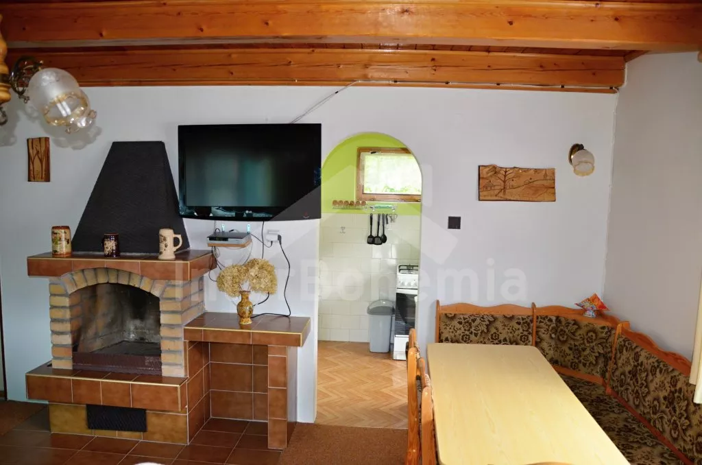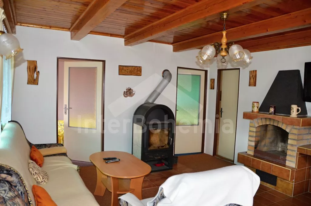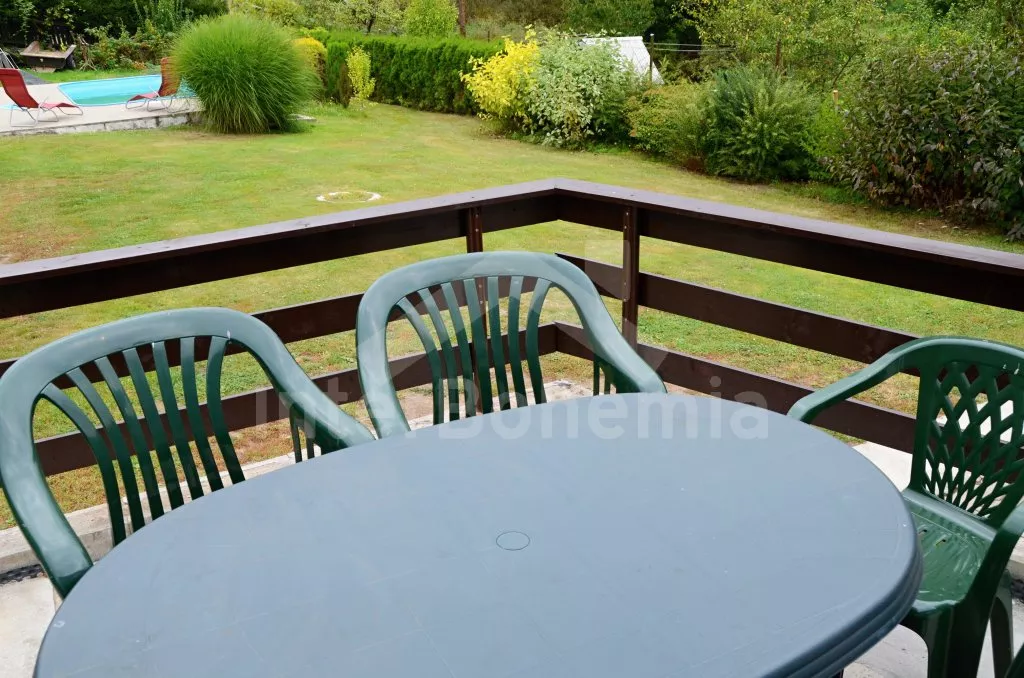 Volně stojící chata, pěkně zrenovovaná. Vstup přes zastřešenou terasu s výhledem do zahrady, posezením a přistýlkou. Velký obývací pokoj s posezením, TV, krbem, krbovými kamny, jídelním stolem s rohovou lavicí a vstupem do kuchyně s plynovým sporákem s elektrickou troubou, kombinovanou chladničkou s mrazákem, myčkou nádobí, mikrovlnnou troubou a varnou konvicí. Dvě ložnice - první s jedním dvojlůžkem a druhá se dvěma samostatnými lůžky. Koupelna s vanou, umyvadlem a toaletou. Vytápění krbovými kamny na tuhá paliva. Chata stojí na kompletně oploceném pozemku se zahradou a druhou chatou majitele. K dispozici je zapuštěný bazén 5 x 3 x 1,5 m s filtrací, zahradní pergola, zahradní plastový nábytek, stolní tenis, přenosný gril a ohniště. Parkování na vlastním parkovišti na pozemku.