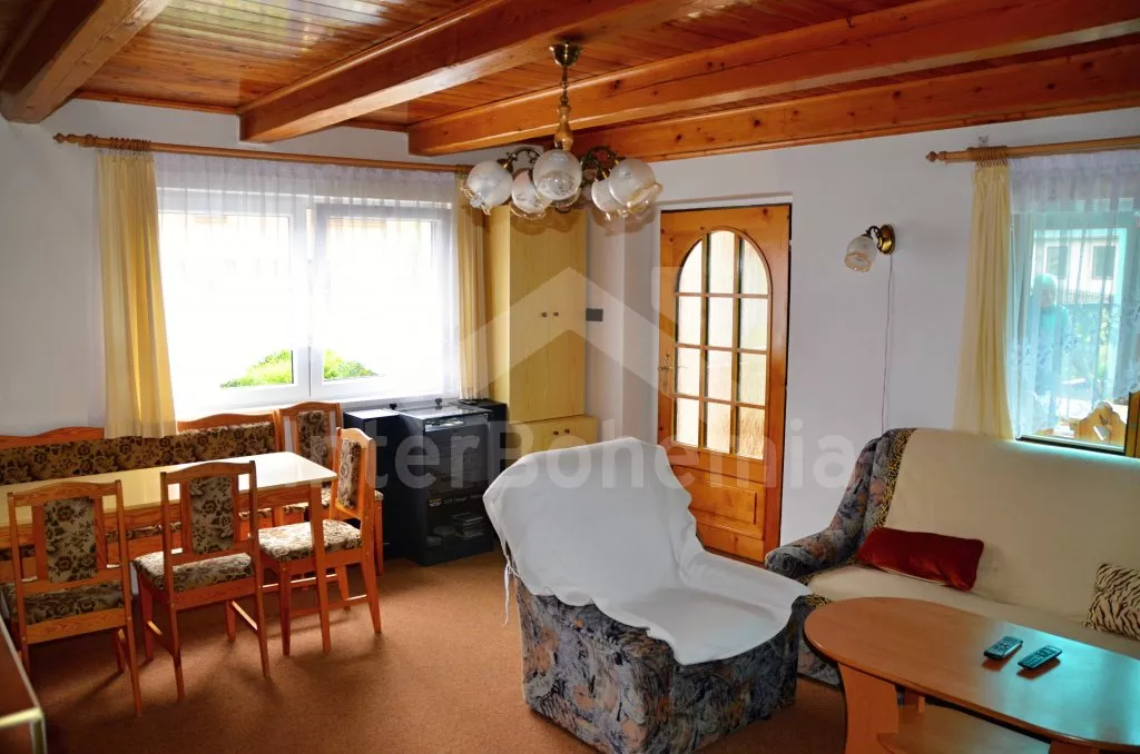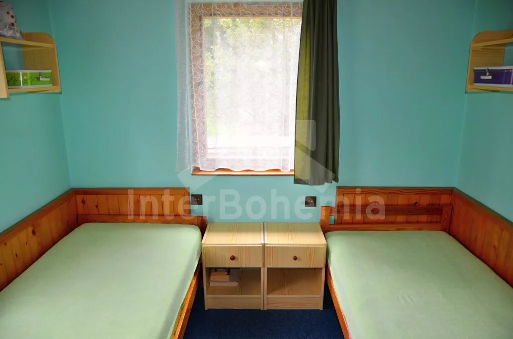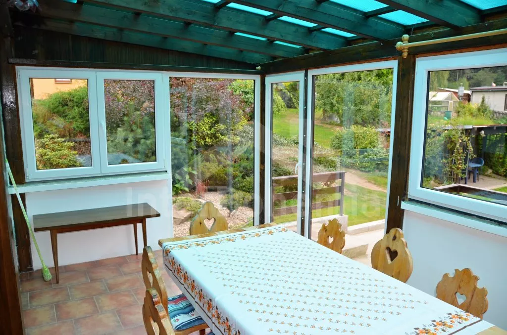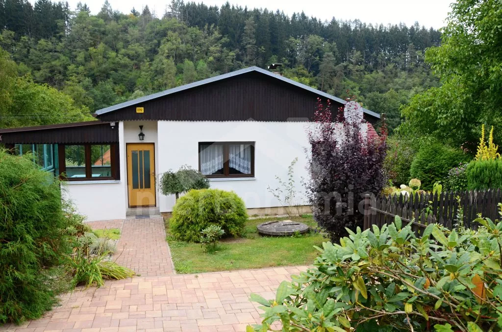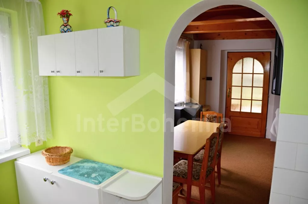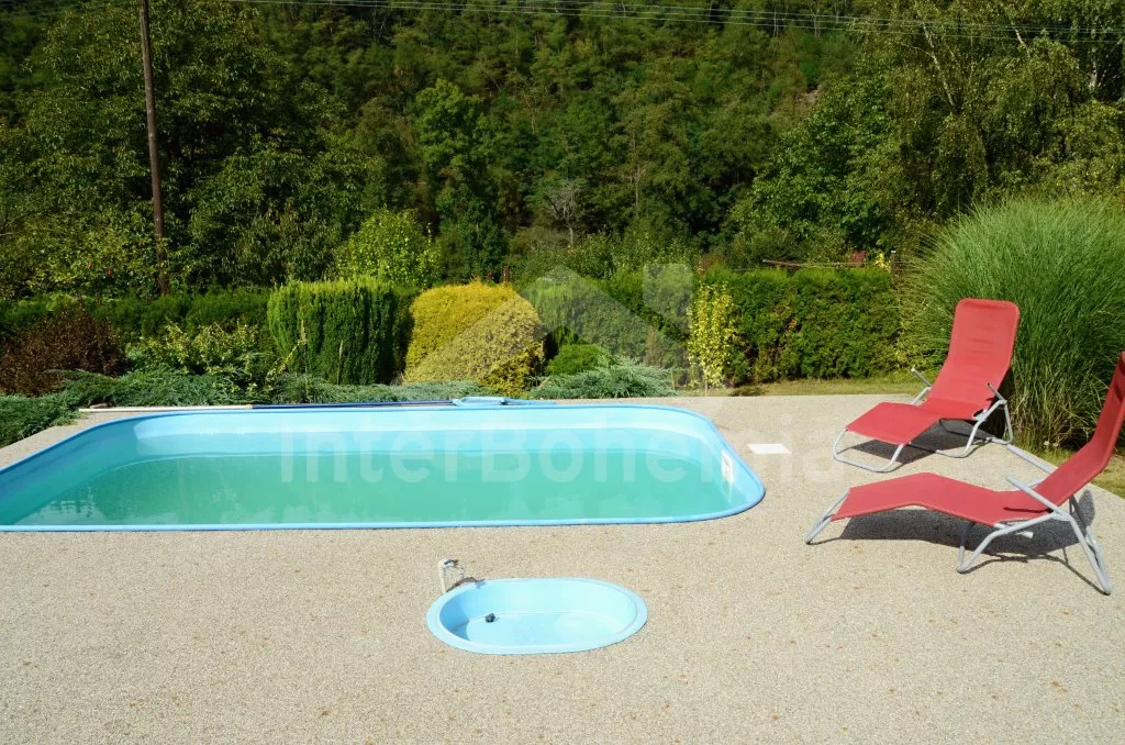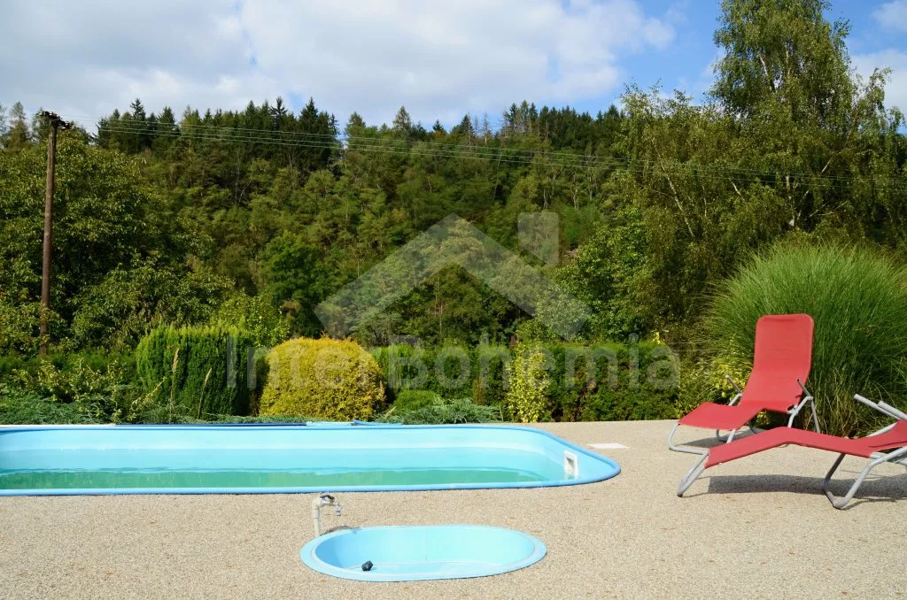 Volně stojící chata, pěkně zrenovovaná. Vstup přes zastřešenou terasu s výhledem do zahrady, posezením a přistýlkou. Velký obývací pokoj s posezením, TV, krbem, krbovými kamny, jídelním stolem s rohovou lavicí a vstupem do kuchyně s plynovým sporákem s elektrickou troubou, kombinovanou chladničkou s mrazákem, myčkou nádobí, mikrovlnnou troubou a varnou konvicí. Dvě ložnice - první s jedním dvojlůžkem a druhá se dvěma samostatnými lůžky. Koupelna s vanou, umyvadlem a toaletou. Vytápění krbovými kamny na tuhá paliva. Chata stojí na kompletně oploceném pozemku se zahradou a druhou chatou majitele. K dispozici je zapuštěný bazén 5 x 3 x 1,5 m s filtrací, zahradní pergola, zahradní plastový nábytek, stolní tenis, přenosný gril a ohniště. Parkování na vlastním parkovišti na pozemku.