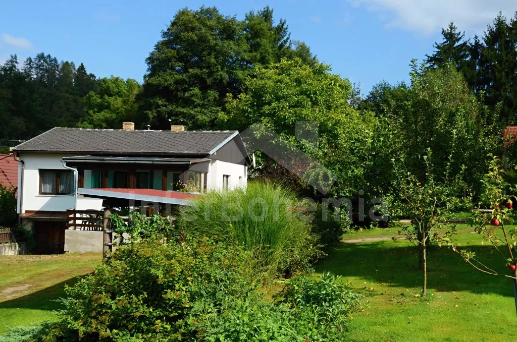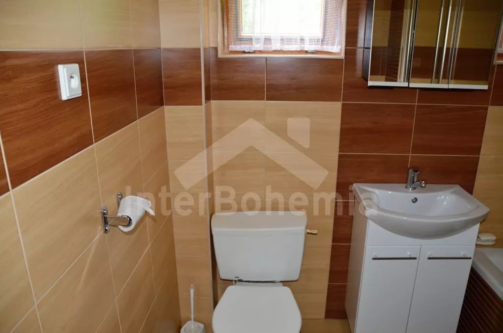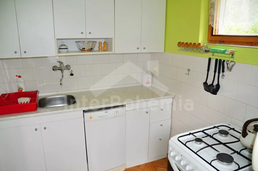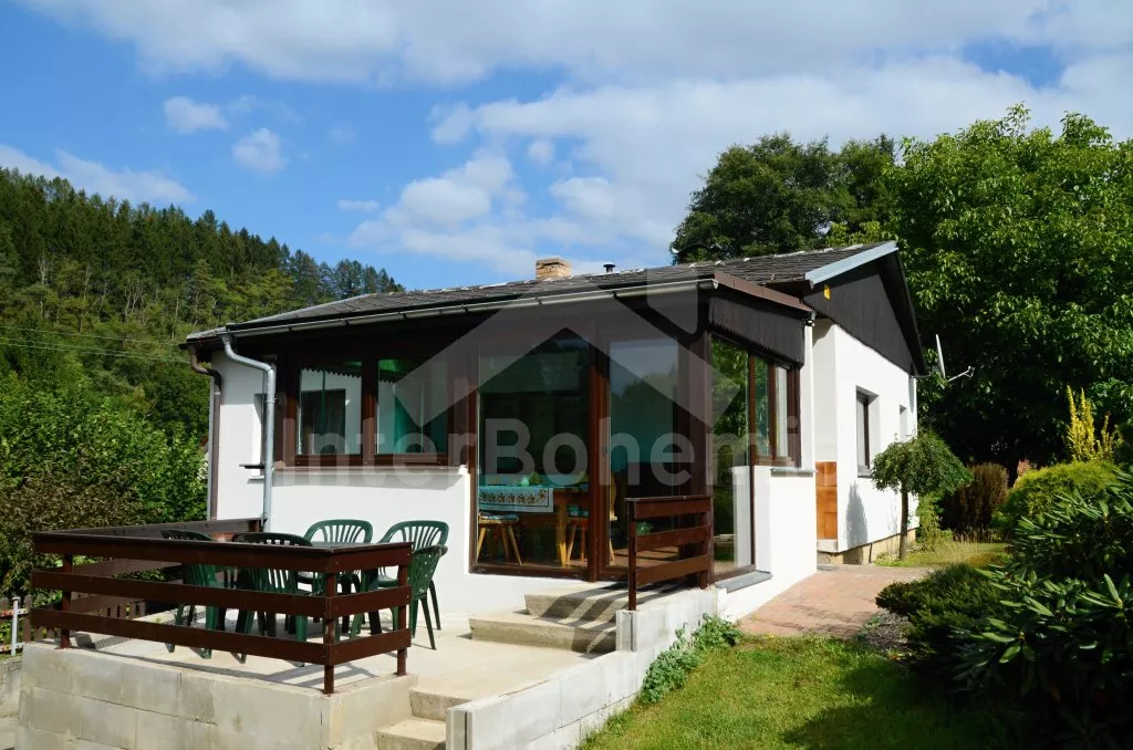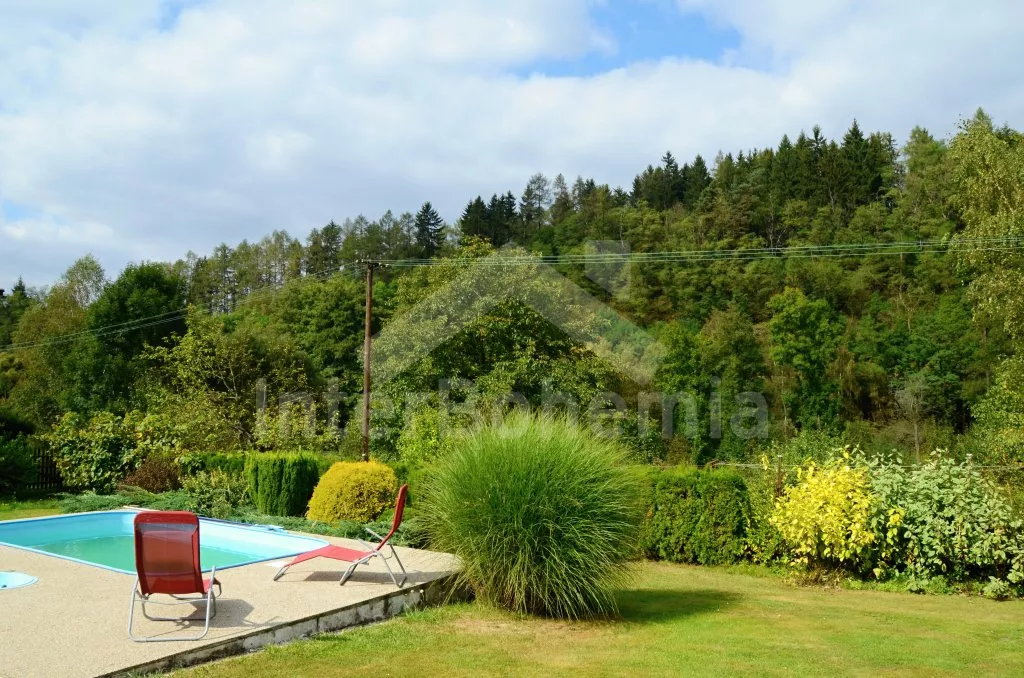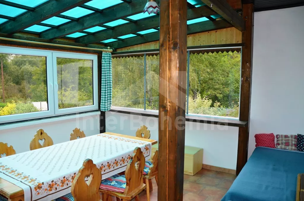 Volně stojící chata, pěkně zrenovovaná. Vstup přes zastřešenou terasu s výhledem do zahrady, posezením a přistýlkou. Velký obývací pokoj s posezením, TV, krbem, krbovými kamny, jídelním stolem s rohovou lavicí a vstupem do kuchyně s plynovým sporákem s elektrickou troubou, kombinovanou chladničkou s mrazákem, myčkou nádobí, mikrovlnnou troubou a varnou konvicí. Dvě ložnice - první s jedním dvojlůžkem a druhá se dvěma samostatnými lůžky. Koupelna s vanou, umyvadlem a toaletou. Vytápění krbovými kamny na tuhá paliva. Chata stojí na kompletně oploceném pozemku se zahradou a druhou chatou majitele. K dispozici je zapuštěný bazén 5 x 3 x 1,5 m s filtrací, zahradní pergola, zahradní plastový nábytek, stolní tenis, přenosný gril a ohniště. Parkování na vlastním parkovišti na pozemku.