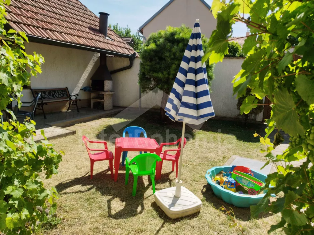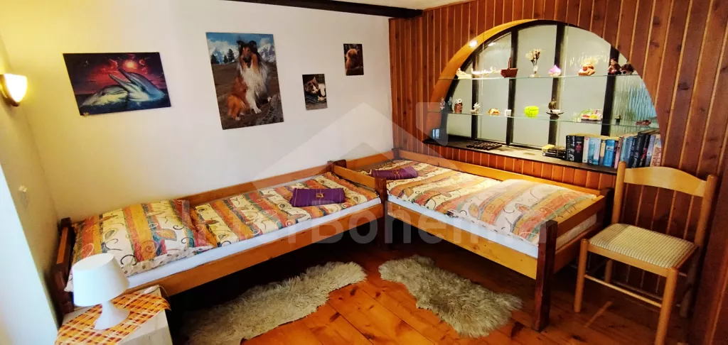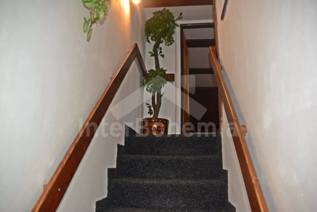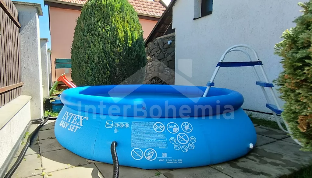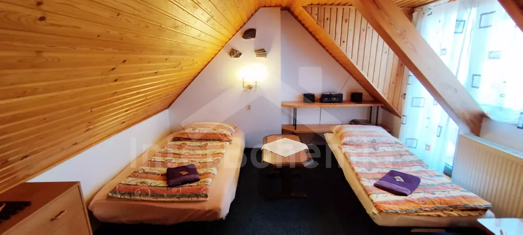 Chalupa s vlastním uzavřeným dvorem, kde budete mít veškeré soukromí. Vstup, obývací místnost spojená s kuchyní. V obývací místnosti posezení pro 7 osob, televize se satelitem a DVD, rádio, krbová kamna a bar. Kuchyňská linka se sporákem (plynovým), troubou, mikrovlnnou troubou, lednicí a rychlovarnou konvicí. Koupelna se sprchovým koutem, umyvadlem a pračkou. Samostatné wc. Z obývací místnosti je vstup do sauny. K dispozici druhá sprcha. V podkroví dvě samostatné ložnice, první s dvěma jednolůžky (možnost dvoulůžka) a dvou rozkládacích jednolůžek. Druhá ložnice s dvěma jednolůžky a jedním rozkládacím lůžkem. Objekt je rozdělen na 2 části, 2. část je přístupná z druhé ložnice, nebo z terasy po vlastních schodech. Další 2 ložnice. První průchozí ložnice s 1 x přistýlkou a 1 x rozkládacím křeslem (110cm) pro 1 osobu. Druhá ložnice také s 1 x přistýlkou a 1 x rozkládacím křeslem (110cm). Z druhé ložnice je vstup na balkon s výhledem na horu Říp. Druhé samostatné wc. Objekt je vytápěn ústředně, nebo lokálně kamny. Hosté mají k dispozici uzavřený dvůr s posezením, kamenným grilem, bazénem (průměr 240 cm), pro děti pak pískoviště, skluzavka a trampolína. Parkování 1x ve dvoře, dále před objektem.