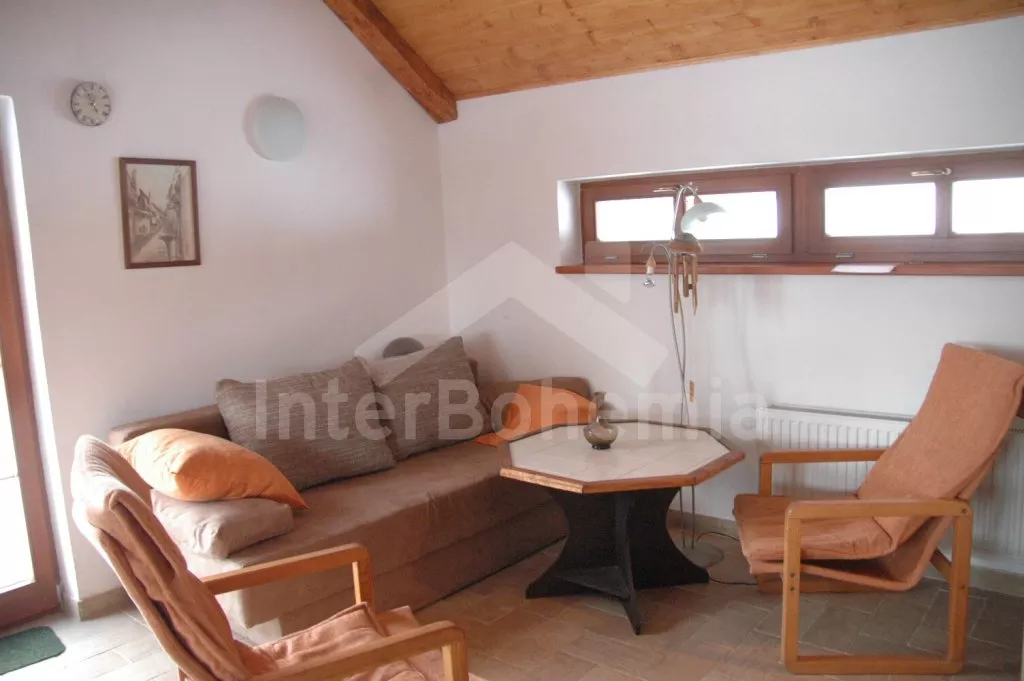 Volně stojící chata, atypicky, zajímavě architektonicky řešená, šikmé stropy a použití dřeva působí útulně. Vstup, hala, prostorný obývací pokoj se sedací soupravou (zároveň rozkládací lůžko pro 2… Více informací