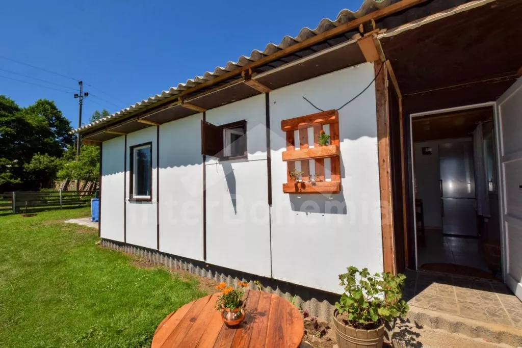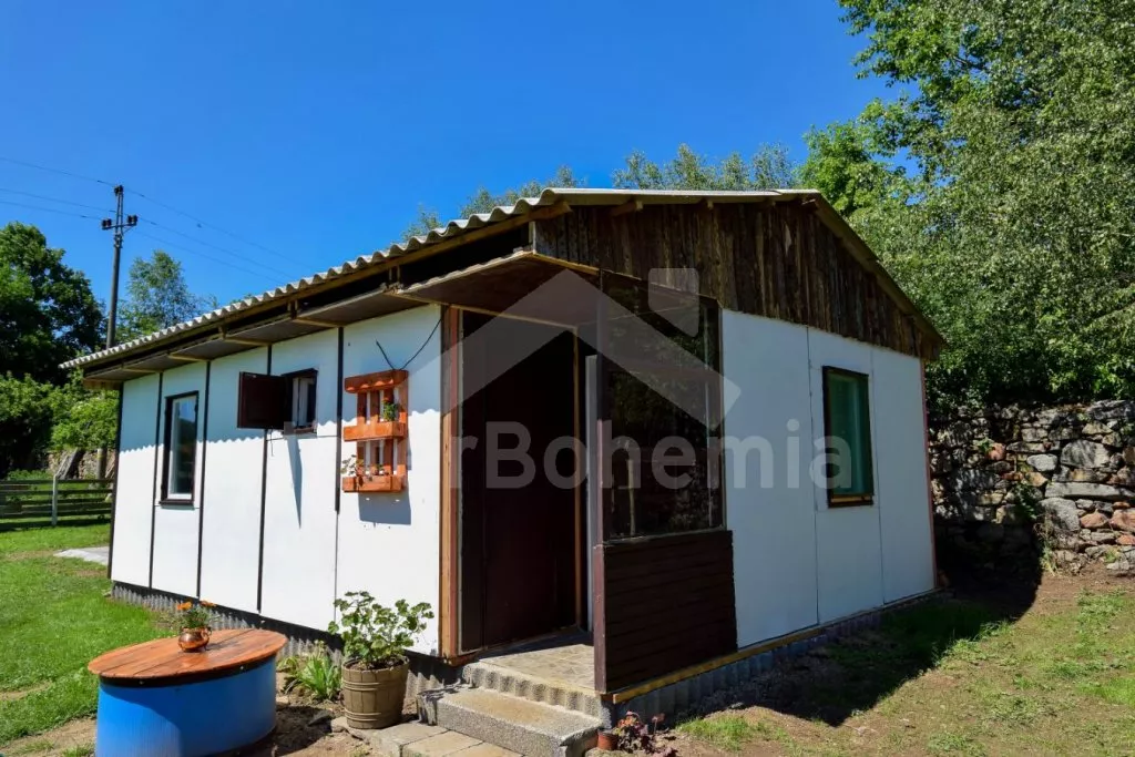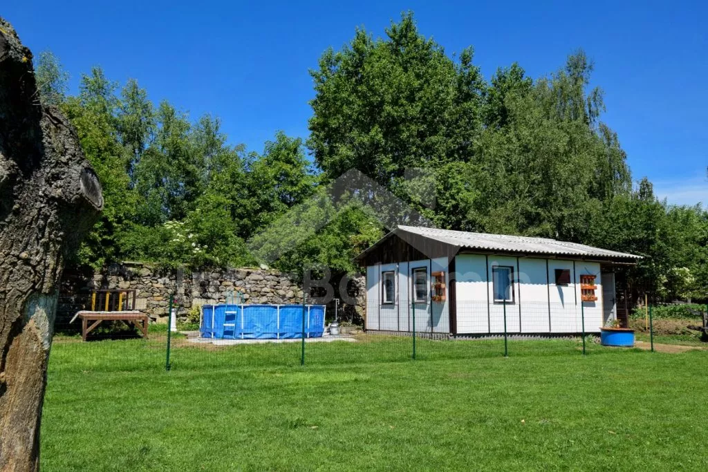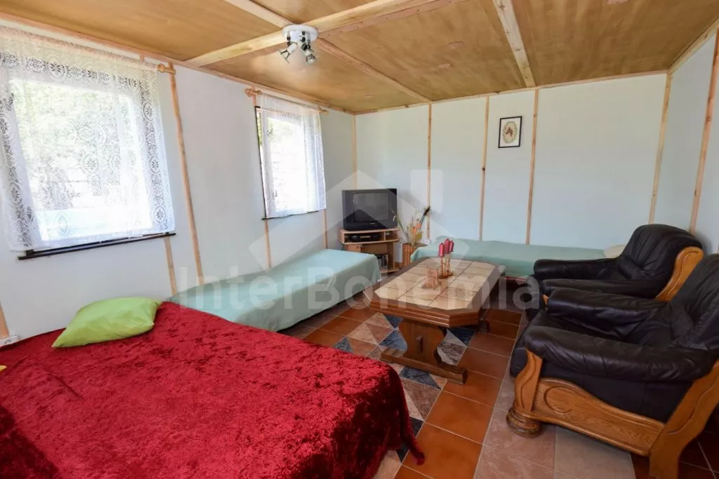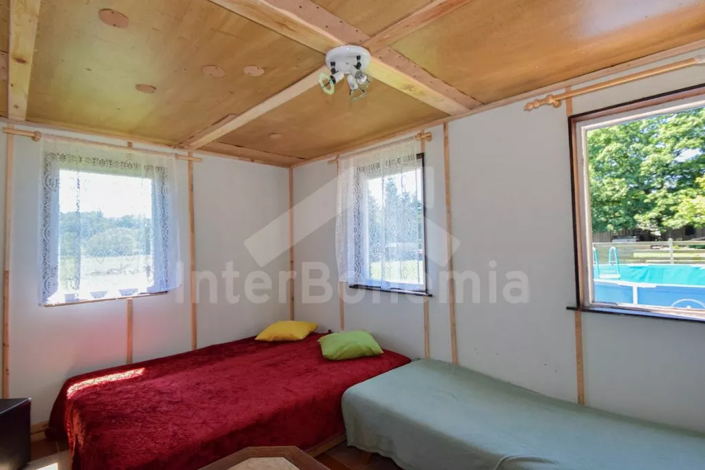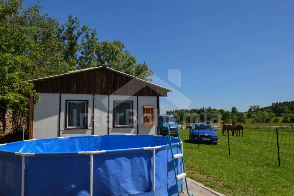 Volně stojící chatka s bazénem, na vlastním oploceném pozemku. Vstup, kuchyně spojena s jídelnou. Jídelní stůl, dvou plotýnkový elektrický vařič, mikrovlnná trouba, lednice s mrazákem, kávovar, rychlovarná konvice a nádobí. Obývací pokoj s dvoulůžkem, dvěma jednolůžky, křesly a televizí. Koupelna se sprchovým koutem, umyvadlem a WC. Vytápění chaty elektrickým topením. Oplocená zahrada s grilovacím kamenem a grilem nad ohništěm, venkovním posezením a nadzemním bazénem o průměru 3,60 m. Parkování přímo u chaty až pro 2 vozidla.