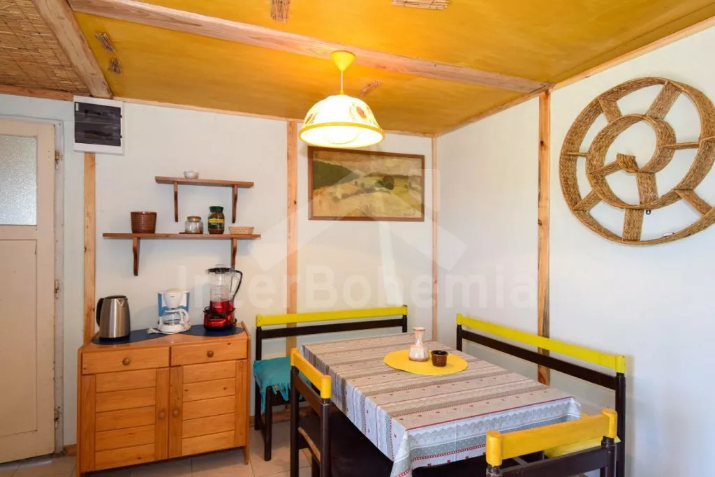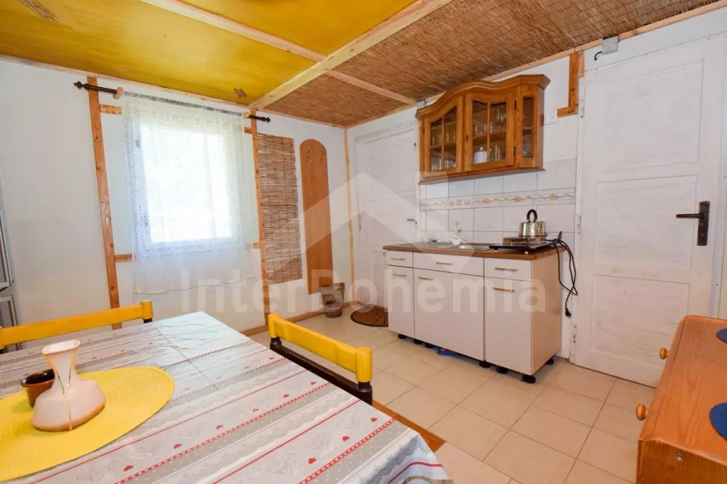 Volně stojící chatka s bazénem, na vlastním oploceném pozemku. Vstup, kuchyně spojena s jídelnou. Jídelní stůl, dvou plotýnkový elektrický vařič, mikrovlnná trouba, lednice s mrazákem, kávovar,… Více informací