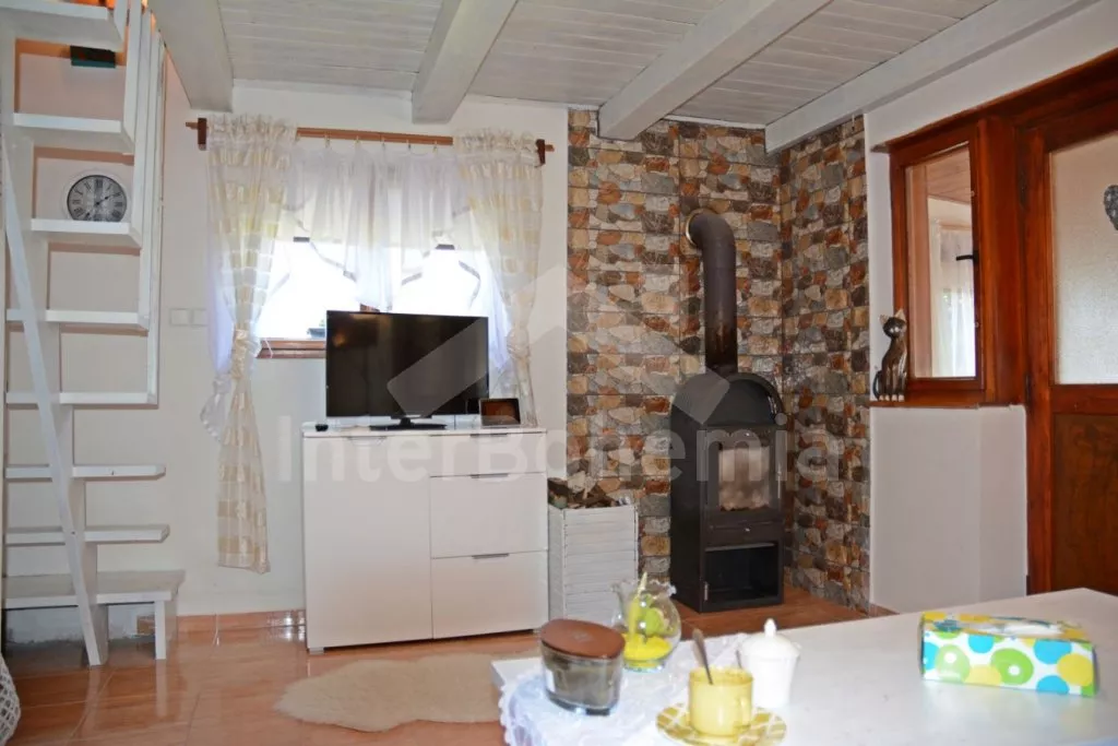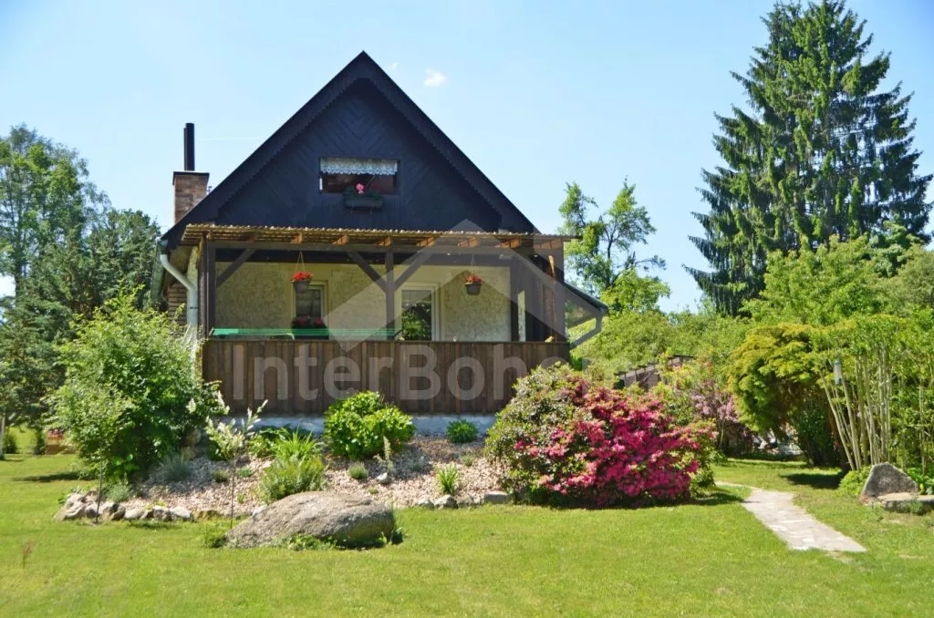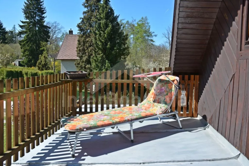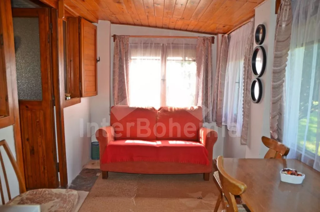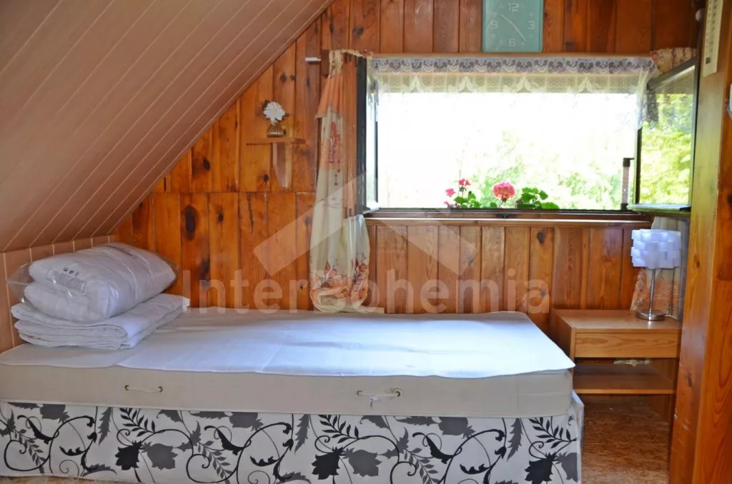 Velmi komfortně zařízená třípodlažní chata, částečně zrenovovaná v roce 2018. Vstup, veranda, obývací pokoj se sedací soupravou, konferenčním stolkem, LCD televizí a kamny na dřevo. Dále k dispozici druhý menší kuchyňský kout vč. pračky, ze kterého je vstup na krytou terasu s posezením. V suterénu objektu se nachází samostatná kuchyně s jídelním stolem pro 4 osoby. Kuchyňská linka se sporákem (elektrickým), troubou, mikrovlnnou troubou, lednicí s mrazákem, rychlovarnou konvicí a nádobím. V podkroví ložnice s dvoulůžkem a dvěma jednolůžky. Z ložnice je vstup na menší prosluněnou terasu s lehátkem, odkud je krásný výhled na okolí. Koupelna se sprchovým koutem, umyvadlem a wc. Vytápění objektu kamny, která prohřejí celou chatu. Voda pouze užitková. Hosté mají k dispozici krytou terasu s posezením, dále v zahradě druhé posezení s přenosným grilem, pro děti pak pískoviště a houpačka. Parkování na pozemku pro 2 osobní automobily.