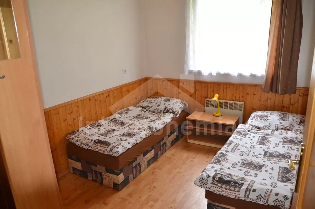 Objekt A: Vstup, chodba, obývací pokoj se sedací soupravou, jídelním stolem, televizí a krbovými kamny. Kuchyně se dvěma elektrickými varnými plotýnkami, lednicí, varnou konvicí a kávovarem. Koupelna se sprchou, samostatná toaleta. Tři ložnice – první s dvojlůžkem a další dvě každá se dvěma samostatnými lůžky. Objekt B: Vstup, chodba, obývací pokoj se sedací soupravou, jídelním stolem, televizí a krbovými kamny. Kuchyně se dvěma elektrickými varnými plotýnkami, lednicí, varnou konvicí a kávovarem. Koupelna se sprchou, samostatná toaleta. Dvě ložnice – první s dvojlůžkem a druhá se dvěma samostatnými lůžky. Elektrické vytápění. Chata stojí na oploceném pozemku, k dispozici je společná terasa a ohniště. Vlastní parkoviště v areálu.