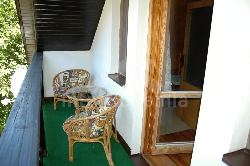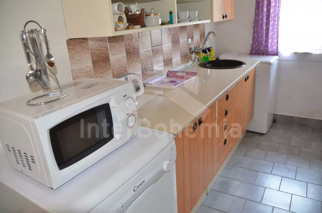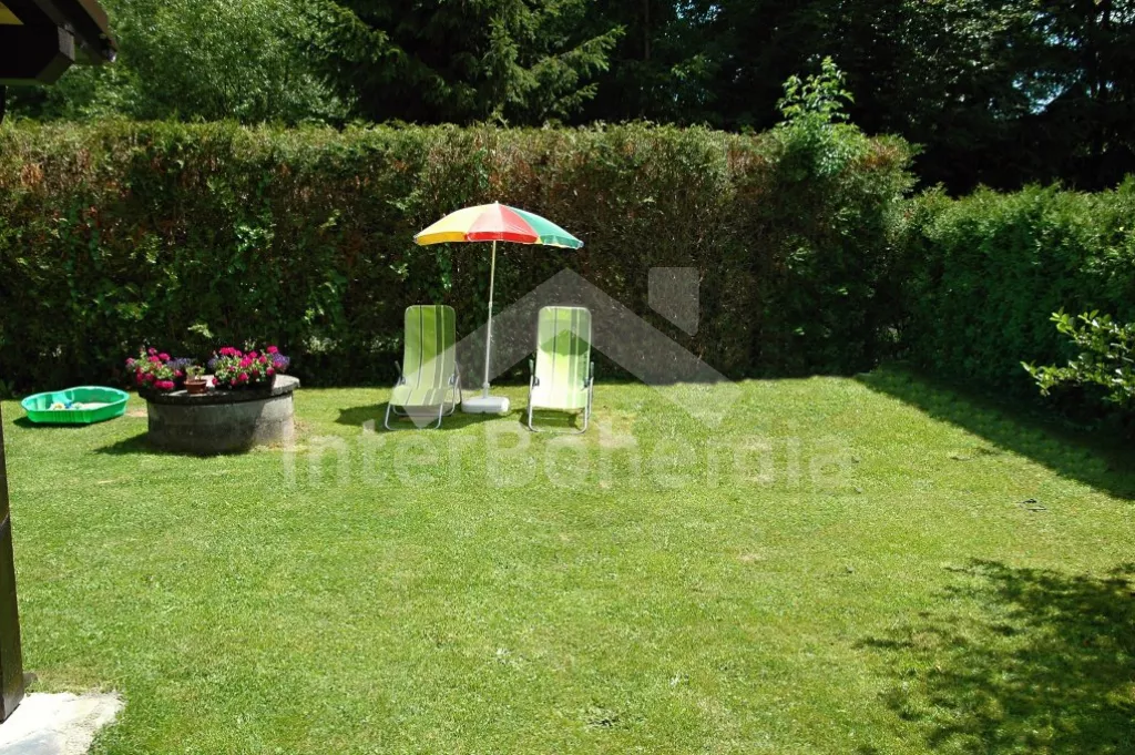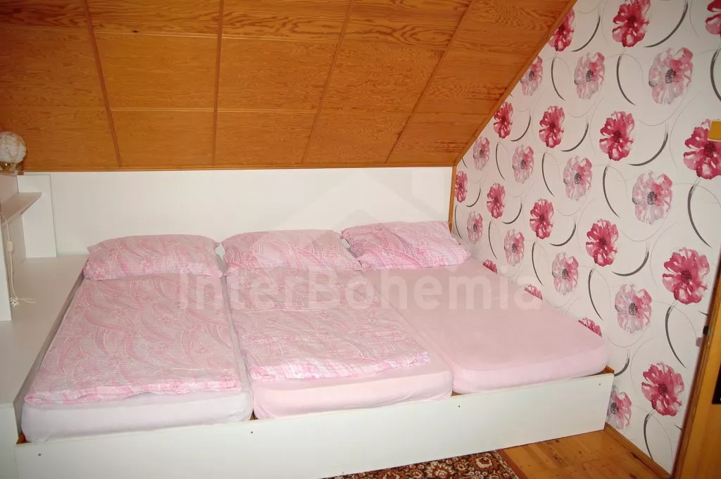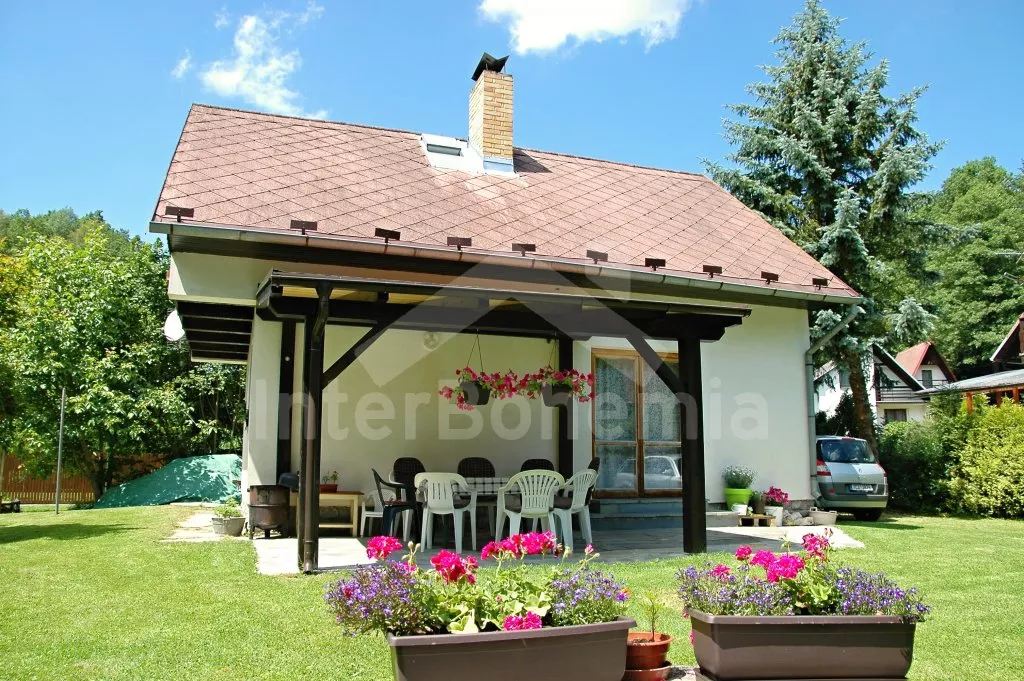 Chata k samostatnému obývání, příjemně a jednoduše zařízená. Vstup, chodba, obývací pokoj se sedací soupravou (extra lůžko pro 1 osobu), televizí, jídelním koutem a vstupem na terasu. Otevřená kuchyně s elektrickým sporákem, lednicí, mrazákem, myčkou nádobí, varnou konvicí a mikrovlnnou troubou. Koupelna se sprchou a toaleta zvlášť. V patře se nachází tři ložnice. První ložnice s trojlůžkem a dětskou postýlkou, druhá ložnice se dvěma samostatnými lůžky a třetí ložnice také se dvěma samostatnými lůžky. Z druhé a třetí ložnice je vchod na balkon. Vytápění el. přímotopy a malými krbovými kamny. K dispozici je upravovaná zahrada, částečně se živým plotem, dřevěnou pergolou se zahradním nábytkem, přenosným grilem a dětským pískovištěm. Parkování u chaty na pozemku.