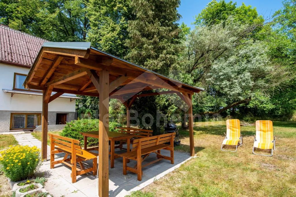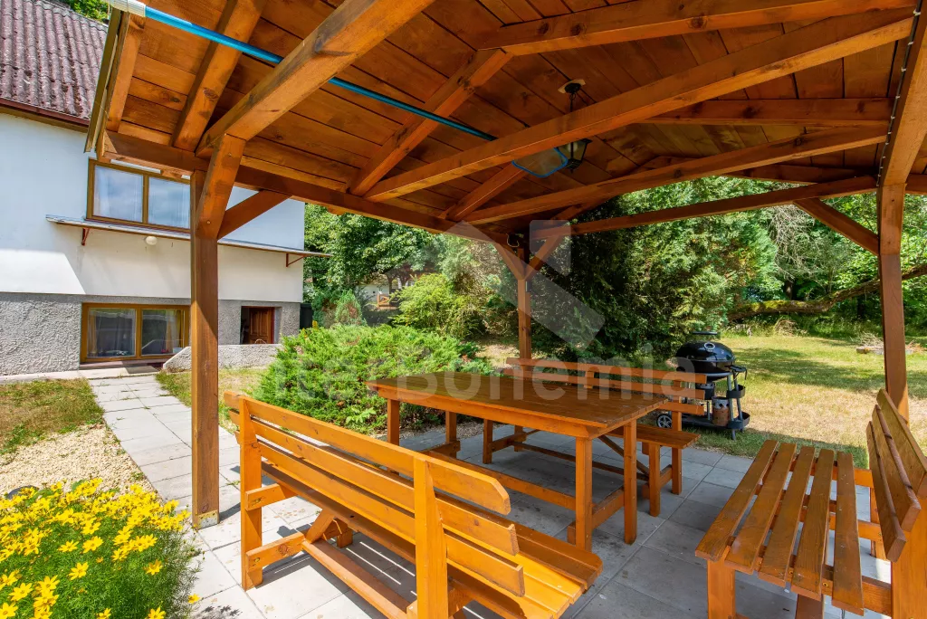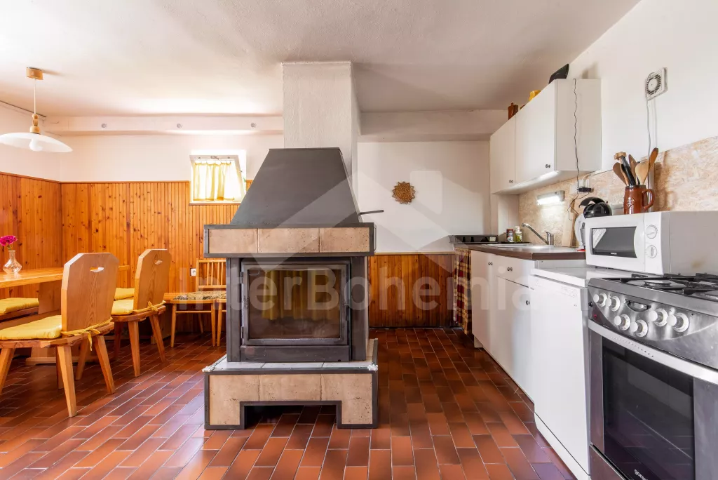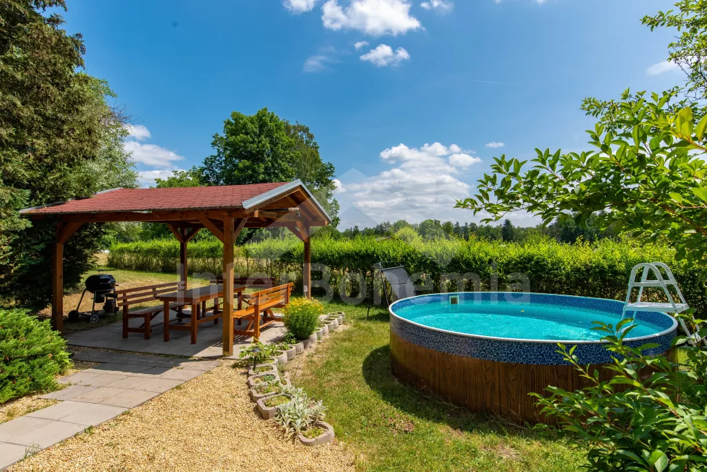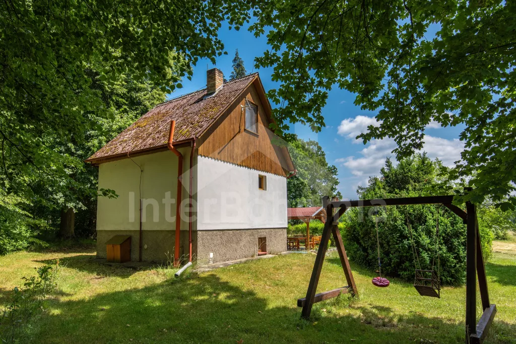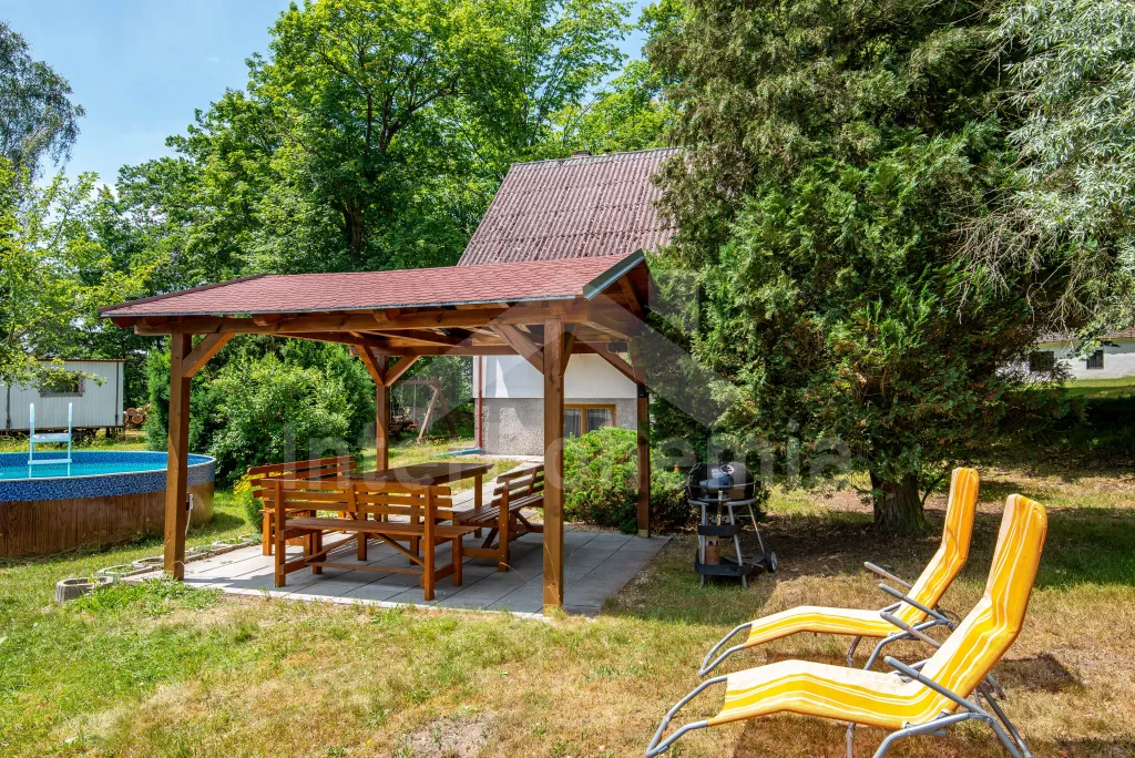 Volně stojící zděná chata s nadzemním bazénem a krytou pergolou s výhledem do lesa. V přízemí kuchyně s jídelním stolem, krbovými kamny a linkou s plynovým sporákem, mikrovlnnou troubou, varnou… Více informací
