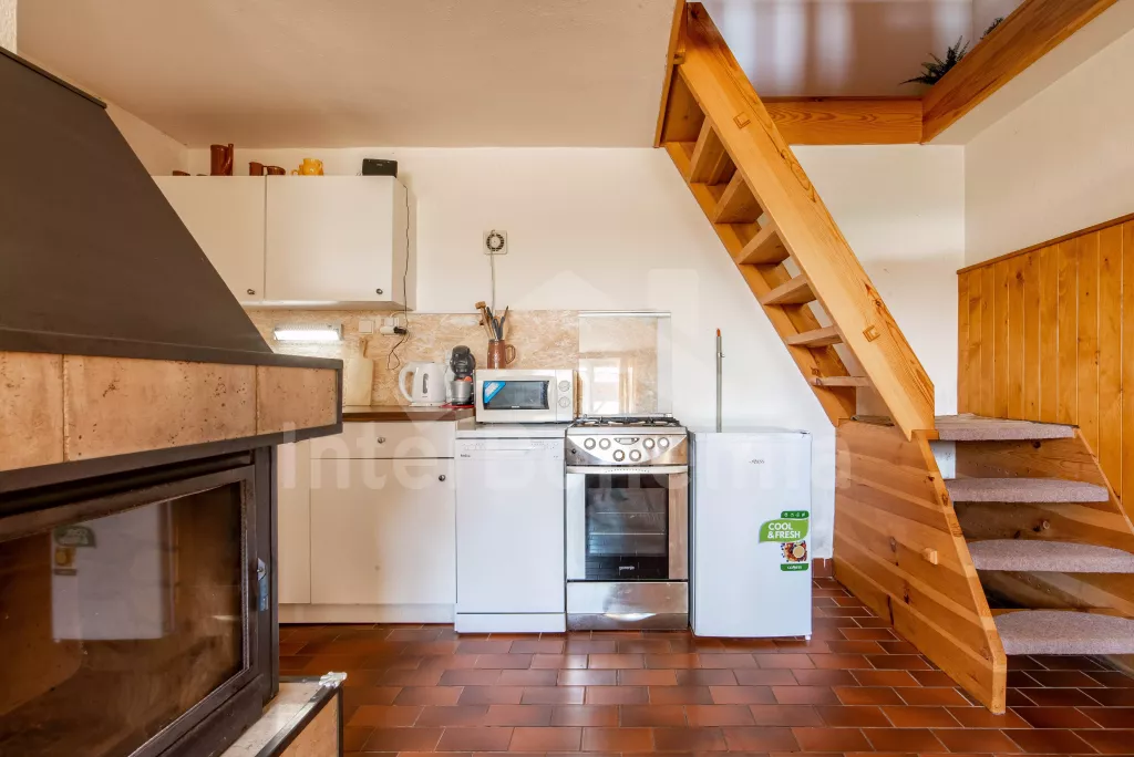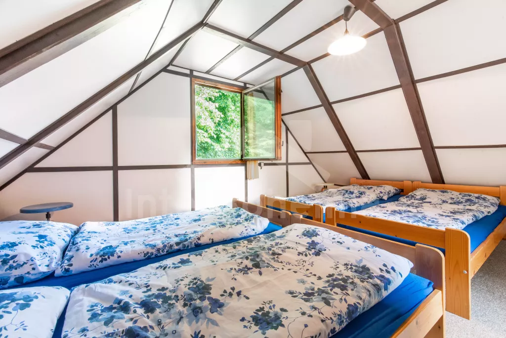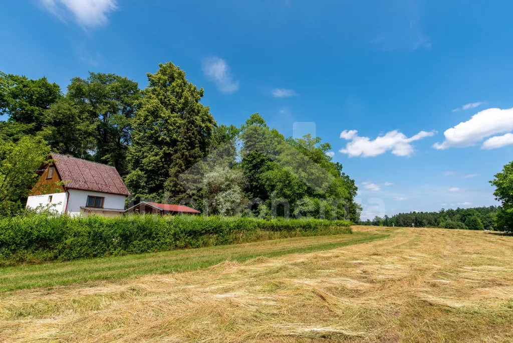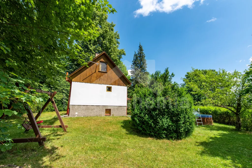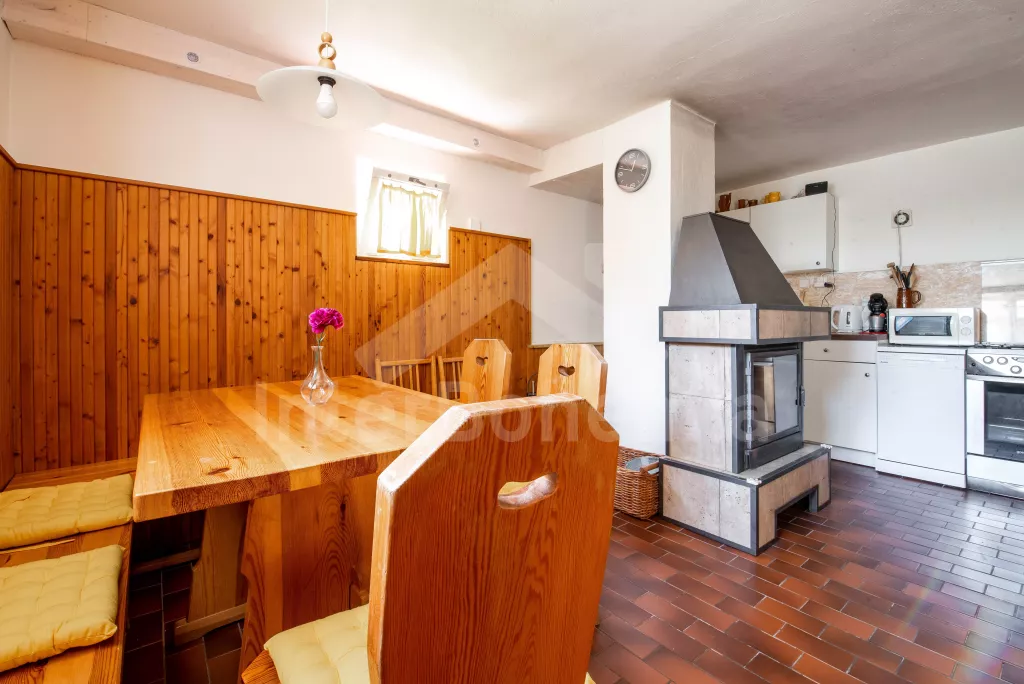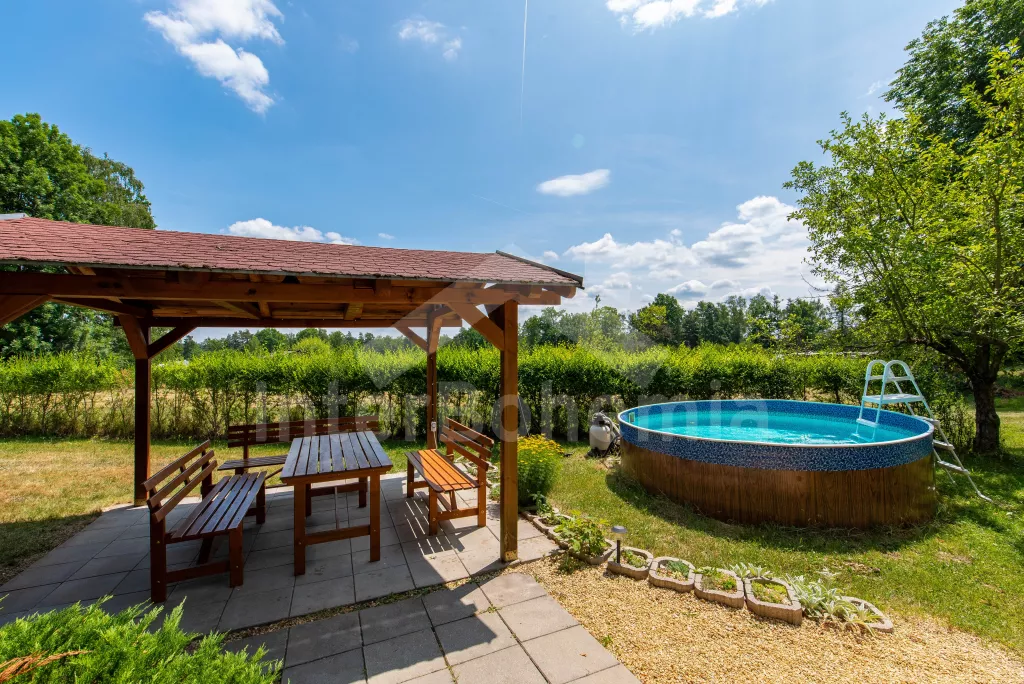 Volně stojící zděná chata s nadzemním bazénem a krytou pergolou s výhledem do lesa. V přízemí kuchyně s jídelním stolem, krbovými kamny a linkou s plynovým sporákem, mikrovlnnou troubou, varnou… Více informací