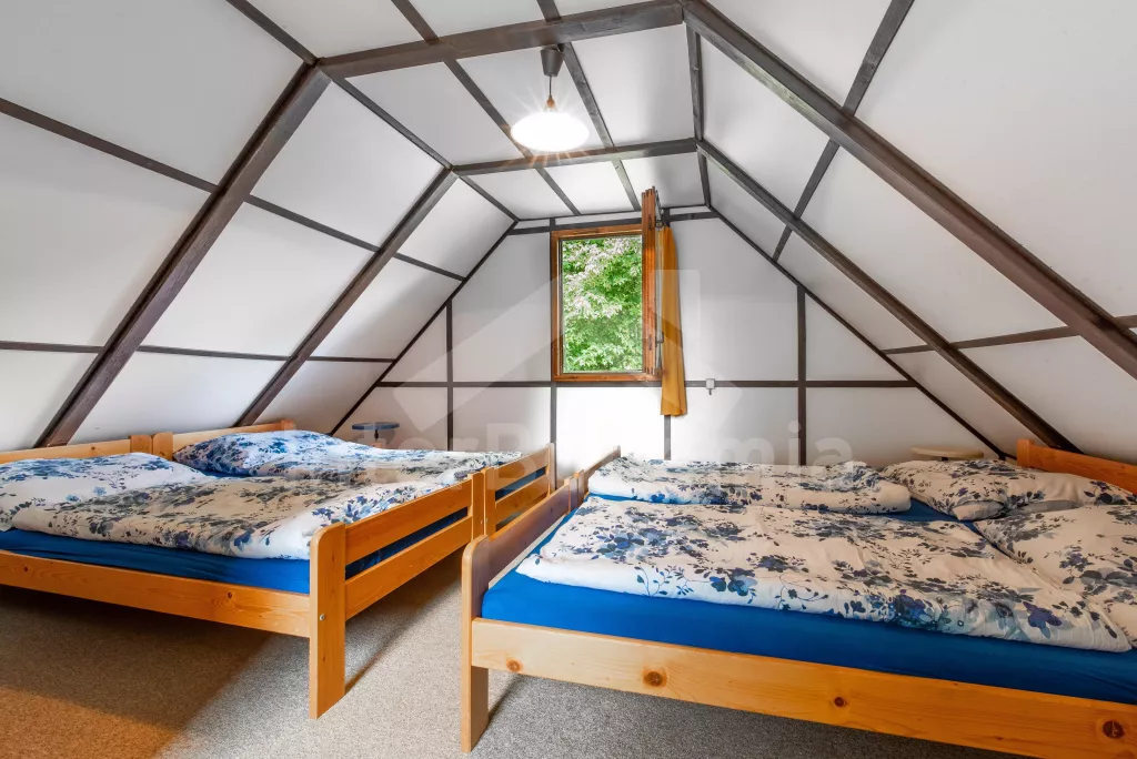 Volně stojící zděná chata s nadzemním bazénem a krytou pergolou s výhledem do lesa. V přízemí kuchyně s jídelním stolem, krbovými kamny a linkou s plynovým sporákem, mikrovlnnou troubou, varnou konvicí, lednicí a myčkou. V prvním patře sedací souprava (extra dvoulůžko), TV a koupelna se sprchovým koutem, umyvadlem a WC. Schody do přízemí s dětskou ohrádkou. V podkroví dvě dvoulůžka a pohovka (rozložitelná na extra lůžko). Vytápění chaty krbovými kamny. Na zahradě k dispozici krytá pergola s posezením a grilem, nadzemní bazén, zahradní lehátka a houpačka pro děti. Parkování u objektu.
