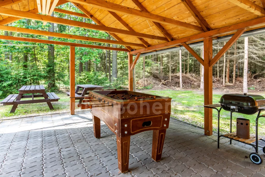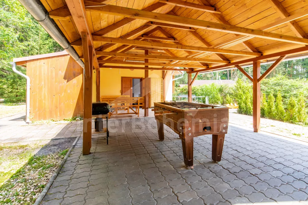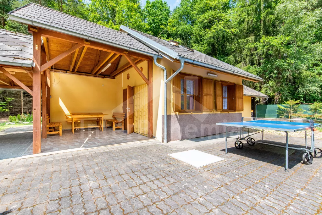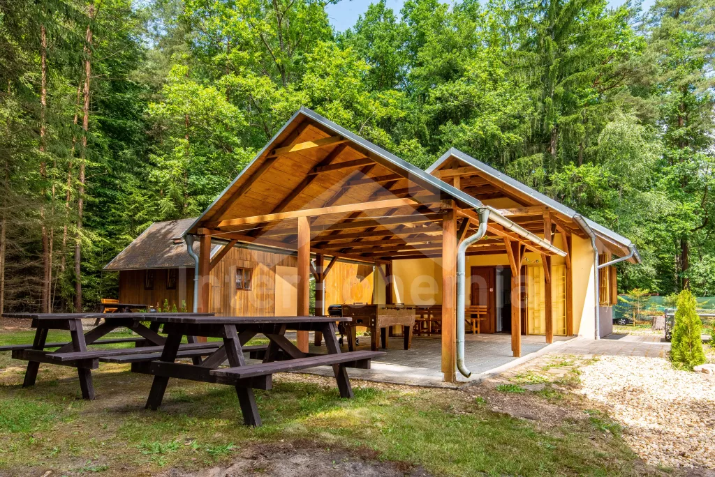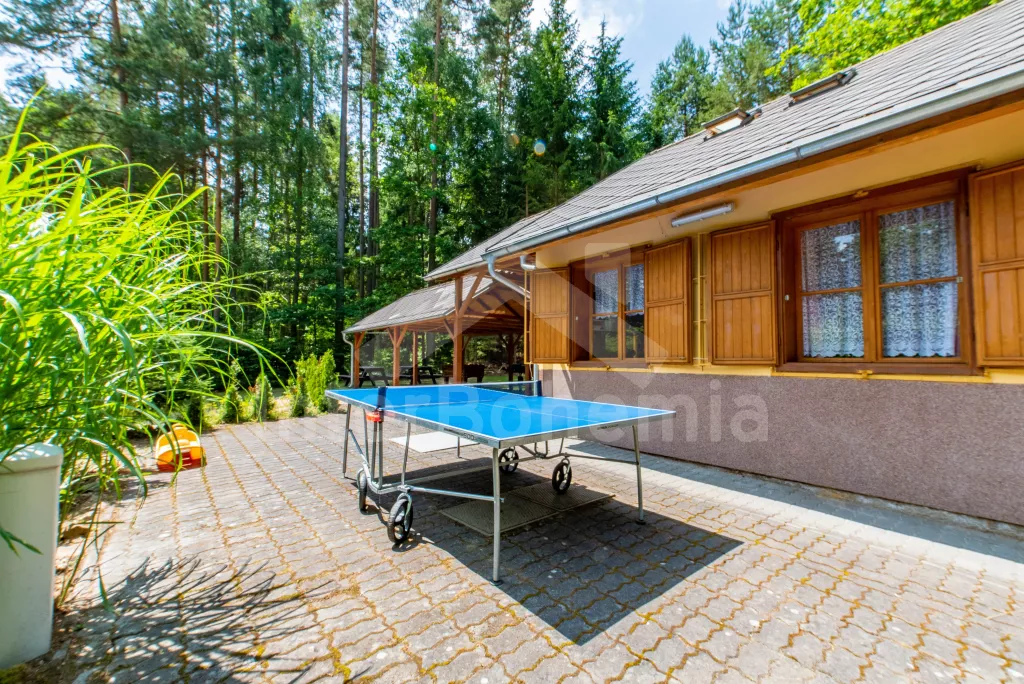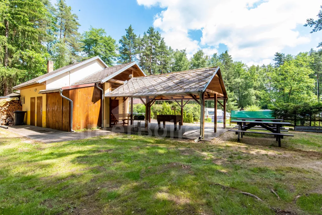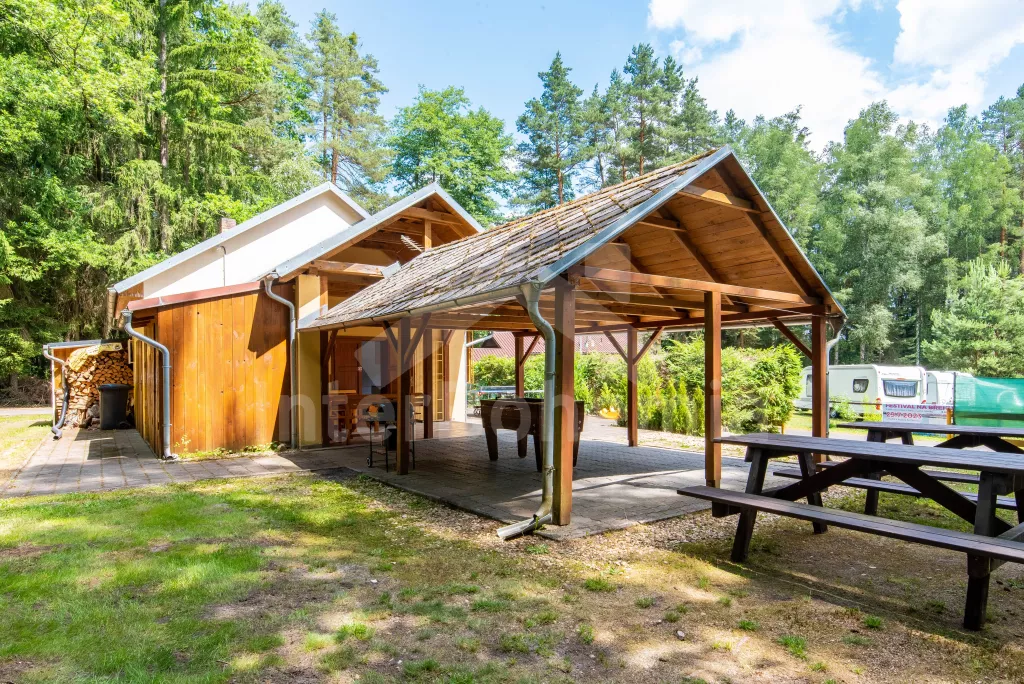 Nově a čistě zařízená chata s prostornou terasou s výhledem do lesa, na pobřeží Staňkovského rybníka. V přízemí kuchyňský kout s keramickou plotýnkou, mikrovlnnou troubou, lednicí, mrazákem, kávovarem, varnou konvicí a myčkou. Obývací pokoj s jídelním stolem, pohovkou (extra dvoulůžko) a TV. Koupelna se sprchovým koutem, umyvadlem a WC. V podkroví ložnice se čtyřmi lůžky. Vytápění objektu krbovými kamny. Hosté mají k dispozici prostornou krytou pergolu s posezením a stolním fotbalem, ping pongový stůl a zahradní gril.