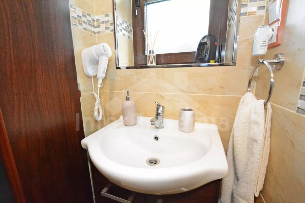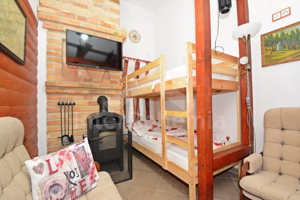 V levé části (E) obývací místnost spojená s kuchyní. Kuchyňská linka s indukční dvouplotýnkovou varnou deskou, mikrovlnnou troubou, lednicí s integrovaným mrazákem, rychlovarnou konvicí a nádobím. V obývací místnosti jídelní barový pult, pohovka, LCD televize se satelitem a krbová kamna. Ložnice s dvoulůžkem a palandou. Koupelna se sprchovým koutem, umyvadlem a wc. Vytápění objektu lokální kamny.