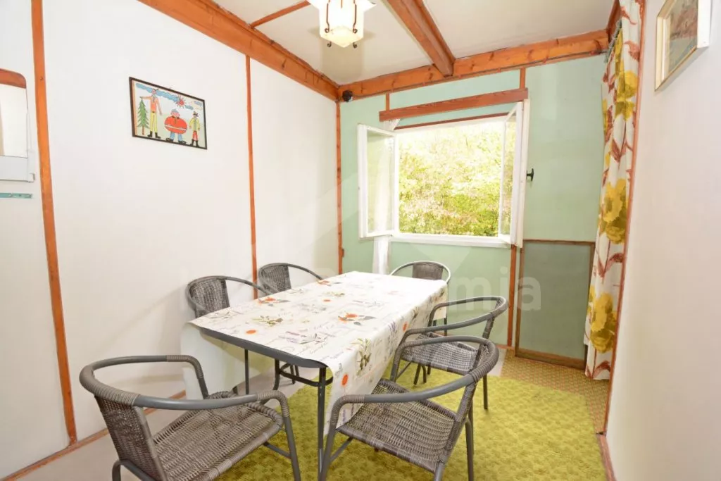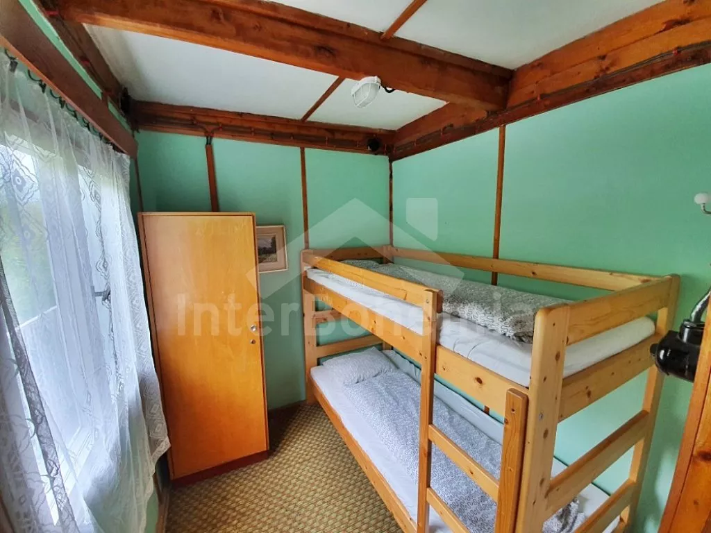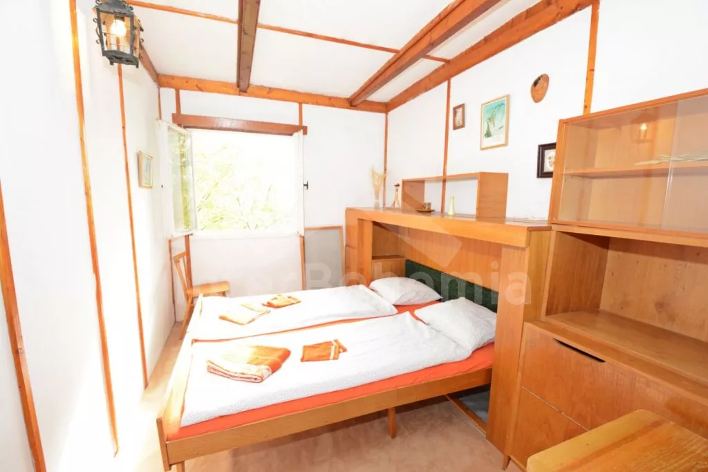 Dvoupodlažní chata s vlastní zahradou s posezením v pergole (altánu), druhé posezení u ohniště, skvělá dostupnost pár minut pěšky k vodě. Vstup, hala, prostorný obývací pokoj se sedací soupravou, konferenčním stolkem a LCD televizí. Samostatná kuchyně s jídelním stolem pro 3-4 osoby. Kuchyňská linka s elektrickým dvouplotýnkovým vařičem, mikrovlnnou troubou, lednicí s integrovaným mrazákem (Samsung), rychlovarnou konvicí a nádobím. V kuchyni teče pouze studená (pitná) voda. První ložnice s dvoulůžkem. Druhá ložnice s dvoulůžkem a jedním jednolůžkem. Dále místnost s jídelním stolem pro 7 osob, která je spojena s třetí ložnicí - dětským pokojem s palandou. Samostatná druhá kuchyně (dvouplotýnkový elektrický vařič, mikrovlnná trouba, rychlovarná konvice). Koupelna se sprchovým koutem a umyvadlem. Samostatné WC. Druhý jednoduchý sprchový kout s teplou vodou přístupný zvenčí. Vytápění chaty elektrickými přímotopy. Hosté mají k dispozici zahradní posezení v pergole, přenosný gril (vlastní dřevěné uhlí), společné ohniště a parkování pro 1 automobil přímo u chaty.