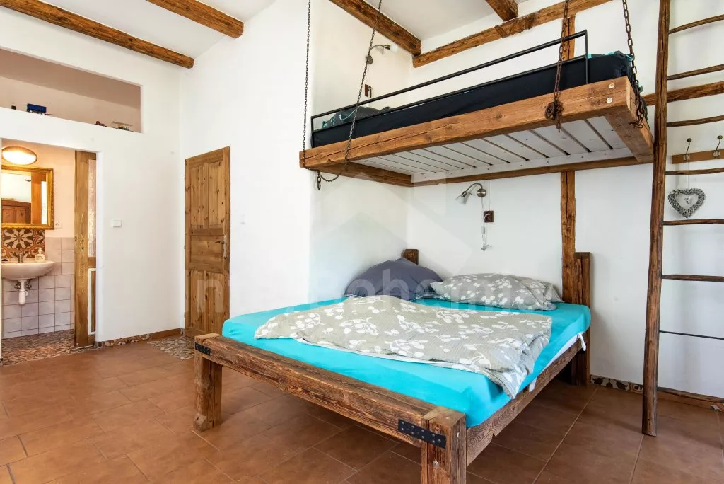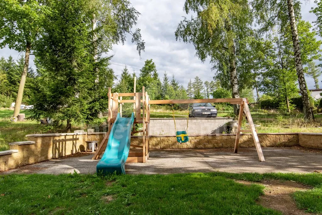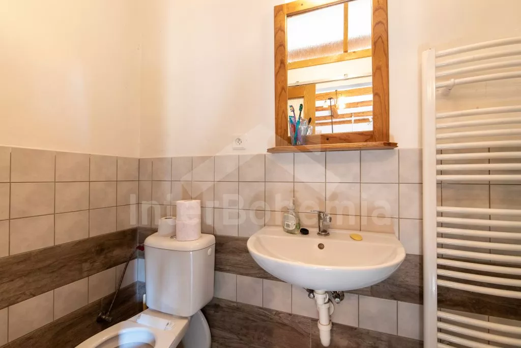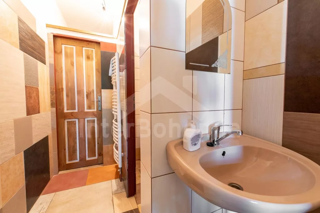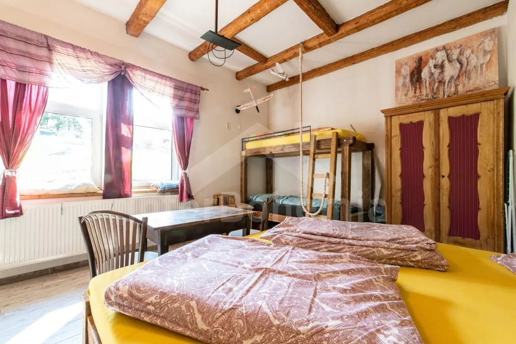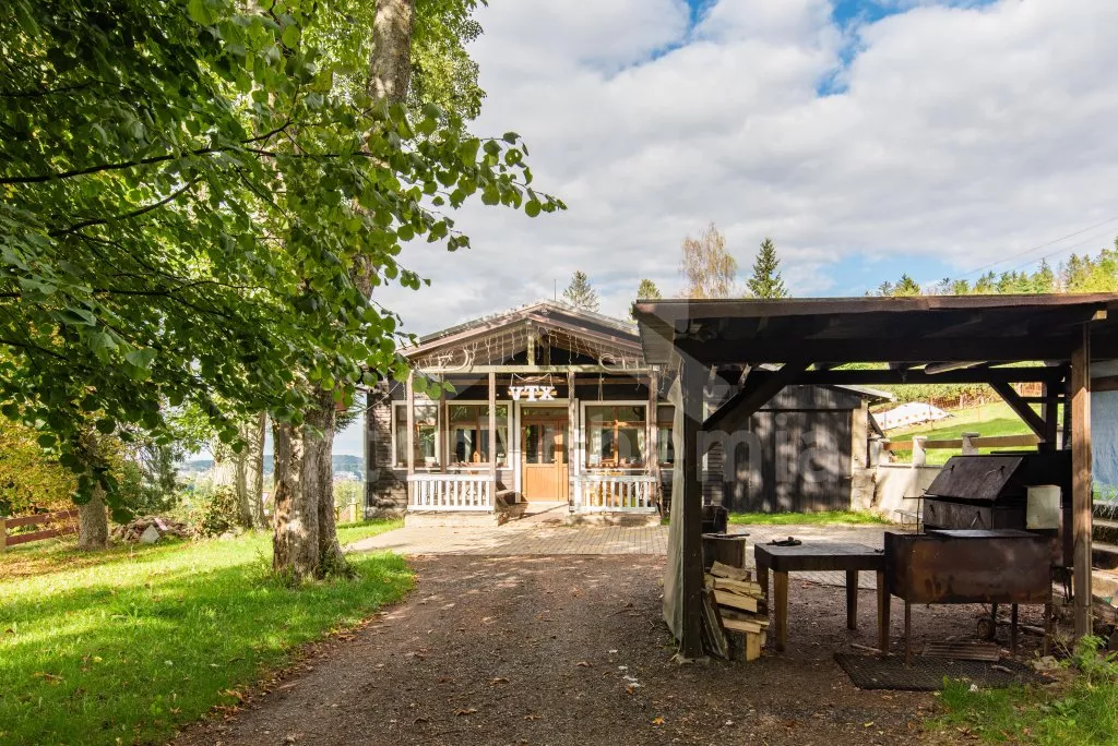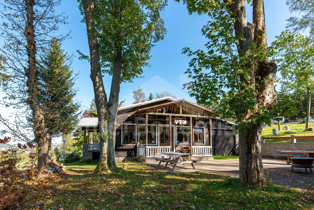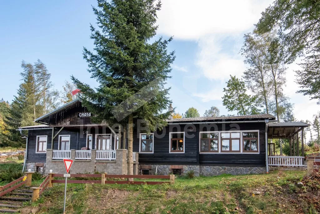 Volně stojící prostorná chata s výhledem na město a okolní přírodu. Vstup přes verandu. Vstupní hala s posezením, funkčním výčepem a chladicí vitrínou. U výčepu také trouba, mikrovlnná trouba, varná konvice, dřez a nádobí. Velká společenská místnost s jídelními stoly a krbovými kamny. Samostatné dámské a pánské toalety. Ze společenské místnosti vstup do chodby vedoucí ke třem ložnicím. První ložnice s dvoulůžkem, palandou, vstupem na zahradu a vlastní koupelnou se sprchovým koutem, umyvadlem a WC. Druhá ložnice s dvoulůžkem, druhým závěsným dvoulůžkem, vstupem na terasu a vlastní koupelnou se sprchovým koutem, umyvadlem a WC. Třetí ložnice se dvěma dvoulůžky a vlastní koupelnou. K dispozici televize. Vytápění objektu centrálně na pevná paliva a lokálními přímotopy. K dispozici neoplocená zahrada, venkovní posezení a ohniště. Parkoviště přímo u objektu.