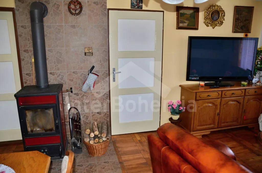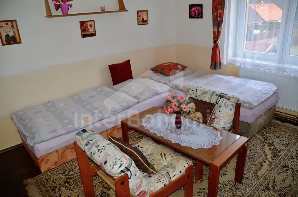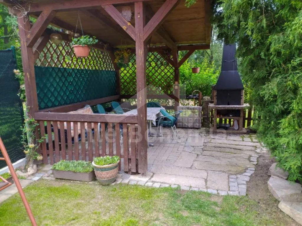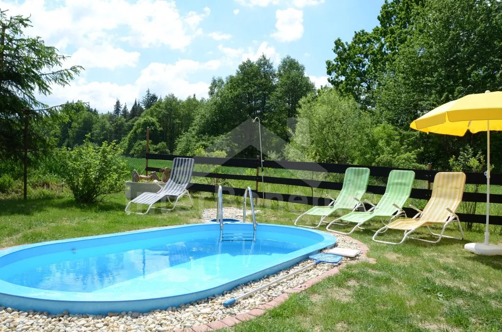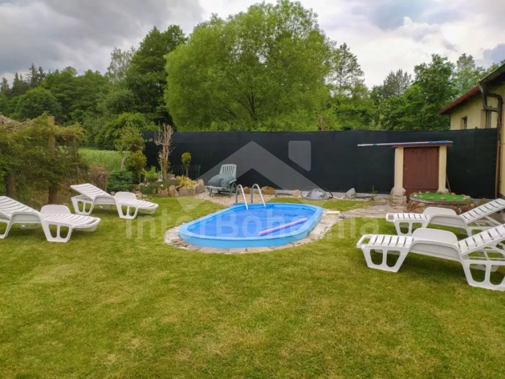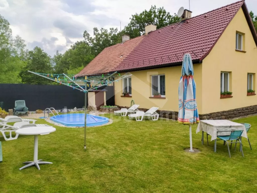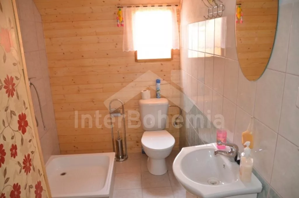 Volně stojící rekreační dvojdomek, v němž obýváte jednu polovinu. Druhá polovina je oddělena neprůhledným plotem. Domek byl v roce 2016 částečně zrenovován a je pohodlně zařízený. Vstup přes částečně zastřešenou terasu, chodba, samostatná toaleta. Obývací pokoj s pohovkou, křeslem, jídelním koutem pro 5 osob, krbovými kamny na dřevo a televizí. Kuchyně s elektrickým sporákem, lednicí, kávovarem, mikrovlnnou troubou a varnou konvicí. Koupelna s vanou a umyvadlem. Ložnice s dvojlůžkem, jedním samostatným lůžkem a dětskou postýlkou. Z chodby vedou příkré dřevěné schody do podkroví, kde se nachází malá hala s posezením a druhá ložnice se třemi samostatnými lůžky. Samostatná toaleta se sprchou a umyvadlem. Vytápění krbovými kamny na dřevo (s rozvodem pro radiátory po celém objektu). Domek stojí v kompletně oplocené zahradě. K dispozici je zastřešená terasa (pergola) se zahradním krbem, zahradní nábytek, houpací lavice, pískoviště, houpačka a zapuštěný bazén 4 x 2 m se zabudovanou filtrací. Parkování u domu za plotem a pod přístřeškem.