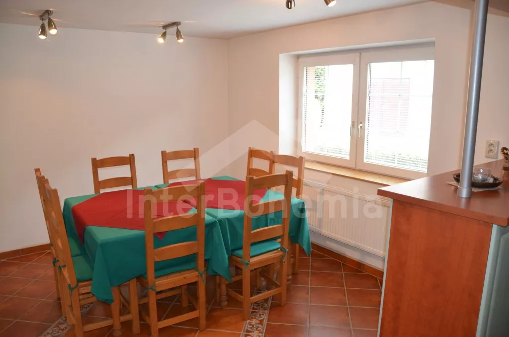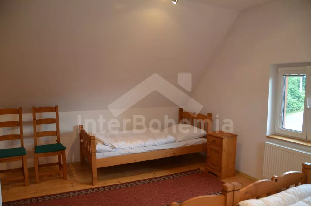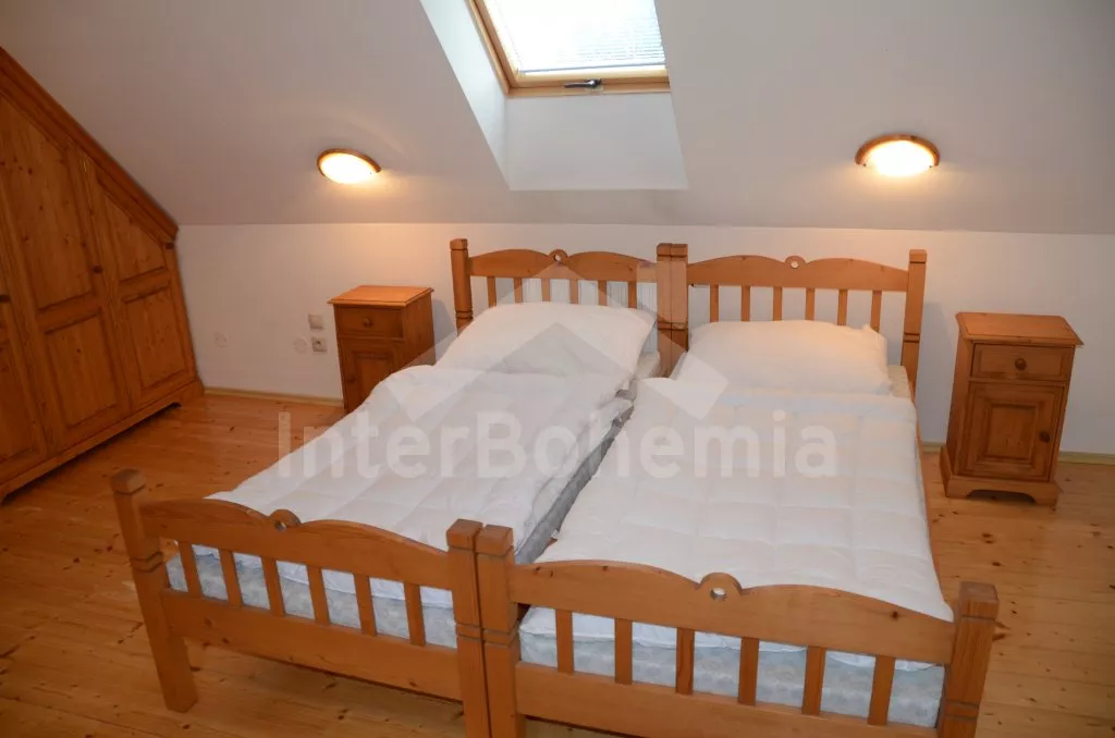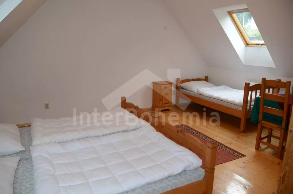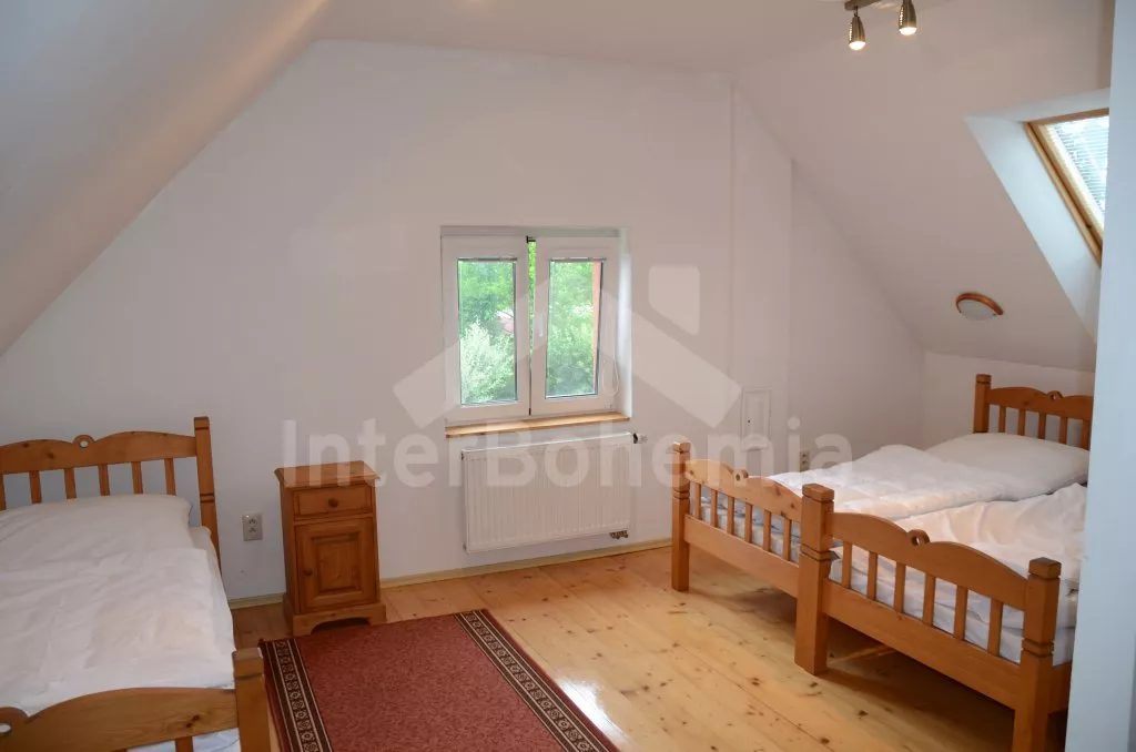 Velký, prostorný a příjemně zařízený dům, rekonstruovaný v roce 2007. Přístup k objektu je přes krásnou zahradu o rozloze 3 000 m2. Vstup, hala spojená s kuchyní, jídelnou, která zároveň slouží jako společenská místnost. V kuchyni horkovzdušná trouba se sklokeramickou varnou deskou, lednicí, mrazákem, kávovarem, rychlovarnou konvicí, mikrovlnnou troubou a myčkou na nádobí. V jídelně/společenské místnosti 2 jídelní stoly pro 6 a 8 lidí, kamna na dřevo, které slouží i jako ústřední vytápění. V hale samostatné wc. V zadní části objektu v přízemí 2 ložnice, každá s 2-mi jednolůžky a vlastní koupelnou s umyvadlem, sprchovým koutem a wc. V horním patře vpravo ložnice s dvoulůžkem, jednolůžkem a vlastní koupelnou s umyvadlem, sprchovým koutem a wc. V horním patře vlevo velká ložnice s dvoulůžkem, dvěma jednolůžky a opět vlastní koupelnou s umyvadlem, sprchovým koutem a wc. Objekt je vytápěn elektrickým topením, nebo ústředními kamny na dřevo ve společenské místnosti. Každá ze 4 koupelen má vlastní bojler o objemu 60l. Krásná oplocená zahrada s jezírkem o rozloze 3 000 m2, kryté posezení před vchodem, přenosný gril, zahradní nábytek, po dohodě s pronajímatelem možnost zapůjčení pivních lavic a stolů. Parkování pro 3 automobily na vlastním, oploceném pozemku.
