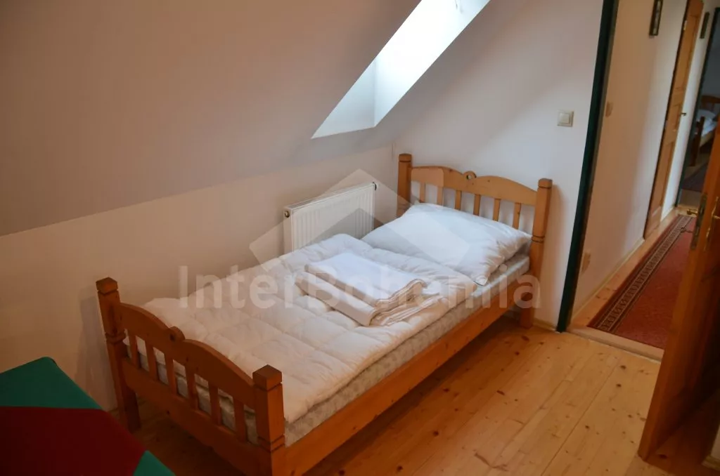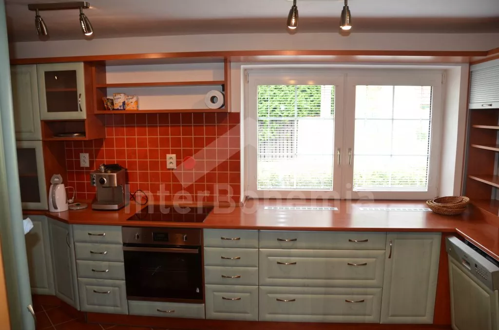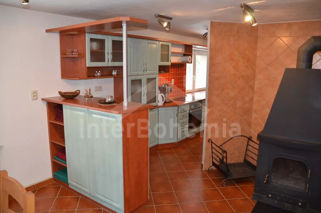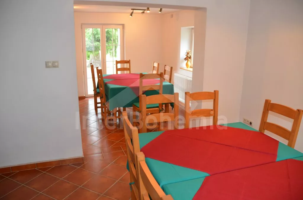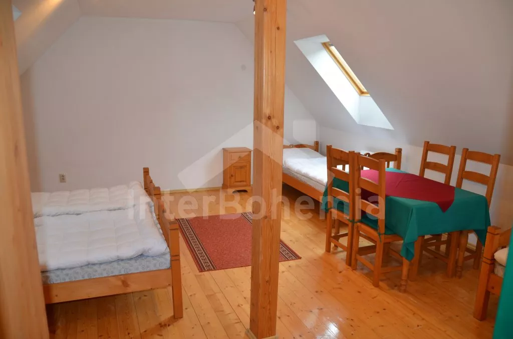 Velký, prostorný a příjemně zařízený dům, rekonstruovaný v roce 2007. Přístup k objektu je přes krásnou zahradu o rozloze 3 000 m2. Vstup, hala spojená s kuchyní, jídelnou, která zároveň slouží jako společenská místnost. V kuchyni horkovzdušná trouba se sklokeramickou varnou deskou, lednicí, mrazákem, kávovarem, rychlovarnou konvicí, mikrovlnnou troubou a myčkou na nádobí. V jídelně/společenské místnosti 2 jídelní stoly pro 6 a 8 lidí, kamna na dřevo, které slouží i jako ústřední vytápění. V hale samostatné wc. V zadní části objektu v přízemí 2 ložnice, každá s 2-mi jednolůžky a vlastní koupelnou s umyvadlem, sprchovým koutem a wc. V horním patře vpravo ložnice s dvoulůžkem, jednolůžkem a vlastní koupelnou s umyvadlem, sprchovým koutem a wc. V horním patře vlevo velká ložnice s dvoulůžkem, dvěma jednolůžky a opět vlastní koupelnou s umyvadlem, sprchovým koutem a wc. Objekt je vytápěn elektrickým topením, nebo ústředními kamny na dřevo ve společenské místnosti. Každá ze 4 koupelen má vlastní bojler o objemu 60l. Krásná oplocená zahrada s jezírkem o rozloze 3 000 m2, kryté posezení před vchodem, přenosný gril, zahradní nábytek, po dohodě s pronajímatelem možnost zapůjčení pivních lavic a stolů. Parkování pro 3 automobily na vlastním, oploceném pozemku.