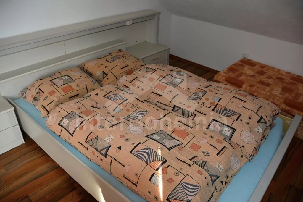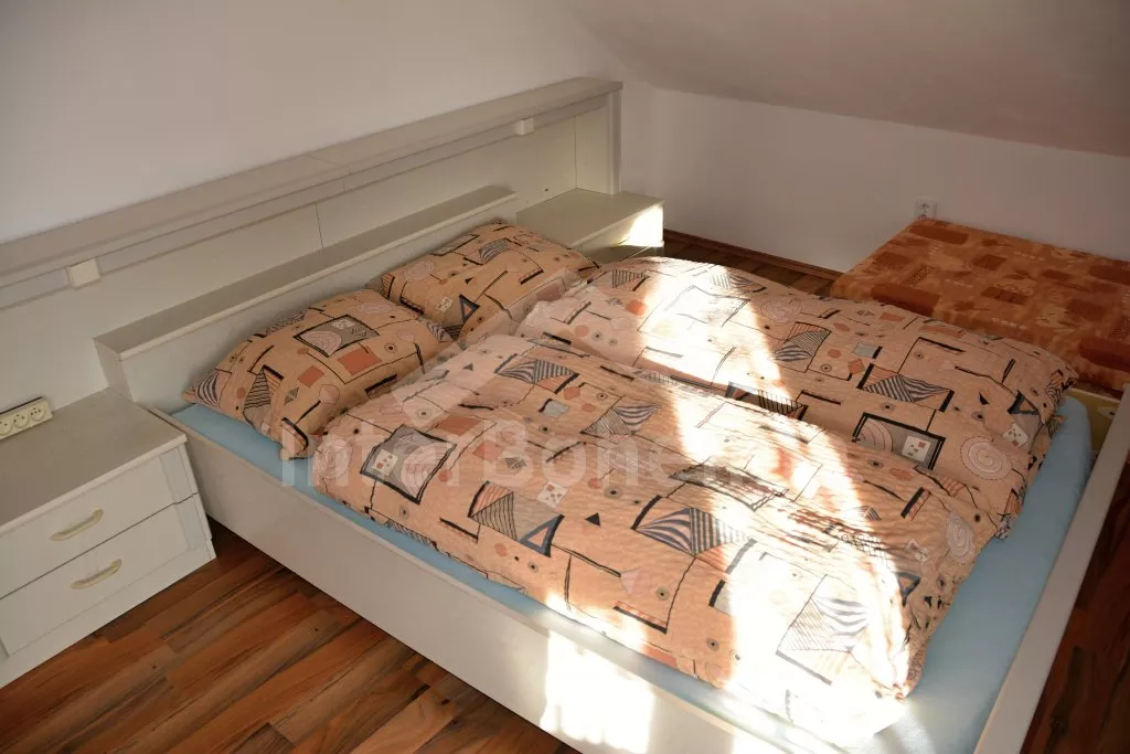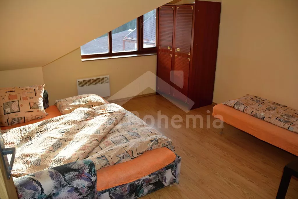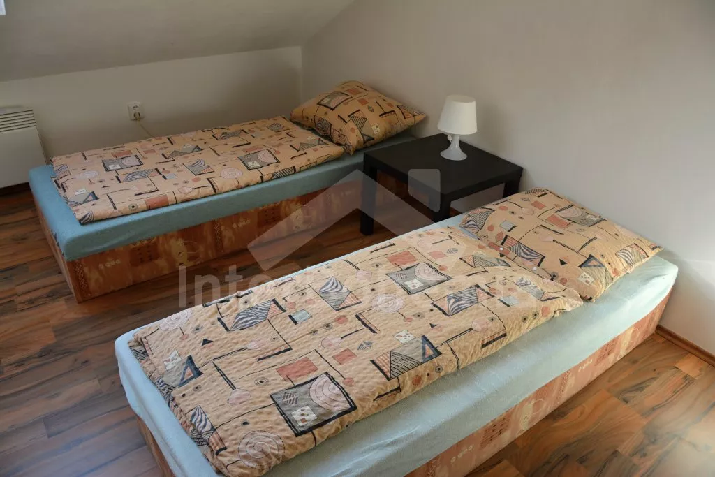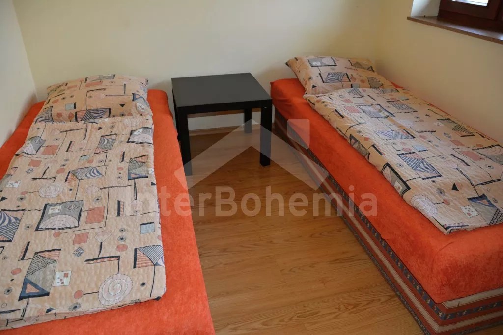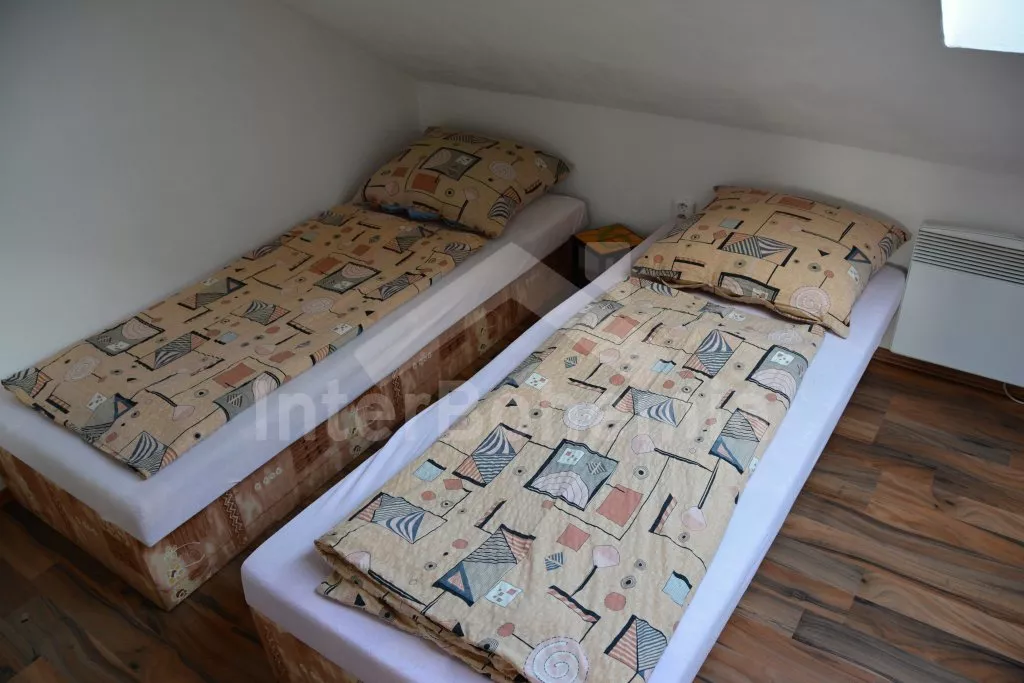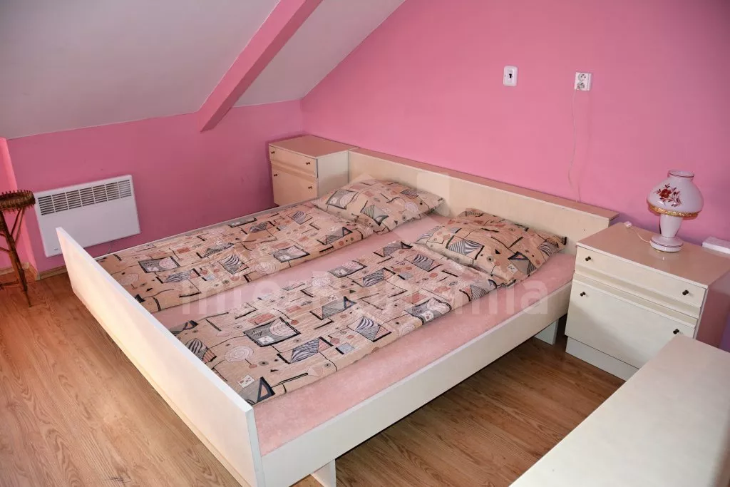 Rodinný dům s pensionem, pěkně zařízený. Vstup, prostorný obývací pokoj s posezením pro pro 12 osob, krbem, TV, jídelními stoly pro 18 osob, kuchyňským koutem s elektrickým sporákem s keramickou varnou deskou, mikrovlnnou troubou, varnou konvicí a dvěma chladničkami kombinovanými s mrazákem. Schodiště do patra, chodba, podkrovní společenská místnost s posezením pro 7 osob, 7 ložnic a koupelny. První a druhá ložnice s jedním dvojlůžkem a jedním samostatným lůžkem, třetí, čtvrtá a pátá ložnice se třemi samostatnými lůžky, šestá ložnice se dvěma samostatnými lůžky a sedmá ložnice s jedním dvojlůžkem a pěti samostatnými lůžky. Koupelna s vanou, sprchovým koutem, umyvadlem a pračkou, 2 samostatné toalet s umyvadlem. Vytápění je centrální elektrické. K dispozici je uzavřený dvůr se zahrádkou s posezením s venkovním krbem a nadzemní kulatý bazén o průměru 3 m.