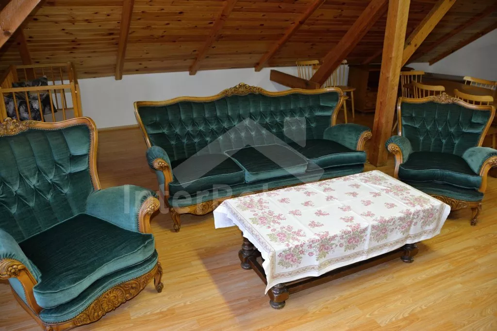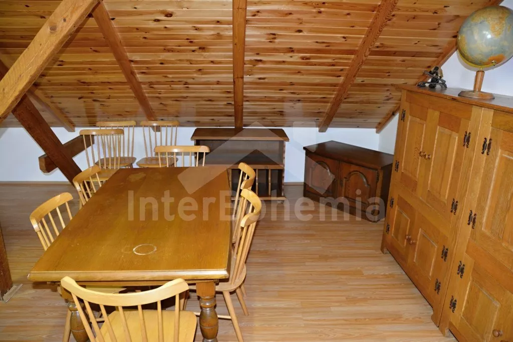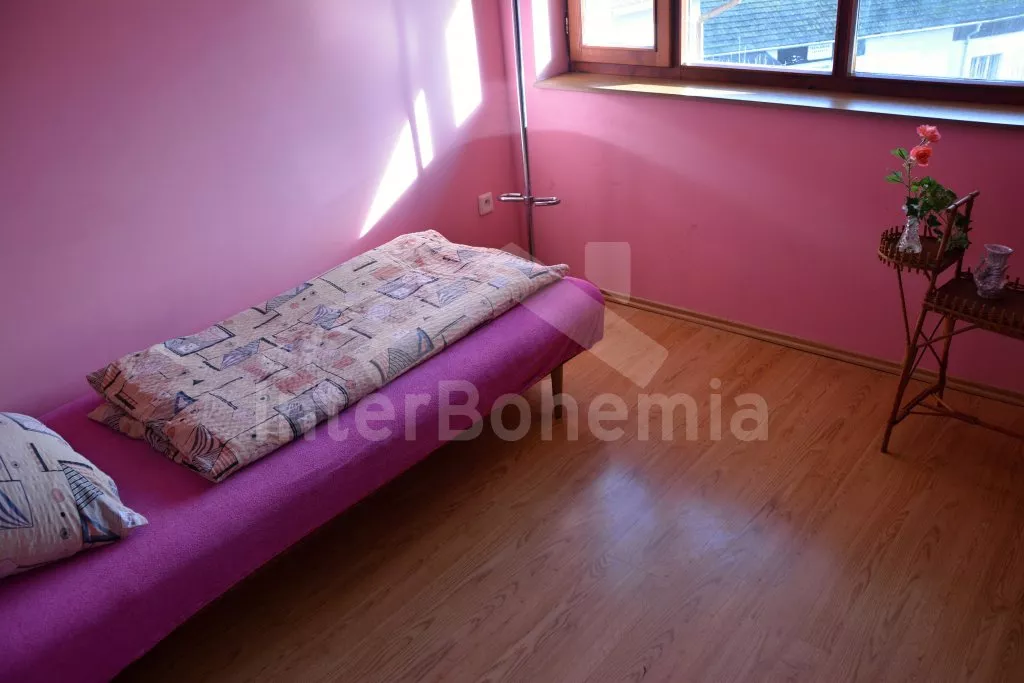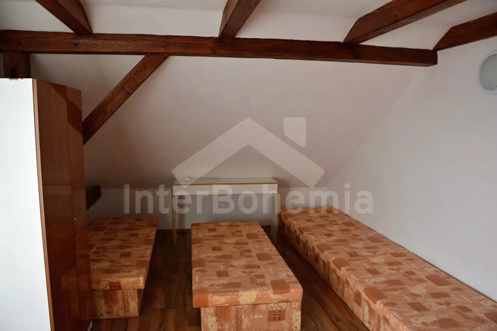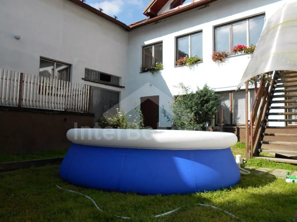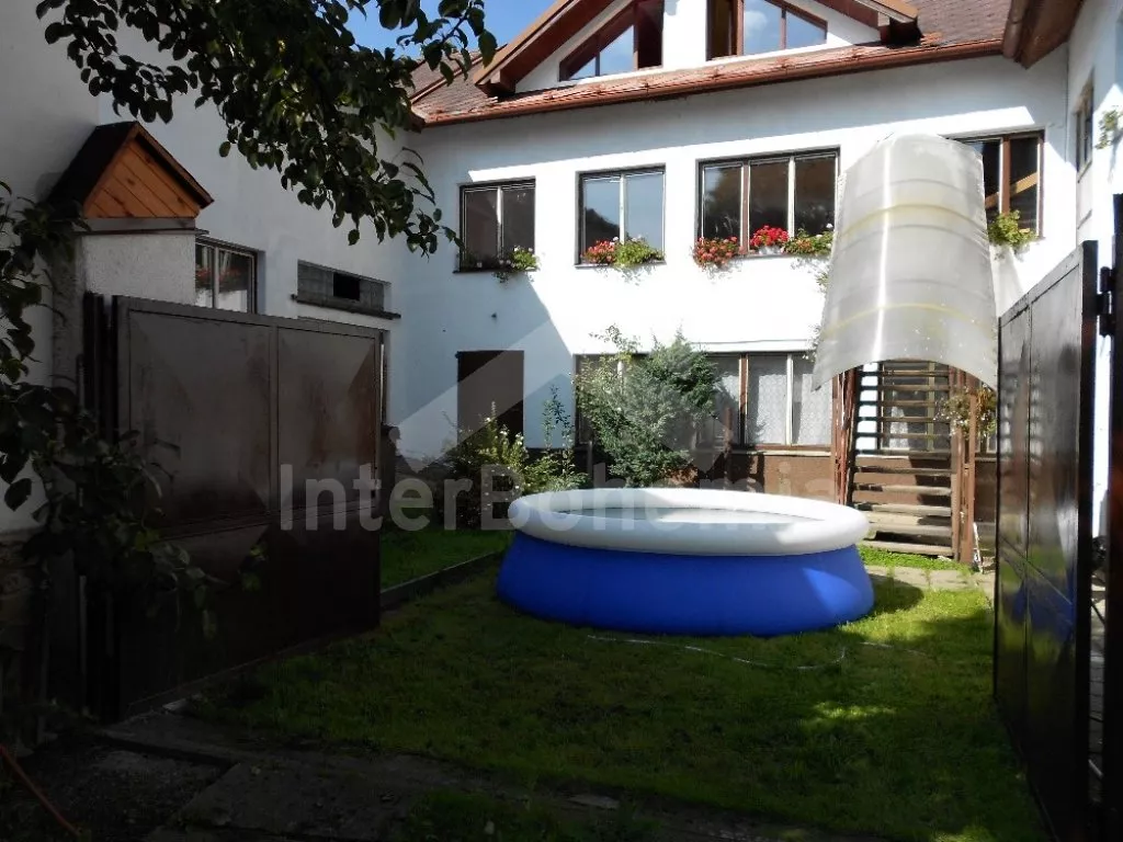 Rodinný dům s pensionem, pěkně zařízený. Vstup, prostorný obývací pokoj s posezením pro pro 12 osob, krbem, TV, jídelními stoly pro 18 osob, kuchyňským koutem s elektrickým sporákem s keramickou varnou deskou, mikrovlnnou troubou, varnou konvicí a dvěma chladničkami kombinovanými s mrazákem. Schodiště do patra, chodba, podkrovní společenská místnost s posezením pro 7 osob, 7 ložnic a koupelny. První a druhá ložnice s jedním dvojlůžkem a jedním samostatným lůžkem, třetí, čtvrtá a pátá ložnice se třemi samostatnými lůžky, šestá ložnice se dvěma samostatnými lůžky a sedmá ložnice s jedním dvojlůžkem a pěti samostatnými lůžky. Koupelna s vanou, sprchovým koutem, umyvadlem a pračkou, 2 samostatné toalet s umyvadlem. Vytápění je centrální elektrické. K dispozici je uzavřený dvůr se zahrádkou s posezením s venkovním krbem a nadzemní kulatý bazén o průměru 3 m.