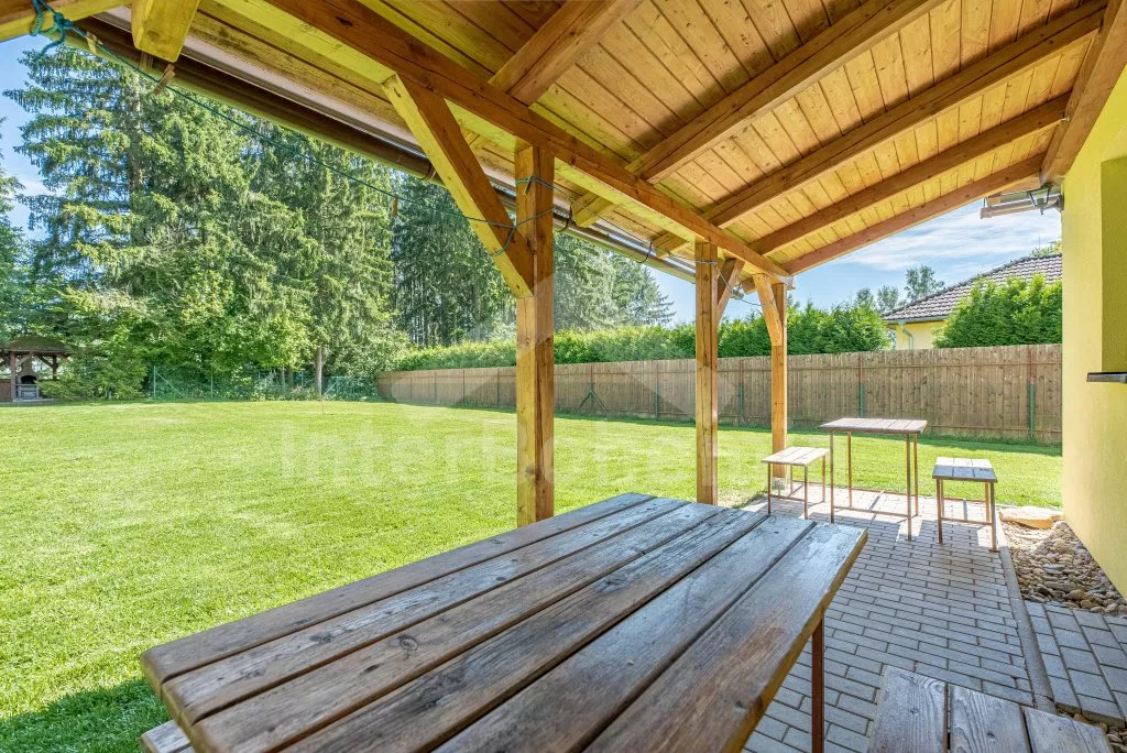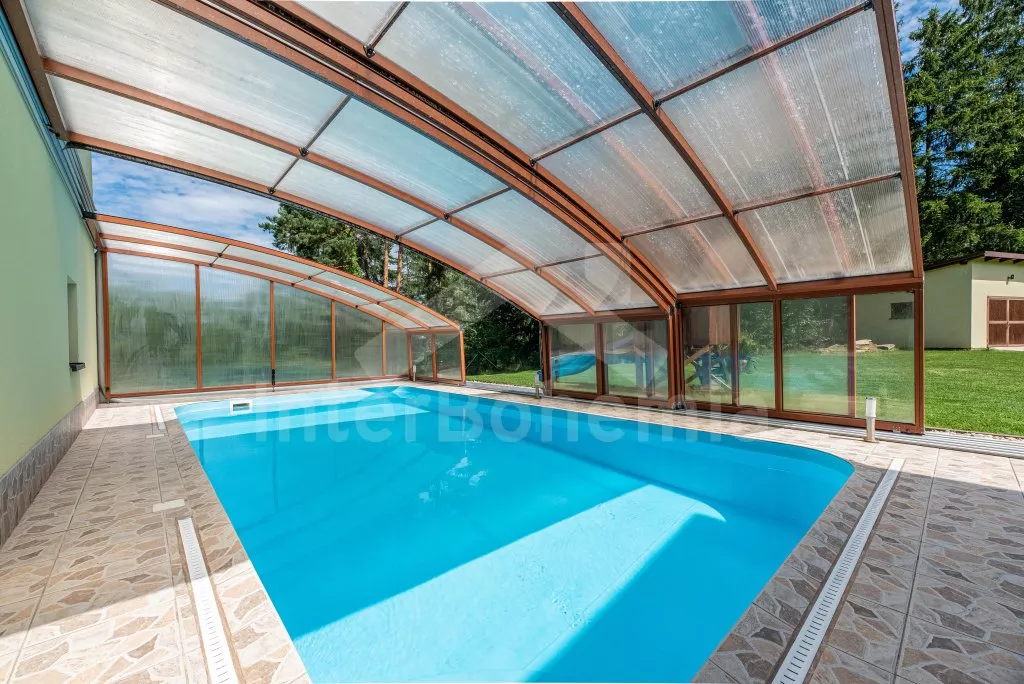 Volně stojící, v roce 2010 nově postavený, mimořádně atraktivní a moderně a pohodlně zařízený dům se zastřešeným, solárně vyhřívaným bazénem. Vstup, chodba, prostorný obývací pokoj se sedací… Více informací