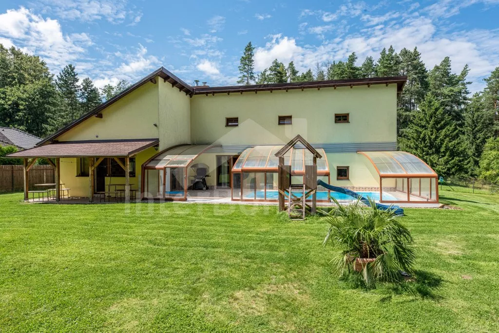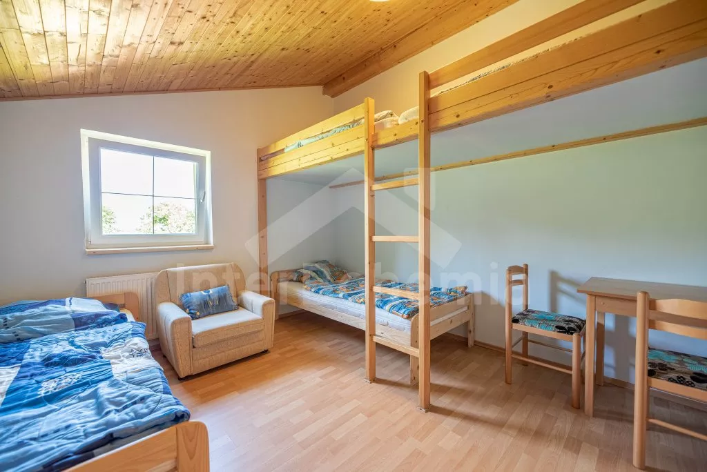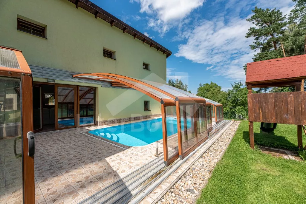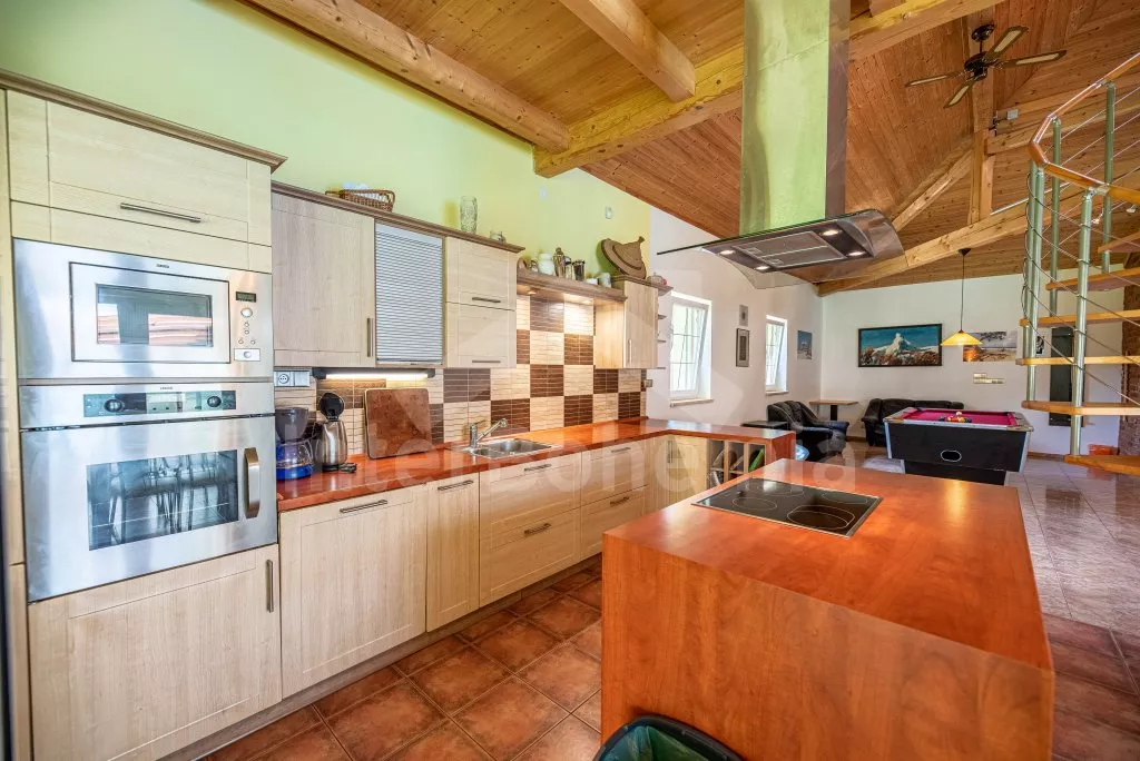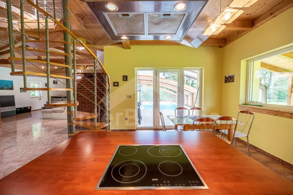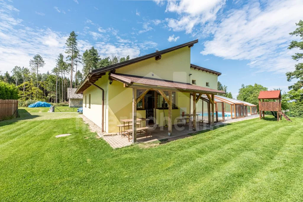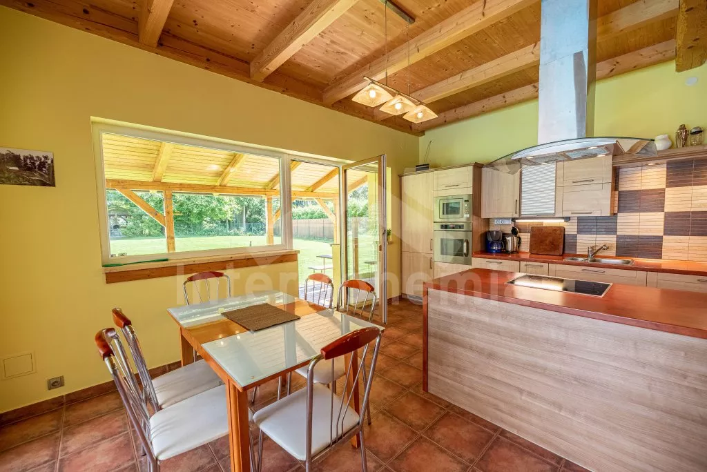 Volně stojící, v roce 2010 nově postavený, mimořádně atraktivní a moderně a pohodlně zařízený dům se zastřešeným, solárně vyhřívaným bazénem. Vstup, chodba, prostorný obývací pokoj se sedací soupravou pro 6 osob (možnost až dvou přistýlek), televizí se satelitním příjmem a DVD, krbovými kamny a kulečníkovým stolem. Moderní, otevřená kuchyně s barem a barovými stoličkami, elektrickou sklokeramickou varnou deskou, horkovzdušnou troubou, lednicí s mrazákem, mikrovlnnou troubou, rychlovarnou konvicí, myčkou na nádobí, jídelním stolem pro šest osob a televizí se satelitním příjmem. Tři ložnice, všechny přístupné z obývacího pokoje. První dvě – každá se dvěma vyvýšenými lůžky a rozkládací pohovkou (možnost dvou přistýlek) a třetí ložnice přístupná po točitém schodišti s rozkládací pohovkou (dvě lůžka). Koupelna se sprchovým koutem a toaletou. K dispozici sauna a koupelna s vířivou vanou. Ústřední elektrické topení (solární panely). Dům stojí na rozlehlém, oploceném pozemku, k dispozici je zastřešený, solárně vyhřívaný bazén 8 x 4 x 1,4 m se slanou vodou a skluzavkou, zahradní nábytek, plynový zahradní gril, zastřešený altánek se zahradním nábytkem a ohniště s posezením. Parkování před objektem.