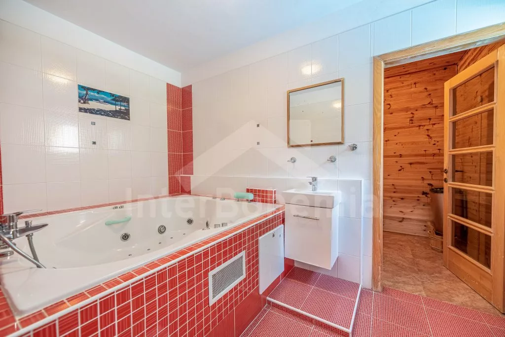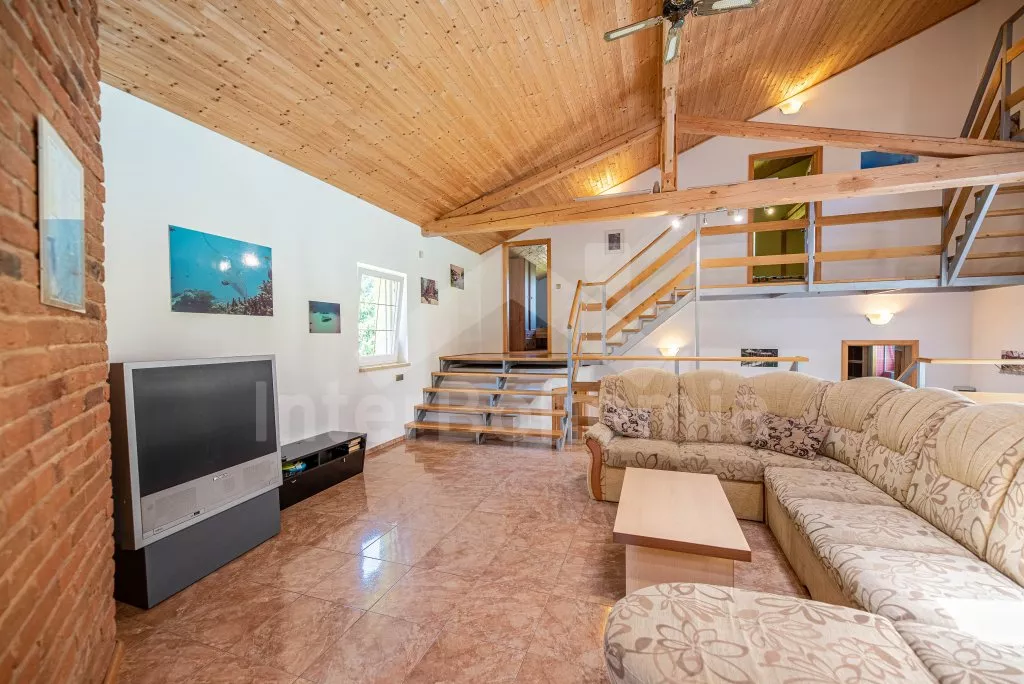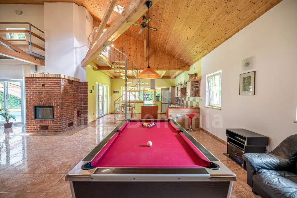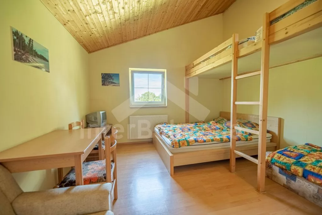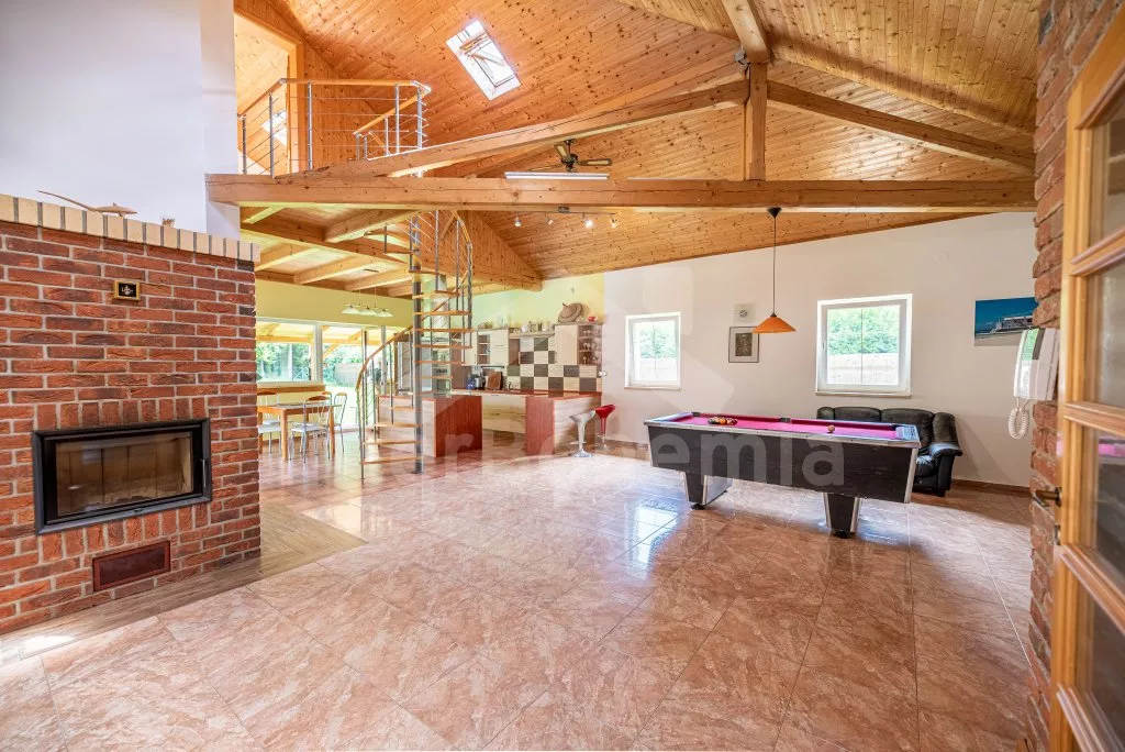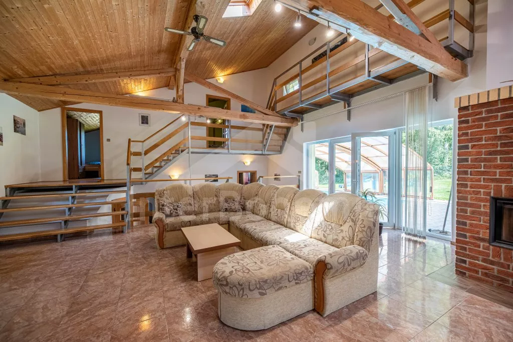 Volně stojící, v roce 2010 nově postavený, mimořádně atraktivní a moderně a pohodlně zařízený dům se zastřešeným, solárně vyhřívaným bazénem. Vstup, chodba, prostorný obývací pokoj se sedací soupravou pro 6 osob (možnost až dvou přistýlek), televizí se satelitním příjmem a DVD, krbovými kamny a kulečníkovým stolem. Moderní, otevřená kuchyně s barem a barovými stoličkami, elektrickou sklokeramickou varnou deskou, horkovzdušnou troubou, lednicí s mrazákem, mikrovlnnou troubou, rychlovarnou konvicí, myčkou na nádobí, jídelním stolem pro šest osob a televizí se satelitním příjmem. Tři ložnice, všechny přístupné z obývacího pokoje. První dvě – každá se dvěma vyvýšenými lůžky a rozkládací pohovkou (možnost dvou přistýlek) a třetí ložnice přístupná po točitém schodišti s rozkládací pohovkou (dvě lůžka). Koupelna se sprchovým koutem a toaletou. K dispozici sauna a koupelna s vířivou vanou. Ústřední elektrické topení (solární panely). Dům stojí na rozlehlém, oploceném pozemku, k dispozici je zastřešený, solárně vyhřívaný bazén 8 x 4 x 1,4 m se slanou vodou a skluzavkou, zahradní nábytek, plynový zahradní gril, zastřešený altánek se zahradním nábytkem a ohniště s posezením. Parkování před objektem.