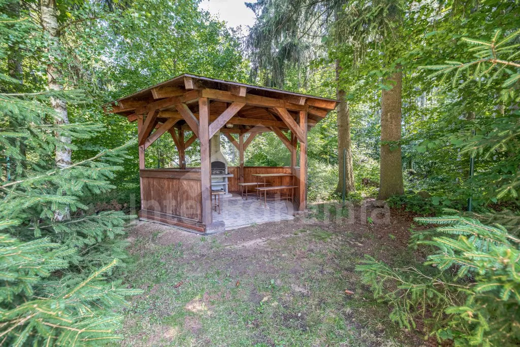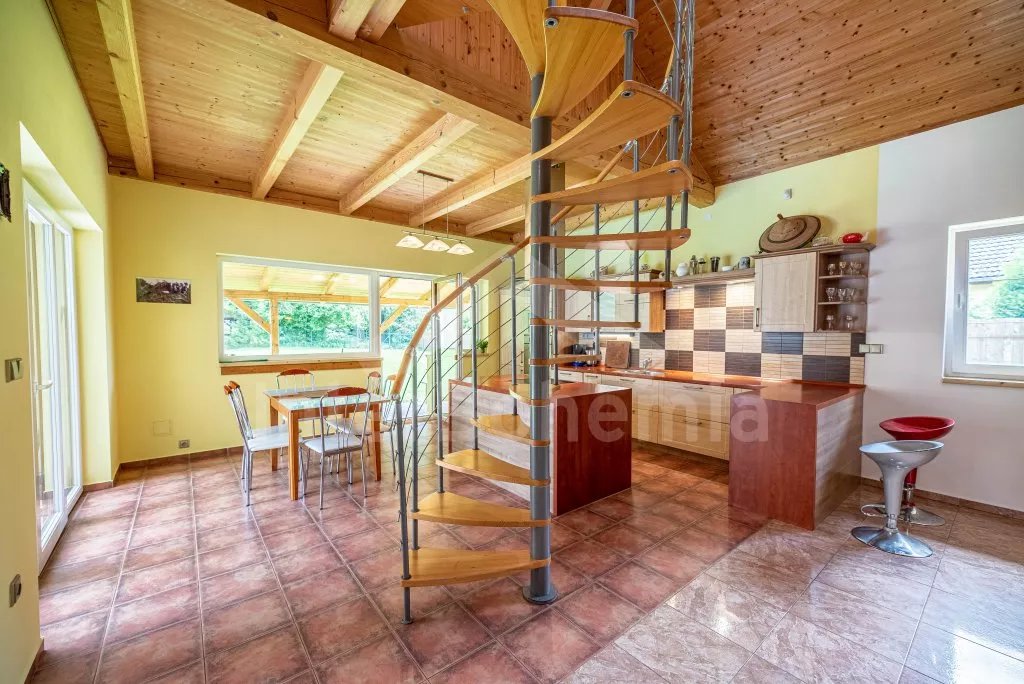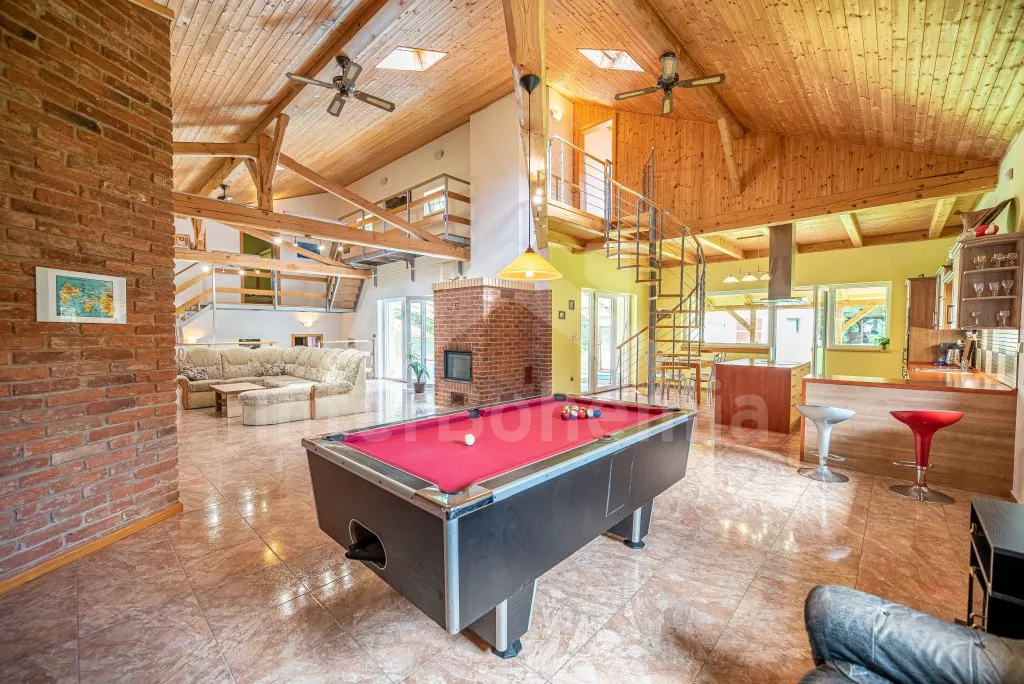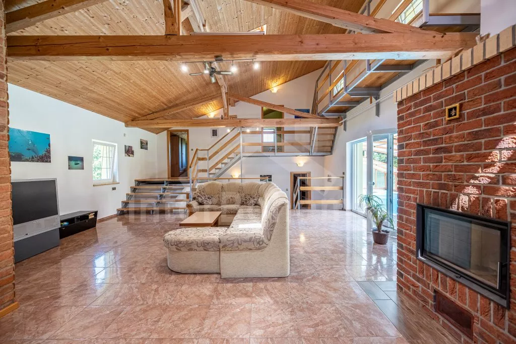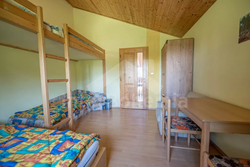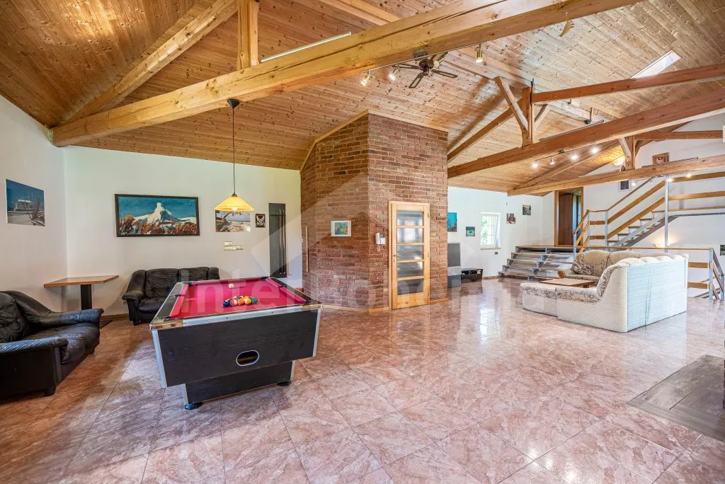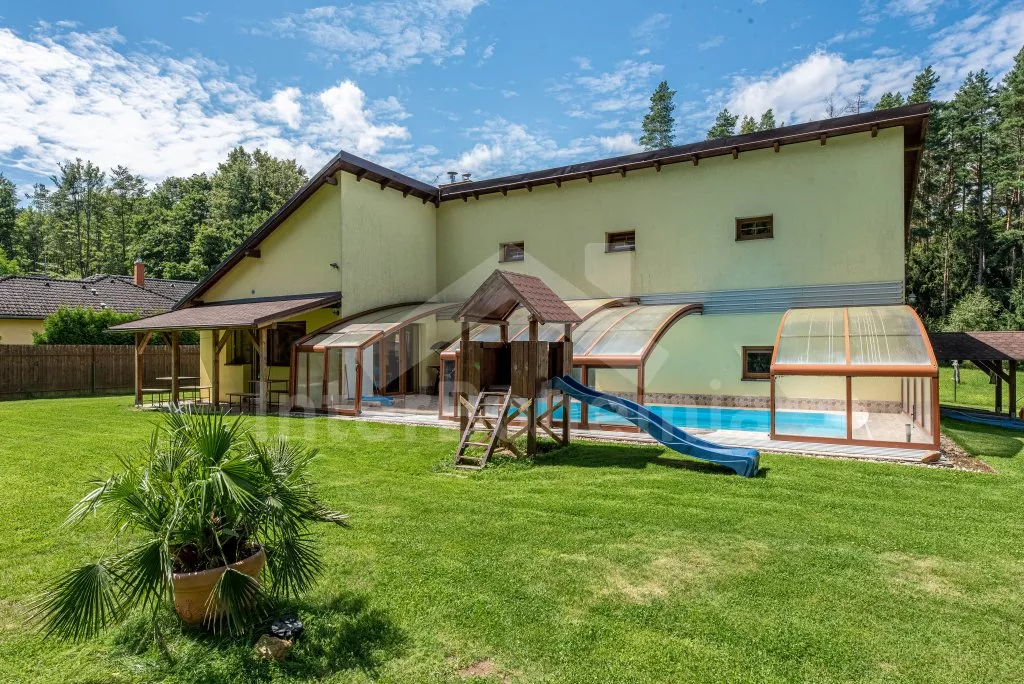 Volně stojící, v roce 2010 nově postavený, mimořádně atraktivní a moderně a pohodlně zařízený dům se zastřešeným, solárně vyhřívaným bazénem. Vstup, chodba, prostorný obývací pokoj se sedací soupravou pro 6 osob (možnost až dvou přistýlek), televizí se satelitním příjmem a DVD, krbovými kamny a kulečníkovým stolem. Moderní, otevřená kuchyně s barem a barovými stoličkami, elektrickou sklokeramickou varnou deskou, horkovzdušnou troubou, lednicí s mrazákem, mikrovlnnou troubou, rychlovarnou konvicí, myčkou na nádobí, jídelním stolem pro šest osob a televizí se satelitním příjmem. Tři ložnice, všechny přístupné z obývacího pokoje. První dvě – každá se dvěma vyvýšenými lůžky a rozkládací pohovkou (možnost dvou přistýlek) a třetí ložnice přístupná po točitém schodišti s rozkládací pohovkou (dvě lůžka). Koupelna se sprchovým koutem a toaletou. K dispozici sauna a koupelna s vířivou vanou. Ústřední elektrické topení (solární panely). Dům stojí na rozlehlém, oploceném pozemku, k dispozici je zastřešený, solárně vyhřívaný bazén 8 x 4 x 1,4 m se slanou vodou a skluzavkou, zahradní nábytek, plynový zahradní gril, zastřešený altánek se zahradním nábytkem a ohniště s posezením. Parkování před objektem.