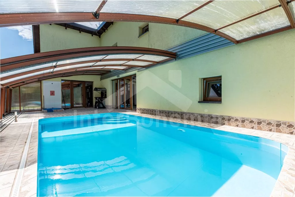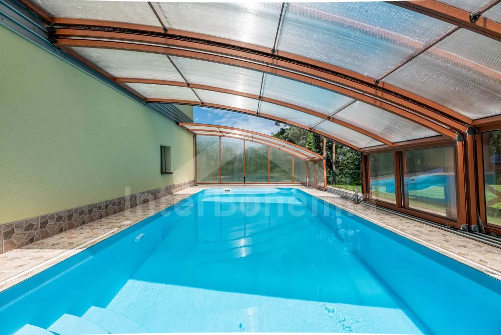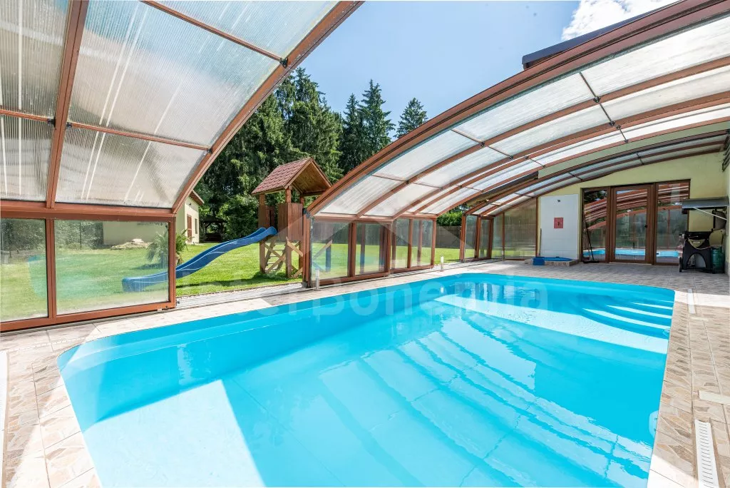 Zastřešený, solárně vyhřívaný bazén 8 x 4 x 1,4 m se slanou vodou a skluzavkou.