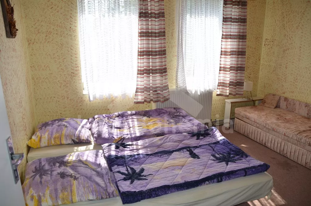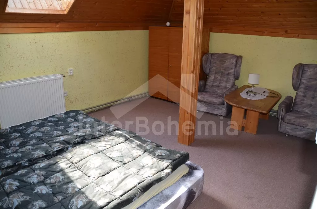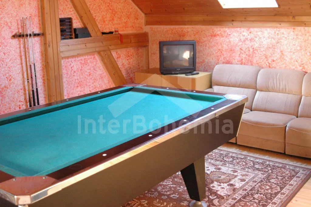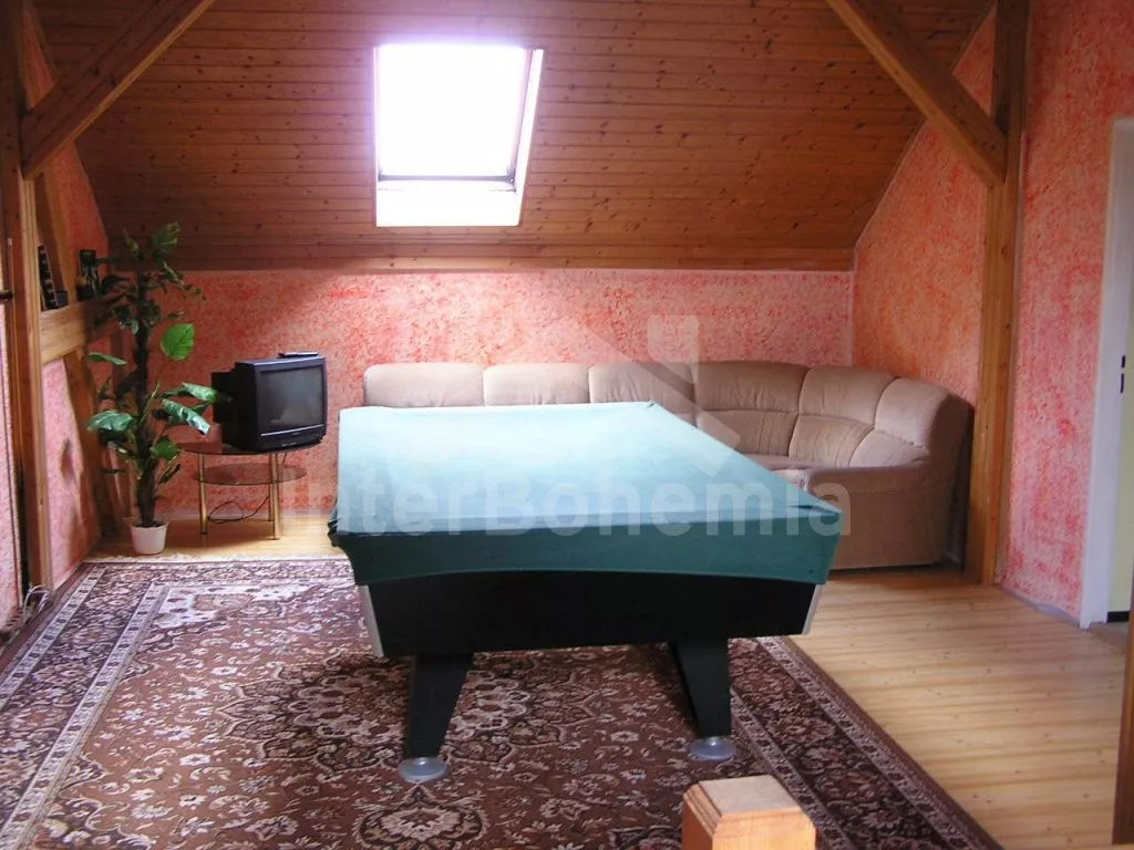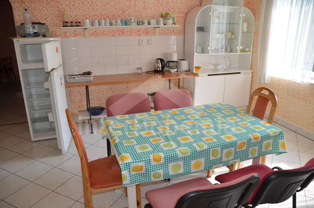 Volně stojící, velmi prostorný dům s obytnou plochou více než 405 m2! Vstup přes prosklenou verandu s posezením. V přízemí se nachází společenská místnost se sedací soupravou, barem a stolním tenisem. Kuchyně s pohovkou, jídelním stolem, elektrickým sporákem, lednicí, kávovarem, varnou konvicí a mikrovlnnou troubou. Jídelna s jídelními stoly, krbem a televizí. Hala s posezením a tři ložnice – každá s dvojlůžkem. Koupelna se sprchou a toaletou a další dvě samostatné toalety. V podkroví se nachází obývací pokoj se sedací soupravou, kulečníkem, televizí se satelitním příjmem a videem a dále tři apartmá. Apartmá 1 a 2 jsou vybavena malým kuchyňským koutem, posezením, koupelnou se sprchou, samostatnou toaletou a dvěma ložnicemi (v každé je dvojlůžko). V apartmá 3 je k dispozici malý kuchyňský kout, posezení, sprcha, toaleta a ložnice s dvojlůžkem. Ústřední topení (o topení se stará pronajímatel). Velká, hezky udržovaná zahrada s okrasným jezírkem, k dispozici je zastřešená terasa, zahradní nábytek se slunečníkem, zahradní krb a bazén 12 x 6 m. Spousta zábavy pro děti (pískoviště, houpačka, kolotoč a zahradní domeček). Vlastní parkoviště pro 8-10 aut.