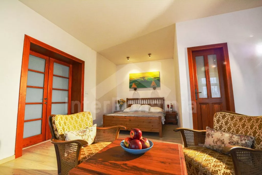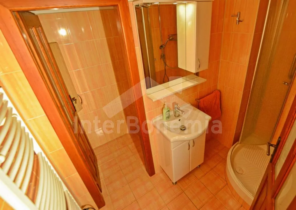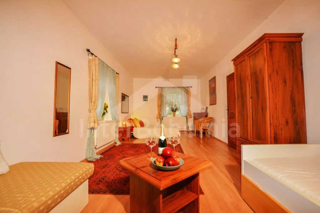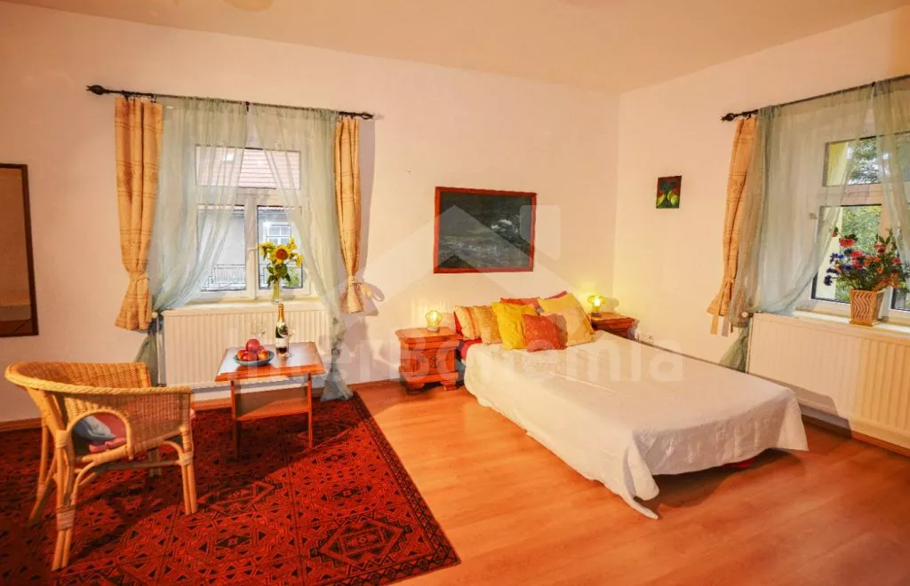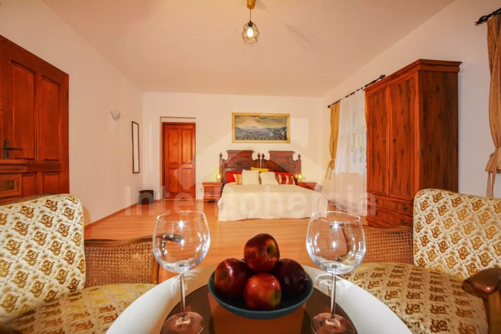 Samostatný apartmán s velkou obývací místností a kuchyní je přístupný samostatně zvenku. Ložnice s dvěma dvoulůžky. Koupelna se sprchovým koutem, umyvadlem a WC.