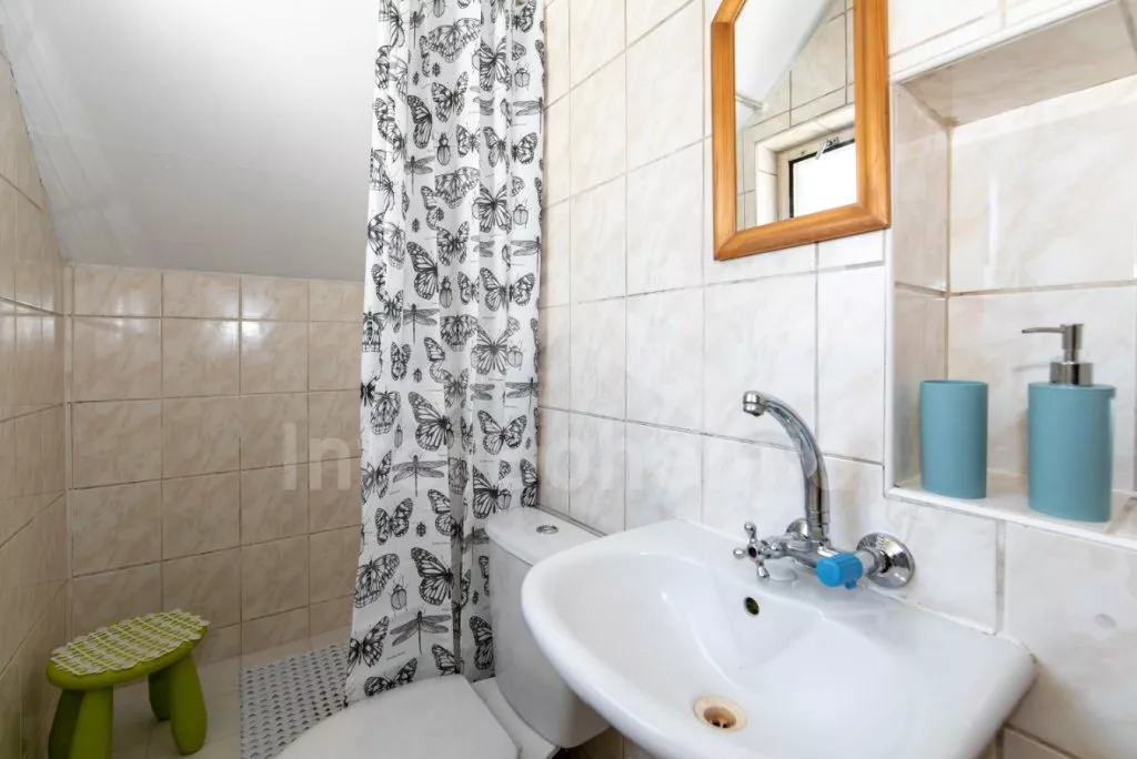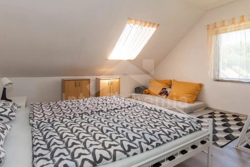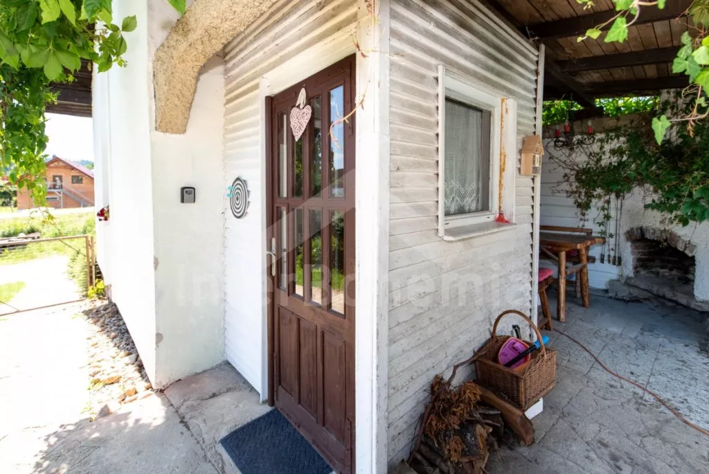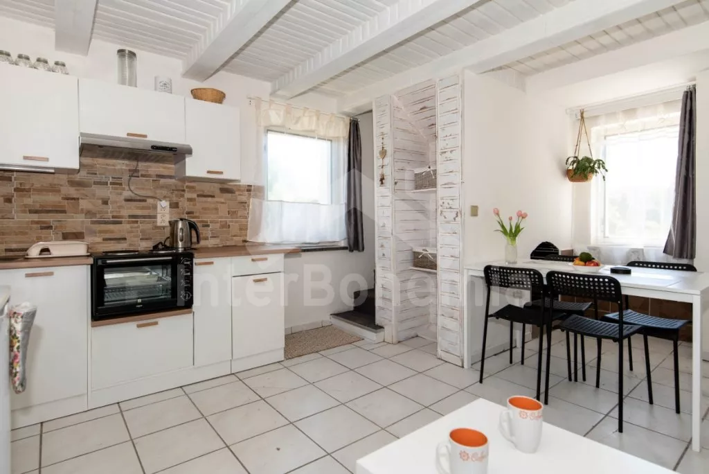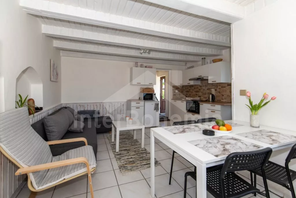 Zahradní domek, zrekonstruovaný s citem pro detail v roce 2021, s oplocenou společnou zahradou a bazénem. V přízemí jídelní stůl pro 4 osoby, sedací souprava (rozložitelná na extra lůžko 200x135 cm), LCD televize a kuchyňský kout s dvouplotýnkovou varnou deskou, troubou, mikrovlnnou troubou, lednicí, rychlovarnou konvicí, kávovarem na kapsle a nádobím. Koupelna se sprchovým koutem (zkosený strop, pohodlné pro postavy do 175 cm), umyvadlem a WC. V podkroví ložnice s dvoulůžkem a dvěma jednolůžky. Vytápění objektu infračervenými panely. Hosté mají k dispozici společnou zahradu s trampolínou, nadzemním bazénem a vlastní kryté posezení s krbem. Parkování možné u objektu.