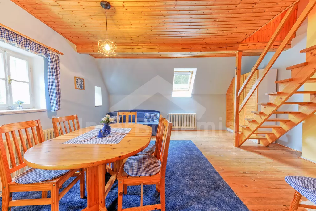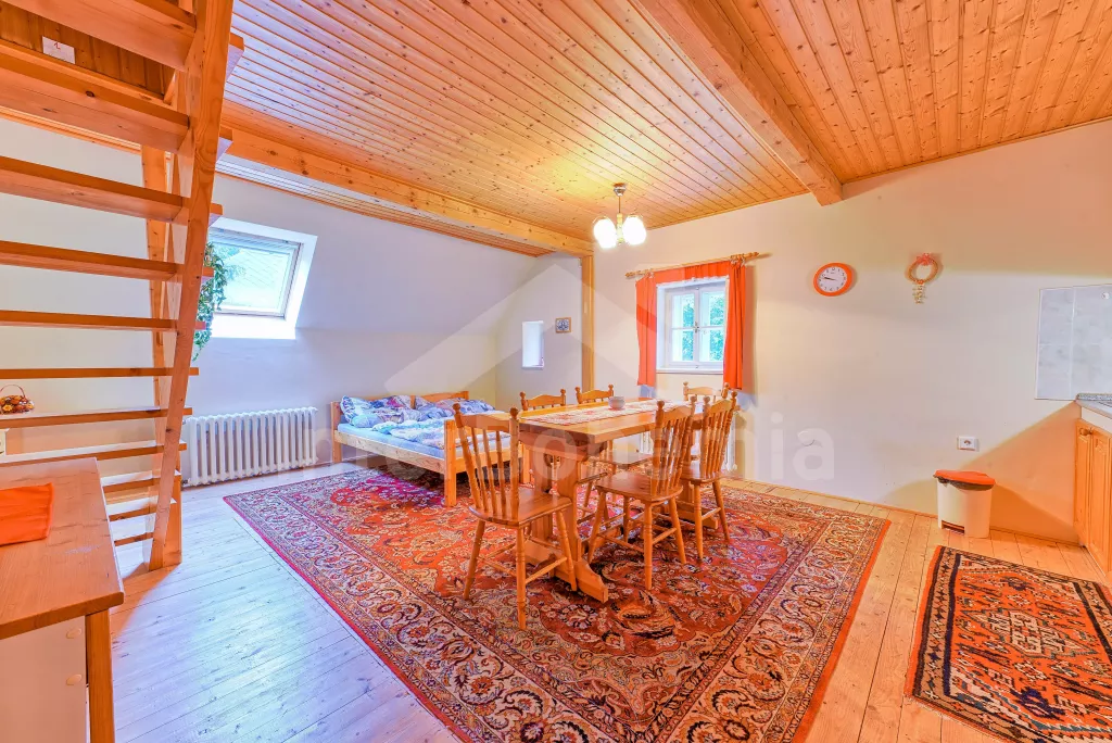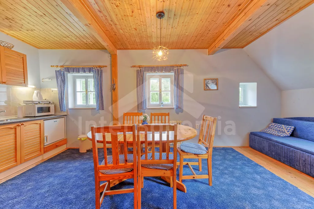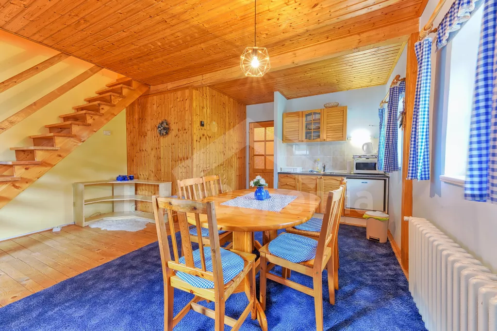 Apartmá 2: chodba, obytná ložnice s moderním kuchyňským koutem (k dispozici elektrický vařič se dvěma plotýnkami, lednice, varná konvice a mikrovlnná trouba), jídelním stolem a dvěma lůžky. Koupelna se sprchou, toaletou a automatickou pračkou. Z obytné ložnice vedou schody do podkroví, kde se nachází další ložnice se čtyřmi lůžky. Ústřední vytápění dřevoplynem.