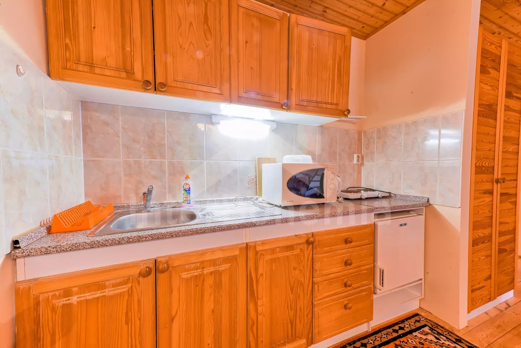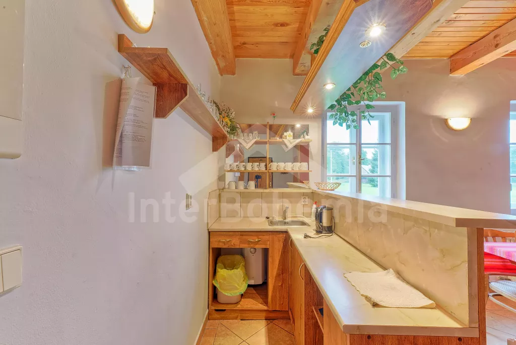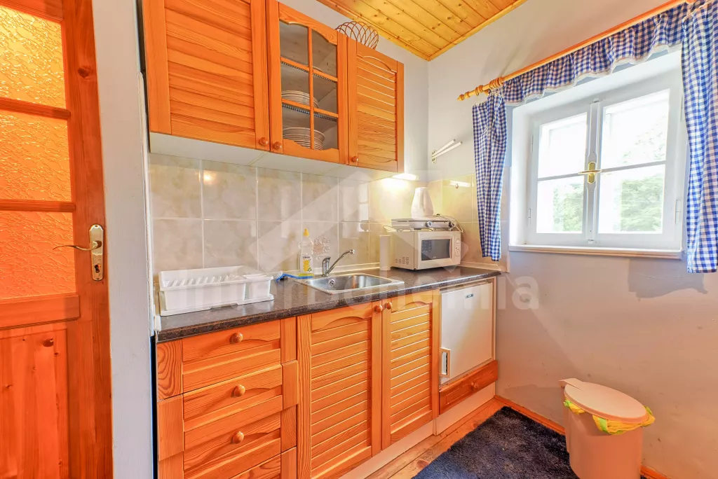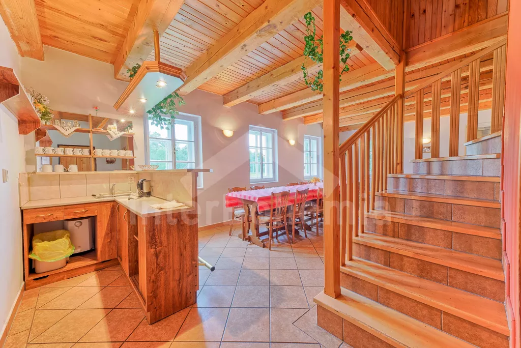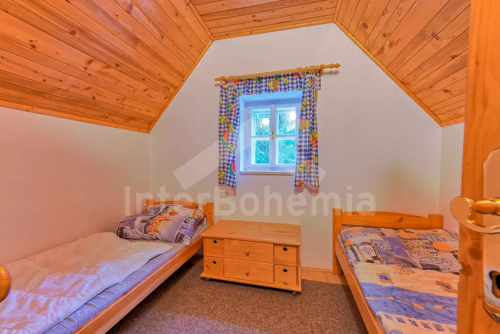 Apartmá 2: chodba, obytná ložnice s moderním kuchyňským koutem (k dispozici elektrický vařič se dvěma plotýnkami, lednice, varná konvice a mikrovlnná trouba), jídelním stolem a dvěma lůžky. Koupelna se sprchou, toaletou a automatickou pračkou. Z obytné ložnice vedou schody do podkroví, kde se nachází další ložnice se čtyřmi lůžky. Ústřední vytápění dřevoplynem.