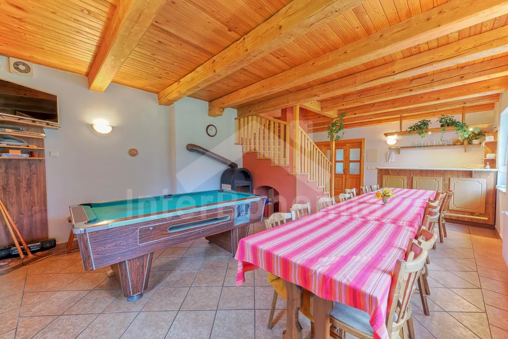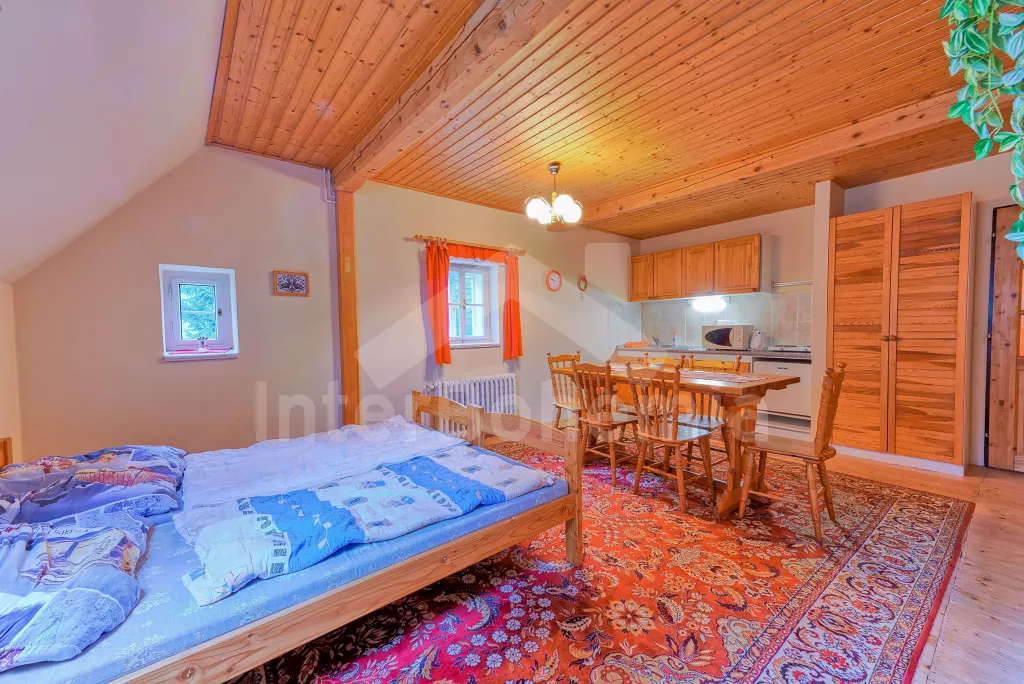 Volně stojící luxusní dům k samostatnému ubytování, postavený v původním horském stylu, pohodlně zařízený novým nábytkem. V interiéru je hojně užito dřeva. Přízemí: vchod do předsíně, prostorný obývací pokoj / společenská místnost s barem, třemi jídelními stoly, krbovými kamny, kulečníkem a televizí se satelitním příjmem a videem. Chodba a WC. Schody do prvního patra, kde se nachází dvě samostatná apartmá. Apartmá 1: chodba, obytná ložnice s moderním kuchyňským koutem (k dispozici elektrický vařič se dvěma plotýnkami, lednice, varná konvice a kávovar), jídelním stolem a dvěma lůžky. Koupelna se sprchou a toaletou. Z chodby vstup do ložnice se dvěma lůžky. Z obytné ložnice vedou schody do podkroví, kde se nachází ložnice se čtyřmi samostatnými lůžky a posezením.