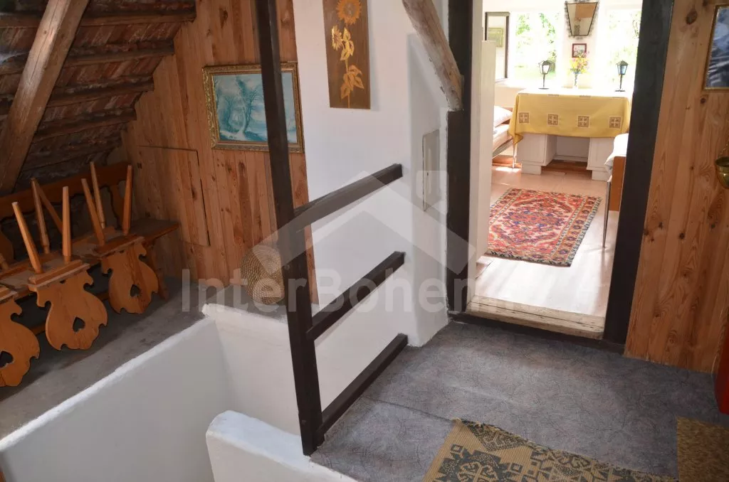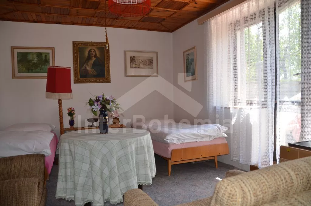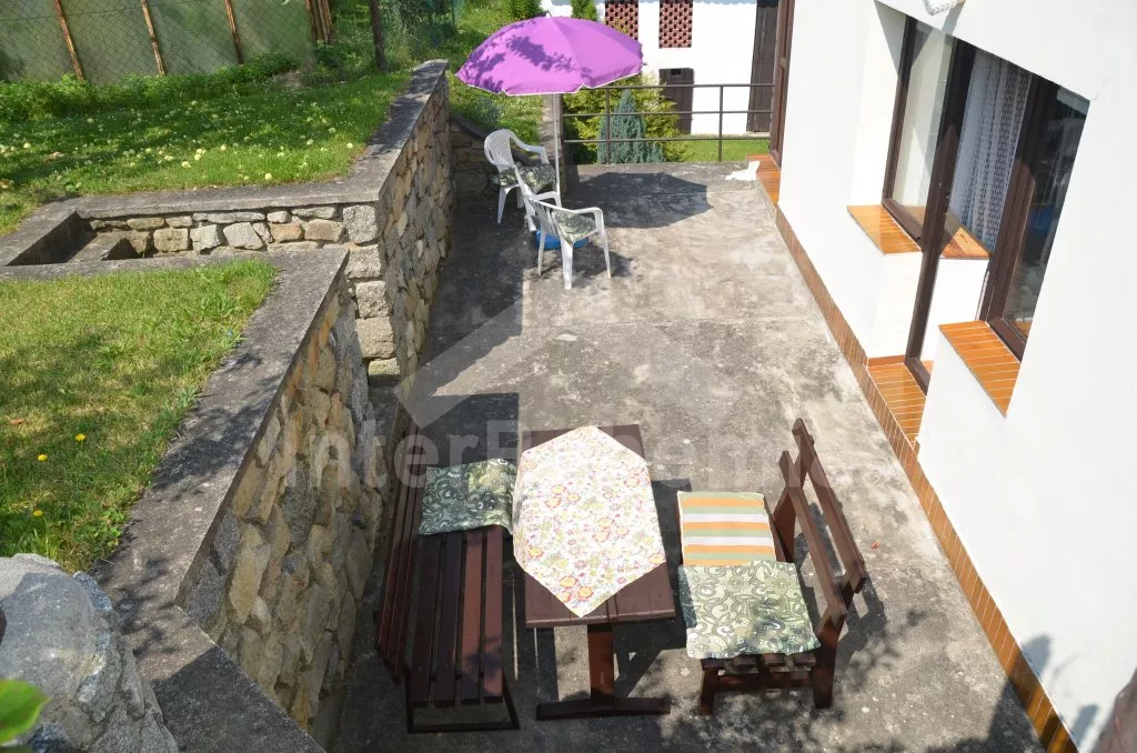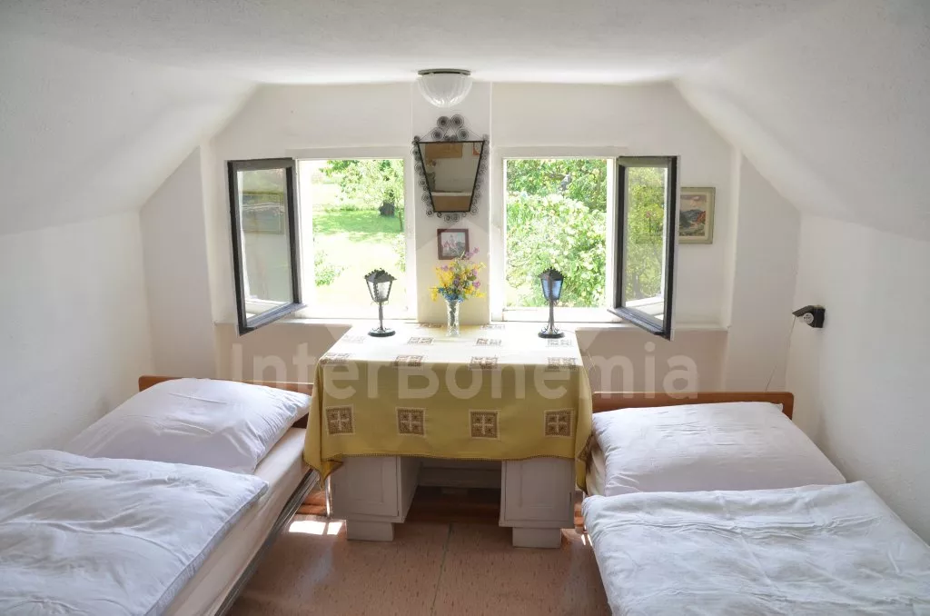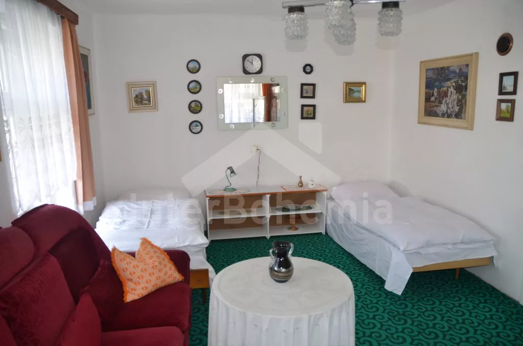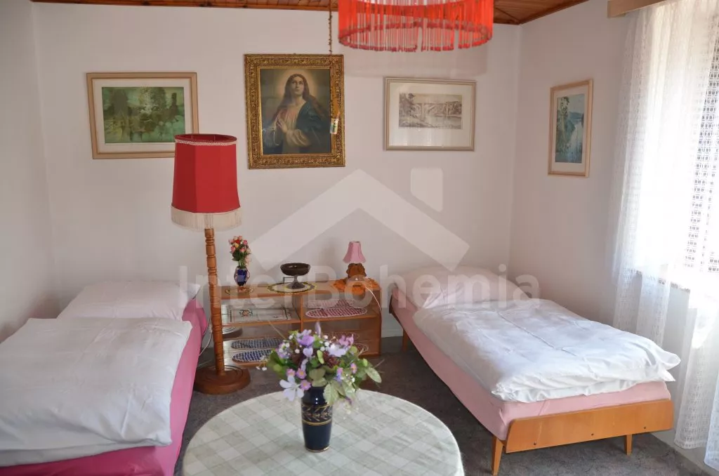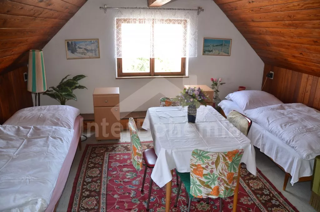 Prostorný, volně stojící rekreační venkovský dům k samostatnému obývání. Vchod, krytá terasa, chodba, obývací pokoj s posezením, dvě přistýlky a vstup na terasu. Obytná kuchyně s jídelním stolem a televizí, vybavená elektrickým sporákem se 4 plotýnkami, lednicí s mrazákem, mikrovlnou troubou,rychlovarnou konvicí a kávovarem. Koupelna s vanou, WC zvlášť. Ložnice se dvěma lůžky. Nahoře je chodba s dvěma lůžky, ložnice se dvěma lůžky a ložnice se třemi lůžky. Prostorná, oplocená zahrada s ovocnými stromy, zahradní krb, ohniště, terasa a zahradní nábytek. Vlastní parkoviště ve dvoře. Soukromí a klid.