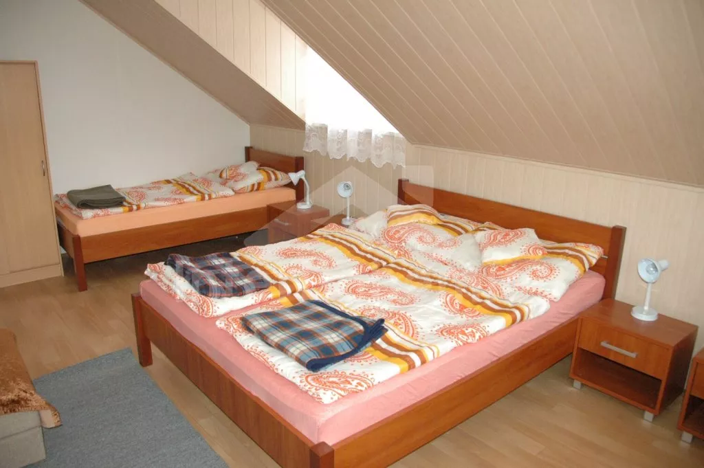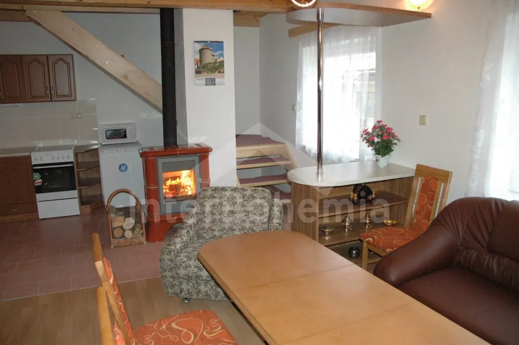 Volně stojící chata, v roce 2011 nově postavená, hezky a útulně zařízená. Vstup, veranda (jídelna) se stolem a lavicemi pro 8 osob, obývací pokoj se sedací soupravou pro 5 osob, televizí a krbovými kamny. Otevřená kuchyně s elektrickým sporákem se sklokeramickou deskou, lednicí, varnou konvicí a mikrovlnnou troubou. Koupelna se sprchovým koutem a toaletou, samostatná toaleta. V podkroví se nachází tři ložnice – první s dvojlůžkem a dvěma samostatným lůžky, druhá s dvojlůžkem a třetí se dvěma samostatnými lůžky. Samostatná toaleta. Vytápěno krbovými kamny a elektrickými přímotopy. Chata stojí na oploceném pozemku, společně s druhým, naprosto identickým domem, který je taktéž pronajímán (naleznete ho pod naším kódem JM 0106). K dispozici je částečně zastřešená terasa, zahradní nábytek se slunečníkem, zahradní krb a ohniště. Hostům je v areálu k dispozici stolní tenis včetně pálek. Parkování na oploceném pozemku.