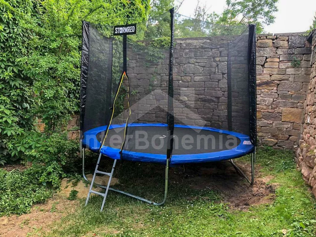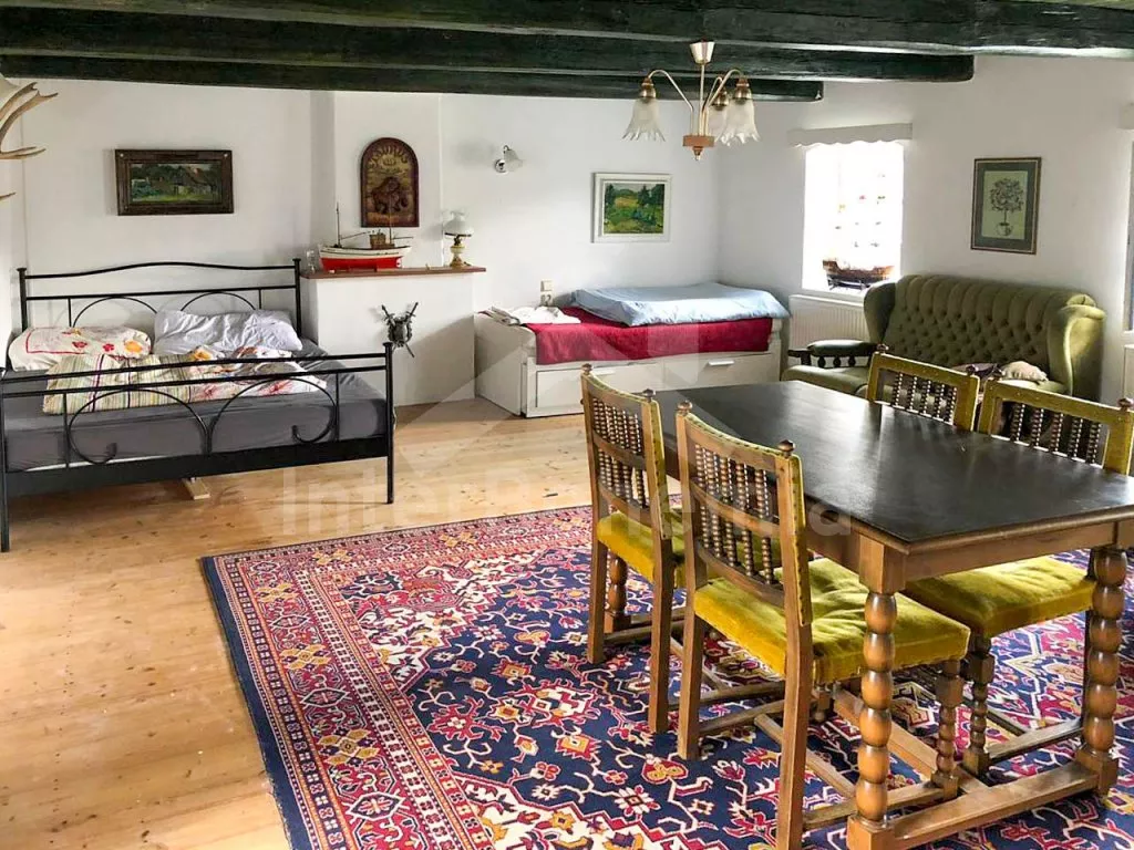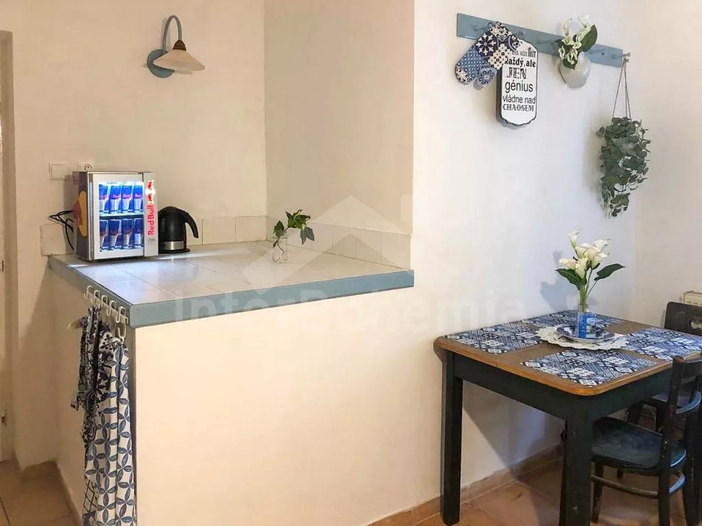 Usedlost s oplocenou zahradou, vířivkou a vyžitím pro děti. Obývací místnost sloužící také jako ložnice s dvoulůžkem, rozkládacím jednolůžkem, TV a stolem s posezením. Kuchyně s el.sporákem, lednicí, mrazákem, chladničkou na víno, rychlovarnou konvicí, toustovačem a základním kuchyňským vybavením. Koupelna s vanou, umyvadlem a WC. V patře ložnice s 2x dvoulůžkem, jídelním stolem, pohovkami a TV s Playstation 4. Další ložnice s dvoulůžkem, jednolůžkem a dětskou postýlkou. K dispozici vinný sklep. Objekt je vytápěn ústředním topením. Oplocená zahrada s posezením, trampolínou, pískovištěm, grilem, ohništěm a vířivkou. Parkování pro 4 automobily u objektu.