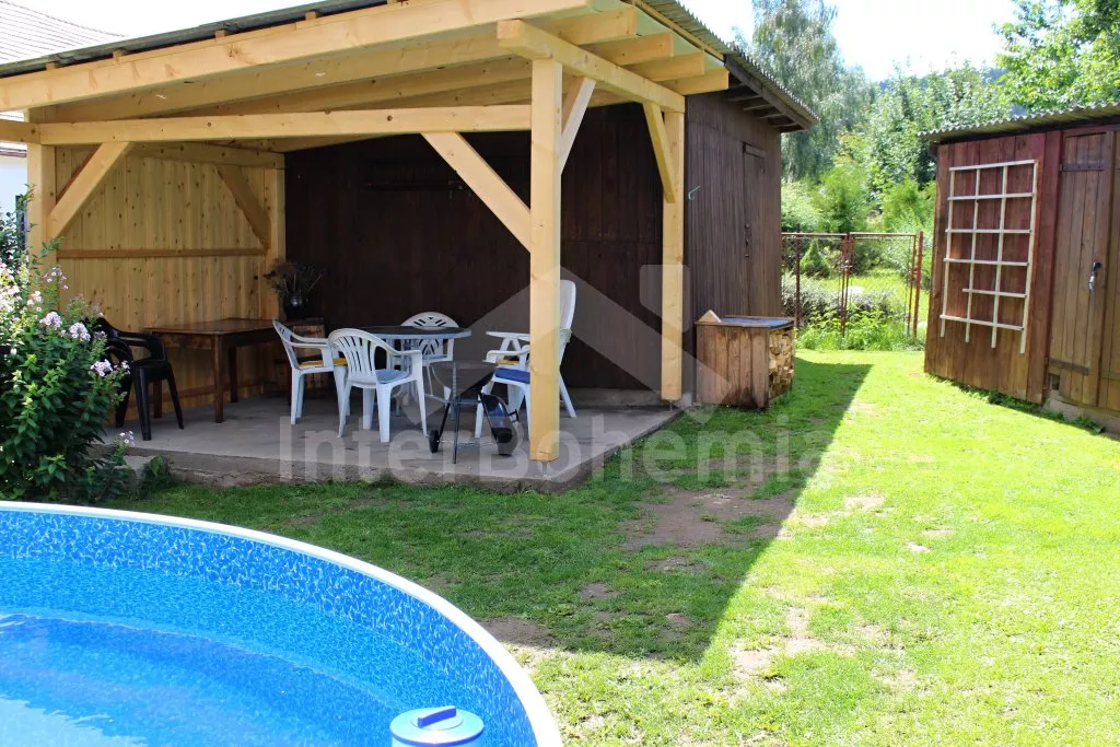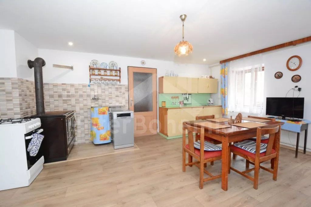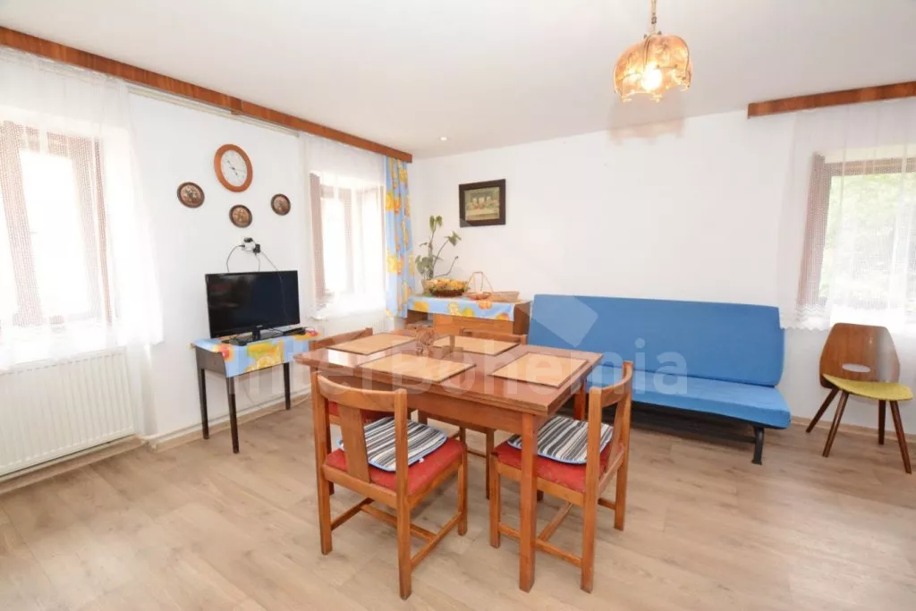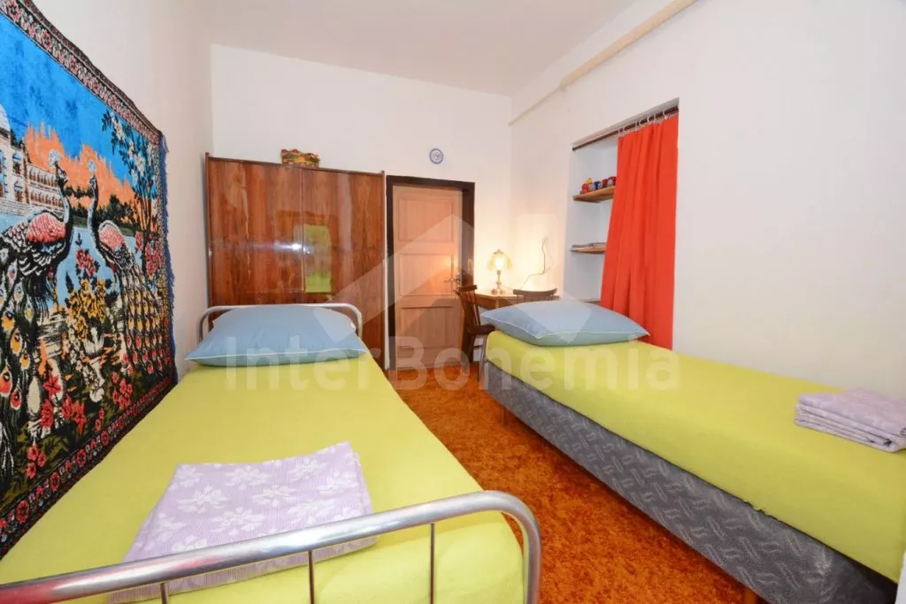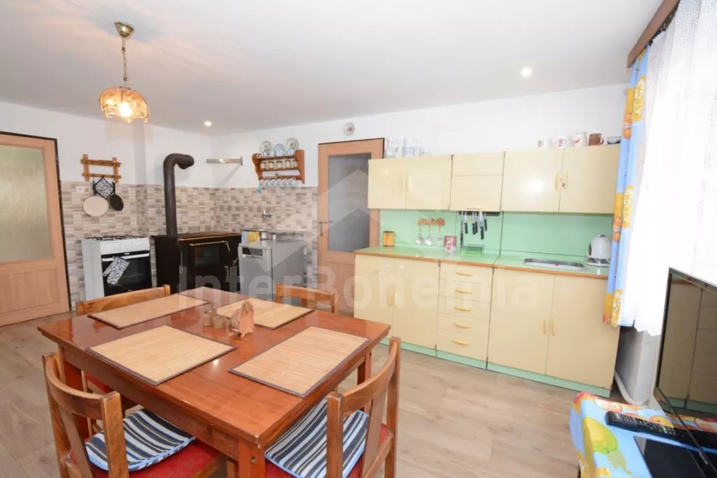 Původní rodinný dům po částečné rekonstrukci v roce 2018, pěkně a příjemně zařízený. Vstup, předsíň, kuchyně s posezením pro 5 osob na sedací soupravě, TV, WIFI, jídelním stolem pro 6 osob + dětská židlička a kuchyňským koutem s kuchyňským sporákem na dřevo, plynovým sporákem s elektrickou troubou, mikrovlnnou troubou, myčkou nádobí a varnou konvicí. Chodba se spižírnou, lednicí s mrazákem a koupelnou s vanou, umyvadlem, toaletou a pračkou. Obývací pokoj s posezením, dvoulůžkem a pohovkou sloužící zároveň jako jednolůžko se vstupem do ložnice s jedním dvoulůžkem a dětskou postýlkou. Druhá menší ložnice s dvěma jednolůžky a samostatným vchodem z předsíně. Objekt je vytápěn plynovým kotlem a kamny na tuhá paliva. Dům stojí na vlastním, kompletně oploceném pozemku se zahradou. K dispozici je pergola s ratanovým nábytkem a menší terasa se zahradním nábytkem a lehátky, houpací lavice, přenosný gril a částečně zapuštěný kulatý bazén o průměru 3,5 m s filtrací a pískoviště pro nejmenší. Vlastní parkoviště pro dva osobní vozy před objektem.