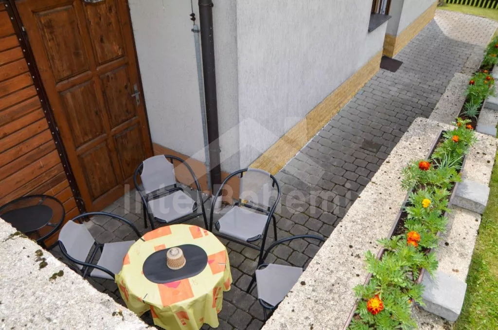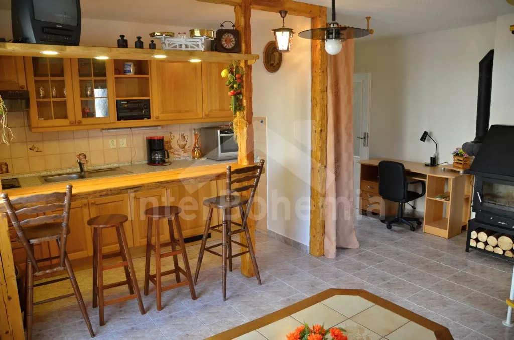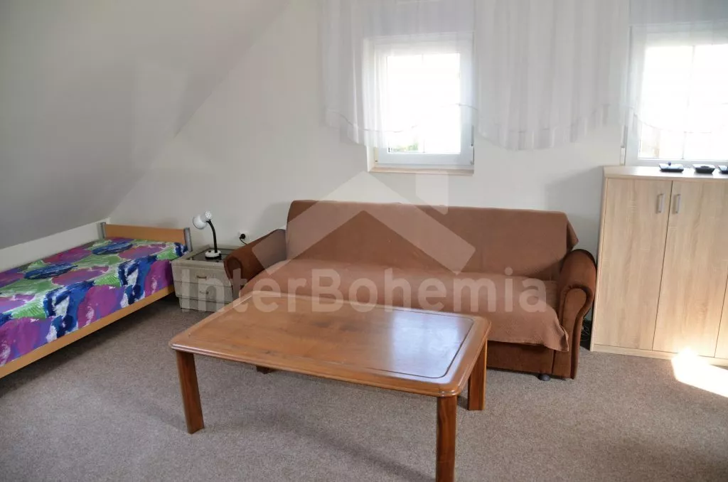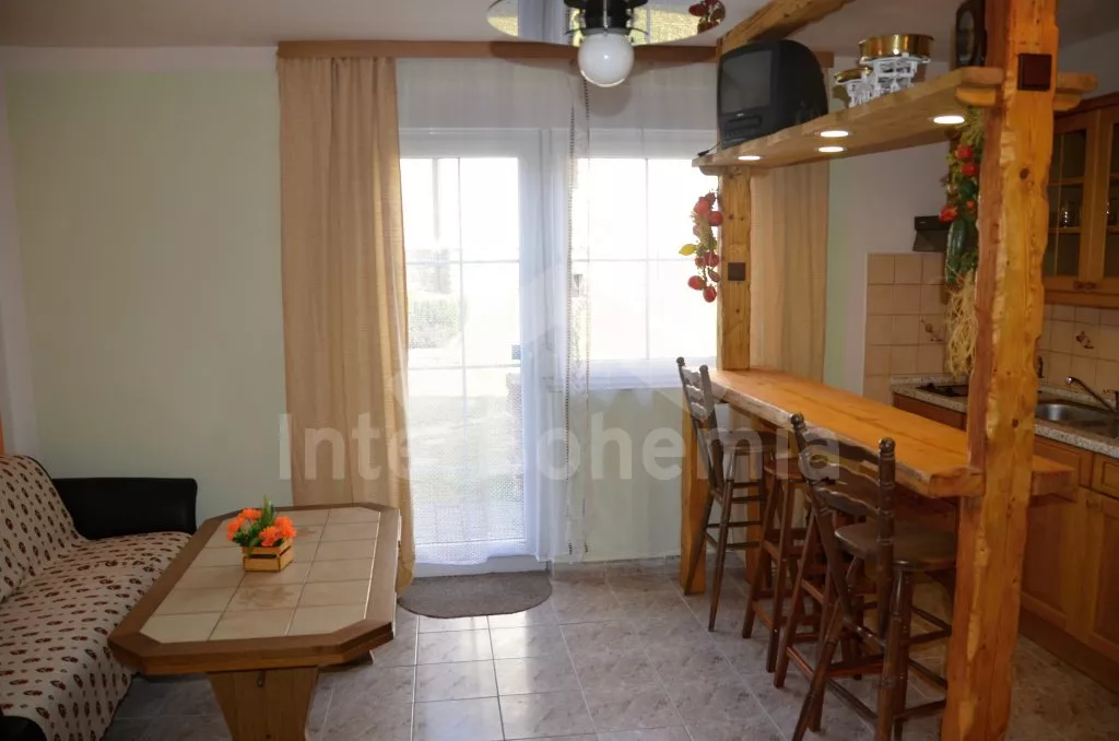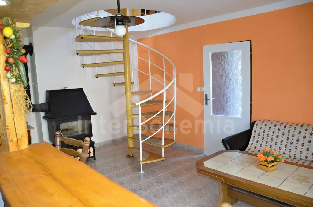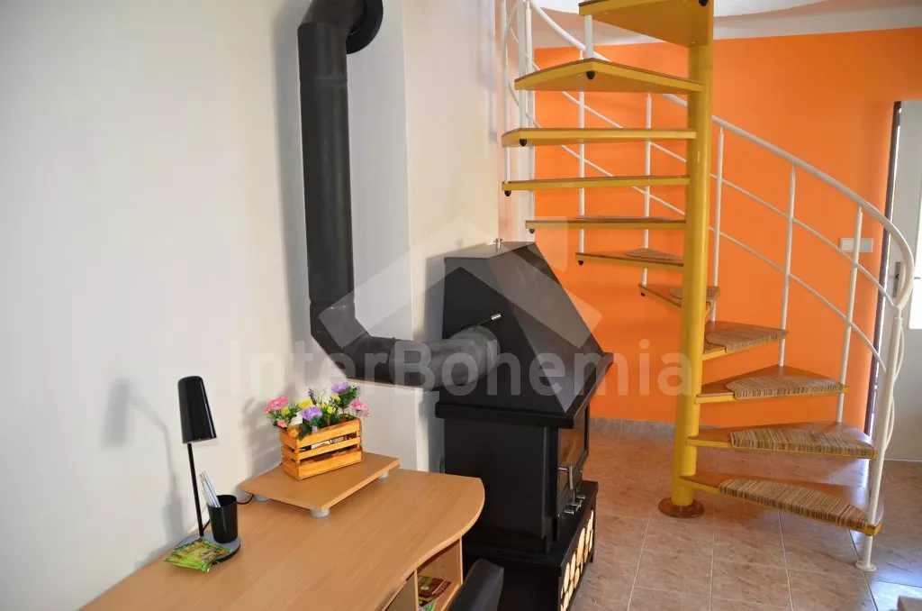 Volně stojící rekreační domek, po rekonstrukci v roce 2015, pěkně a pohodlně zařízený. Vstup, zádveří, obývací pokoj s posezením, krbovými kamny, barem a kuchyňským koutem s elektrickou varnou deskou, mikrovlnnou troubou, chladničkou a varnou konvicí. Koupelna s toaletou, sprchovým koutem a umyvadlem. Po točitém schodišti vystoupáte do prvního patra, které slouží jako velmi prostorná obývací ložnice s posezením (gauč slouží také jako menší přistýlka), TV, jedním dvojlůžkem a dvěma samostatnými postelemi. Objekt je vytápěn centrálně a krbovými kamny. Dům stojí na vlastním pozemku ještě s domem pronajímatele, k dispozici je venkovní posezení a přenosný gril. Parkování před objektem a na pozemku.