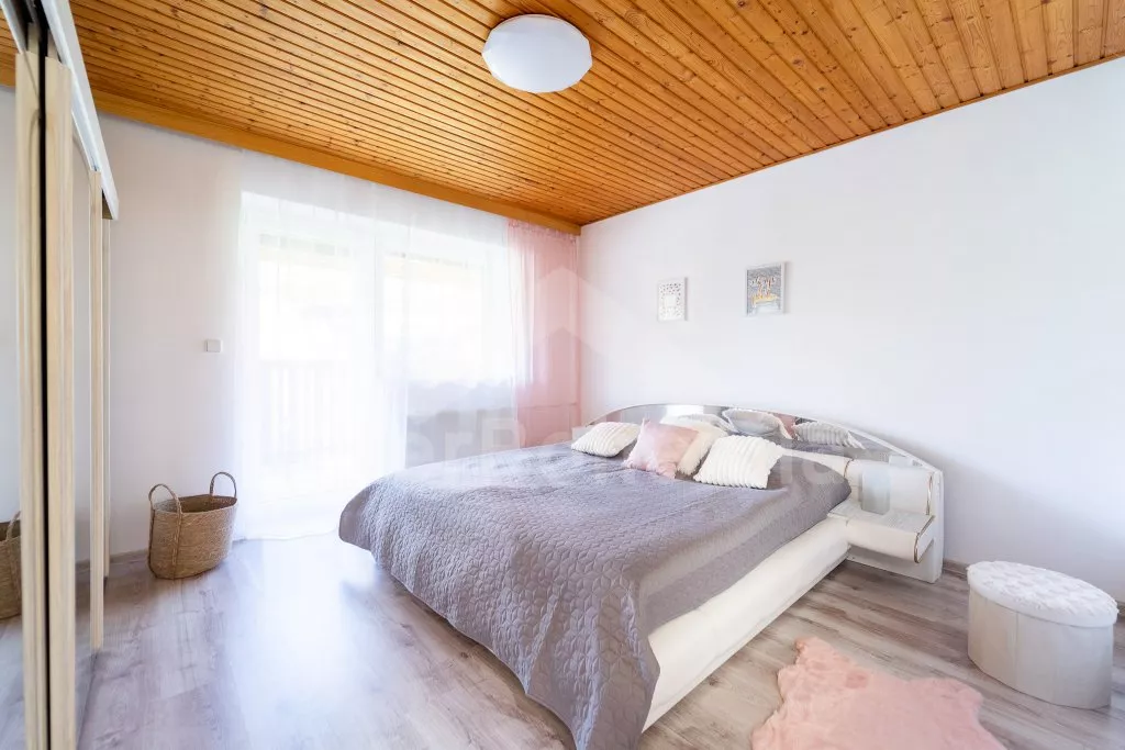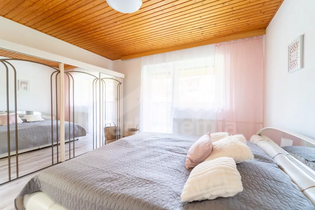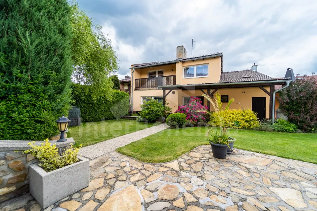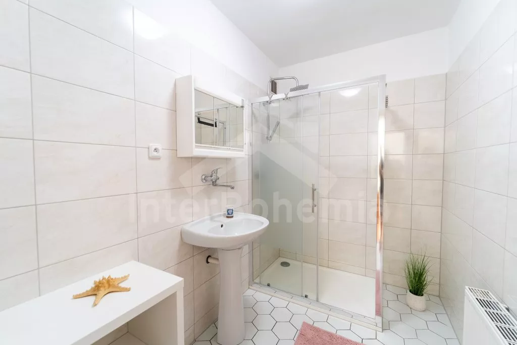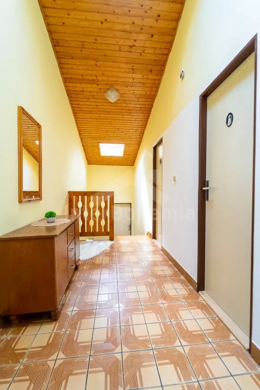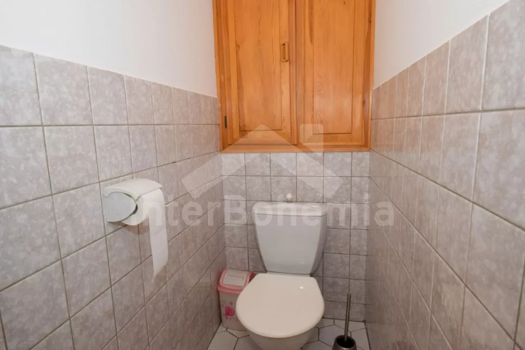 Řadový dům se zahradou, po celkové rekonstrukci v roce 2020. Vstup, chodba, kuchyně s plynovým sporákem, elektrickou troubou, mikrovlnnou troubou, rychlovarnou konvicí, lednicí, mrazákem, nádobím a myčkou na nádobí. Jídelní stůl pro 4 osoby a vstup na terasu. Obývací pokoj se sedací soupravou, LCD televizí a druhým jídelním stolem pro 4 osoby. Ložnice se dvěma jednolůžky a dětskou postýlkou. Koupelna se sprchovým koutem a umyvadlem. Samostatné WC. V podkroví 3 ložnice – první s dvoulůžkem a balkonem, druhá se dvěma jednolůžky a třetí s dvoulůžkem a balkonem. Možnost přidání jedné matrace pro zvýšení kapacity objektu. Druhá koupelna se sprchovým koutem a umyvadlem. Druhé samostatné WC. Vytápění objektu centrální plynové. Hosté mají k dispozici vlastní terasu s venkovním posezením, kamenným krbem a společnou zahradu s velkým, zastřešeným bazénem s nočním osvětlením (7 x 3,3 m, poplatek 1 000,- Kč/týden v případě využití). Parkování 30 m od objektu pro několik vozidel.